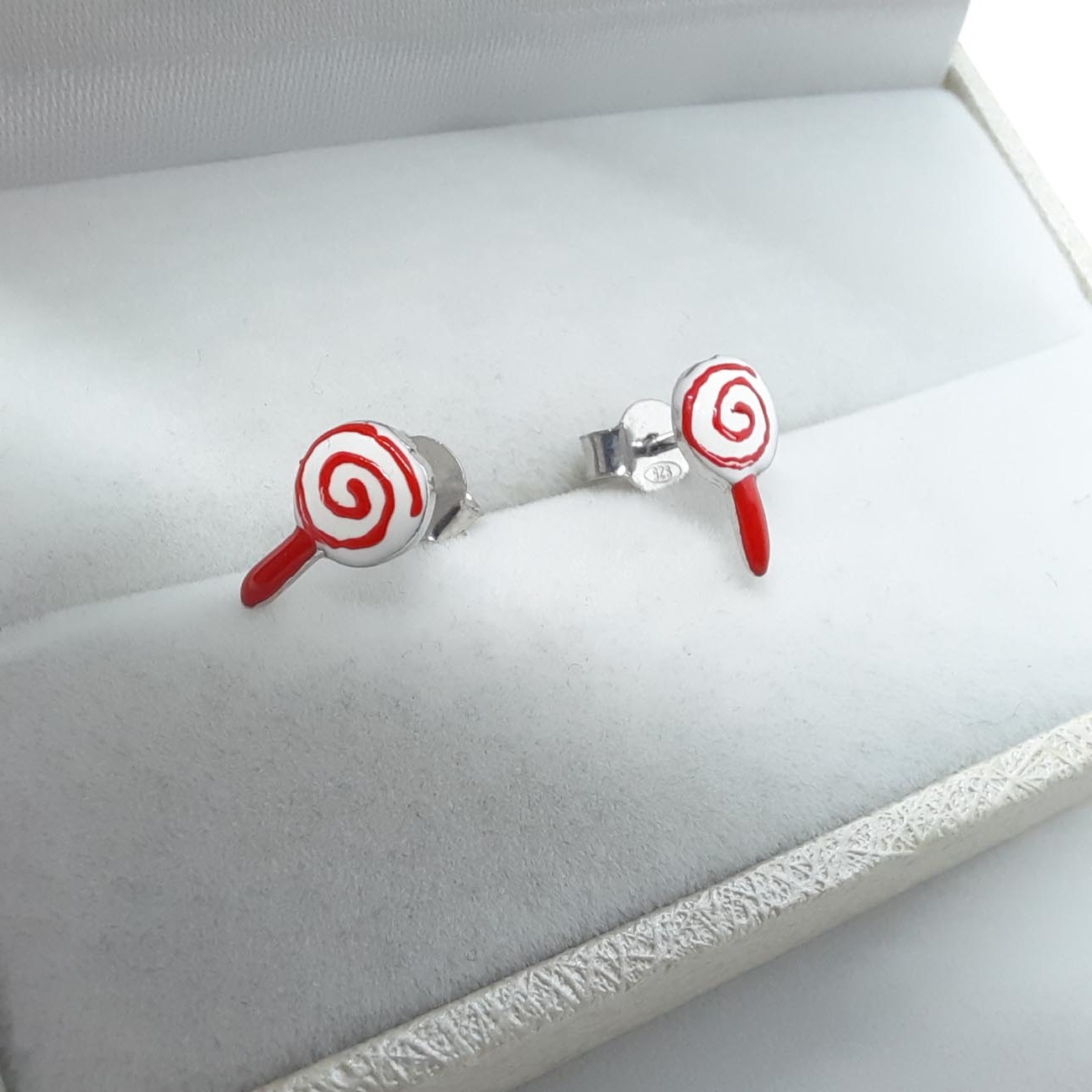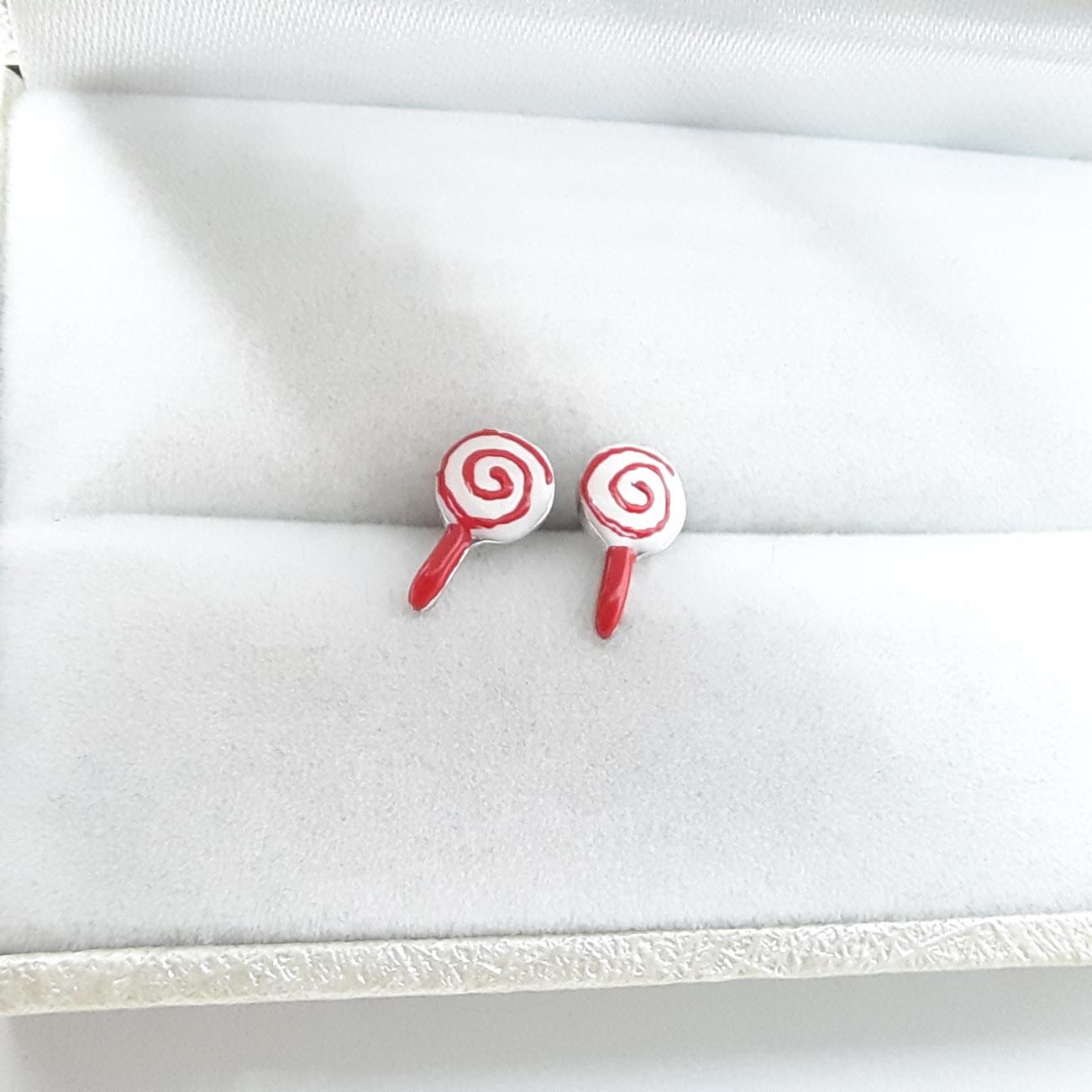 Χαριτωμένα γλειφιντζούρια σκουλαρίκια από ασήμι με σμάλτο κόκκινο και άσπρο, πολύ αγαπητό design στις μικρές ηλικίες.