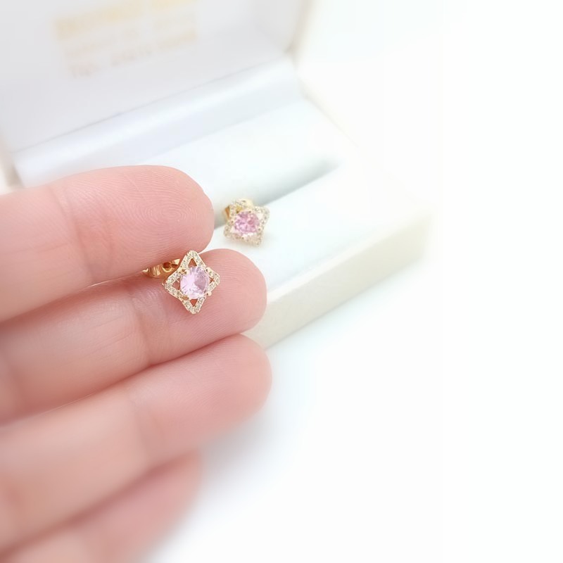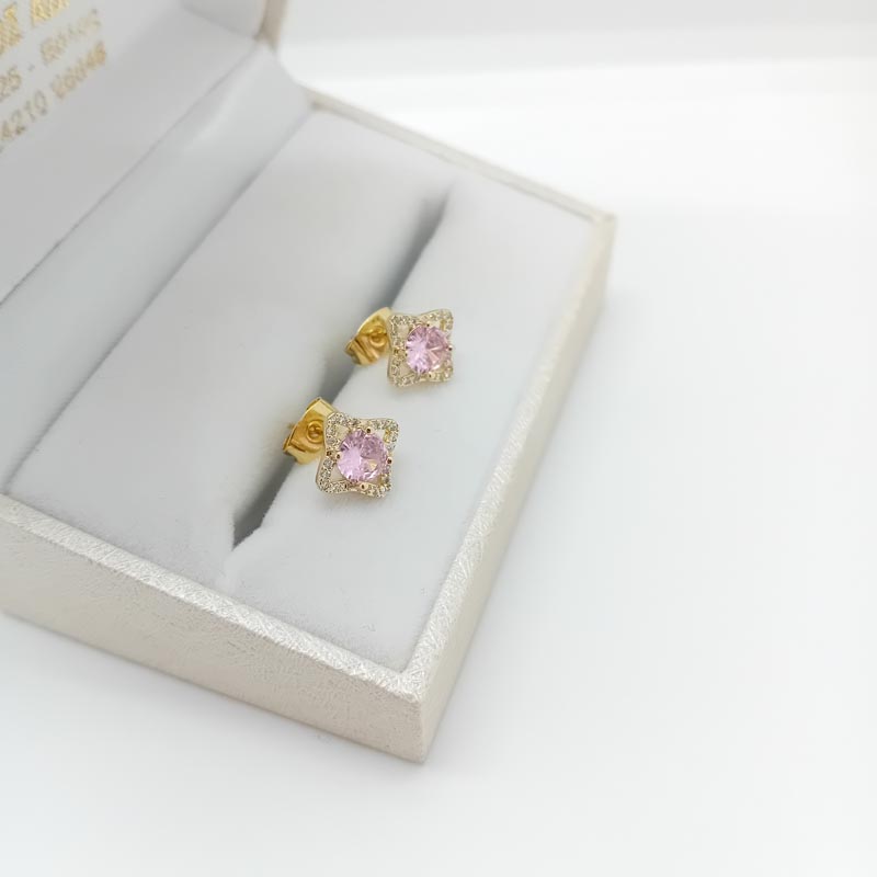 Ανεξαρτήτως ηλικίας αυτό το σετ σκουλαρίκια θα το αγαπήσετε ! Σε σχήμα ρόμβου και σε βολικό μέγεθος, από επιχρυσωμένο ασήμι, με ένα μεγάλο κεντρικό στρογγυλό ζιργκόν σε απόχρωση έντονο ροζ και με αφθονία λευκών μικρών ζιργκών τριγύρω.