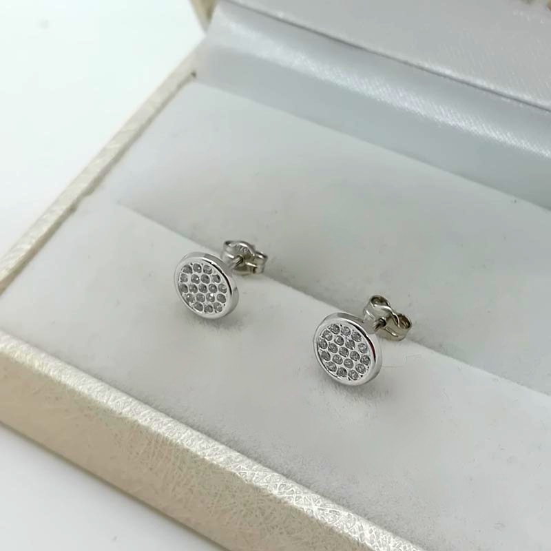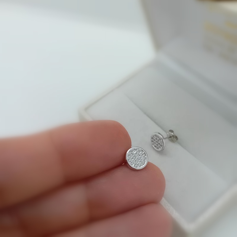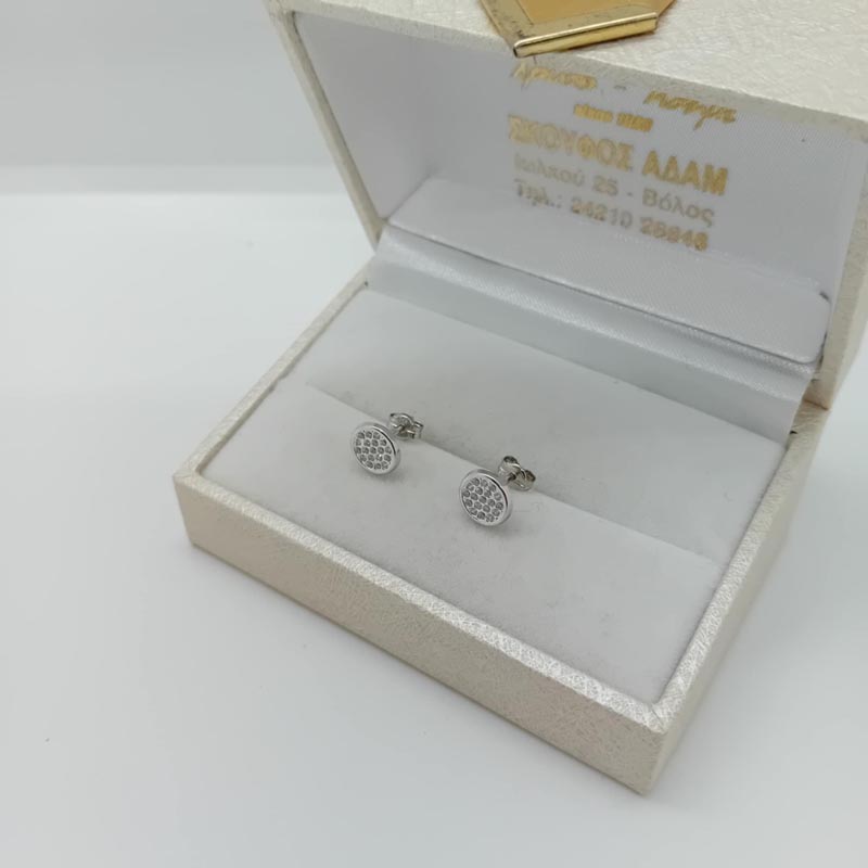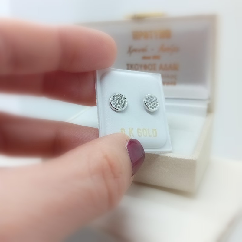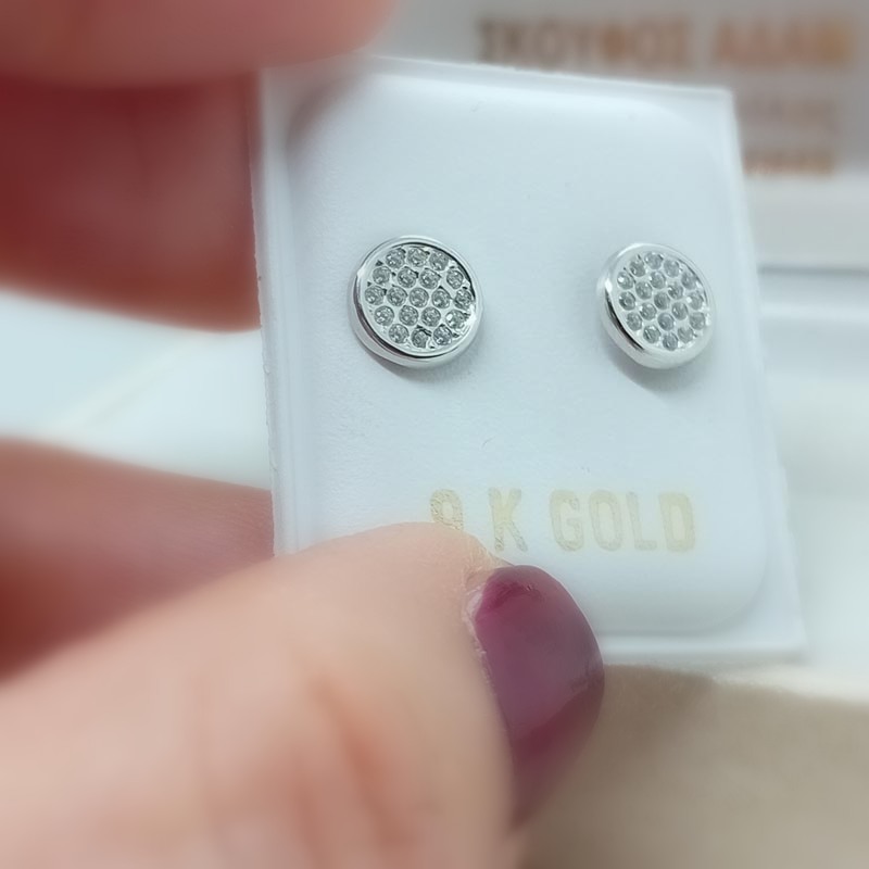 Ταιριαστά σε κάθε ηλικία, ανάλαφρα, αρέσουν στο νεανικό κοινό αλλά και ιδανικά για σοβαρό επαγγελματικό λούκ όπου δεν επιτρέπονται τα έντονα κοσμήματα. Σκουλαρίκια από λευκόχρυσο 9 καρατίων, στρογγυλά δισκάκια με αστραφτερή επιφάνεια γεμάτη από μικρά ζιργκόν.