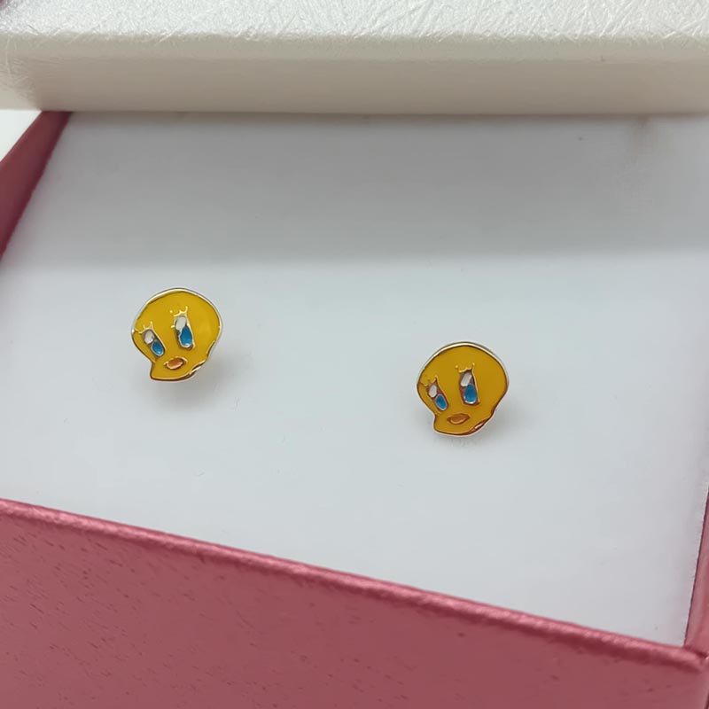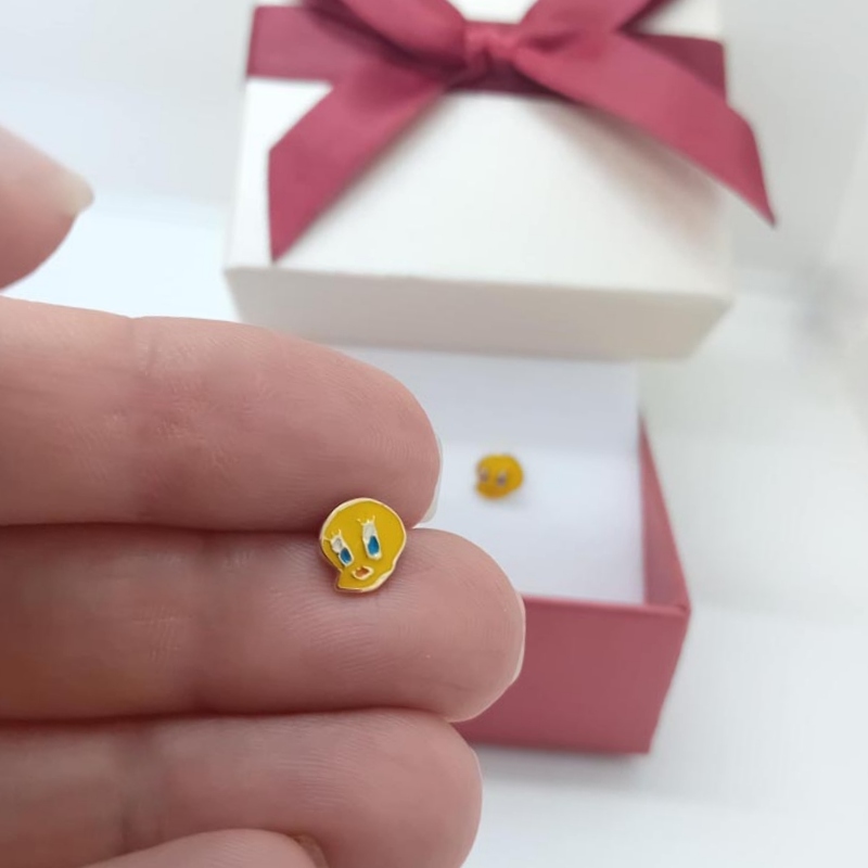 Χρυσά σκουλαρίκια Κ14 με σμάλτο σχέδιο τουίτι