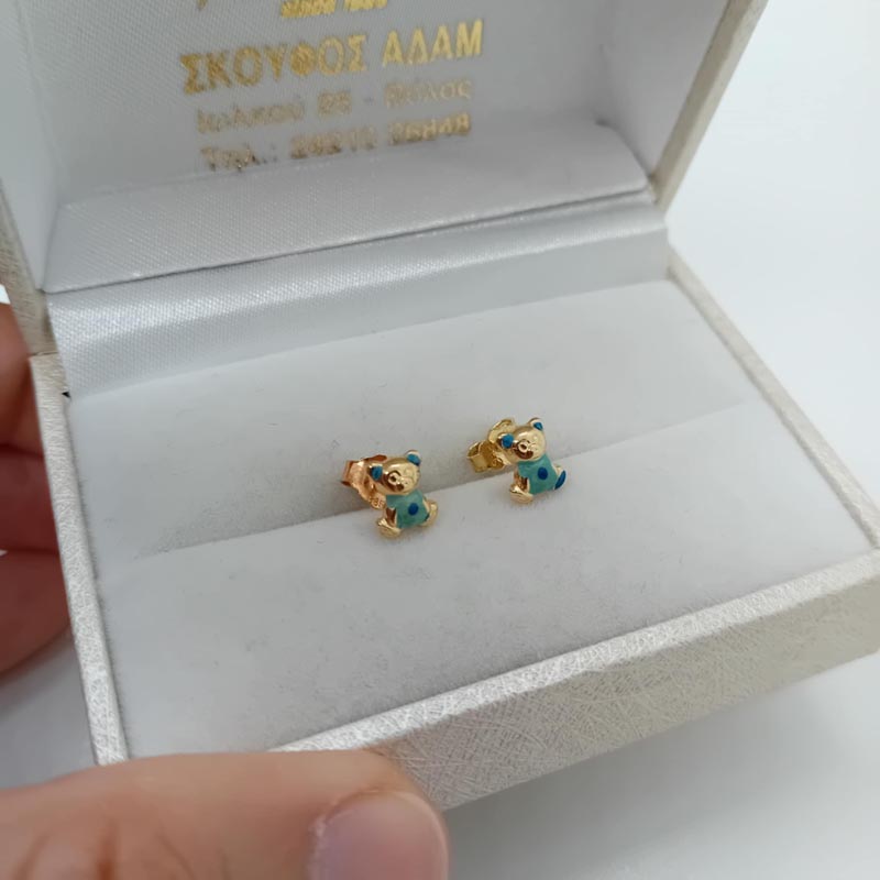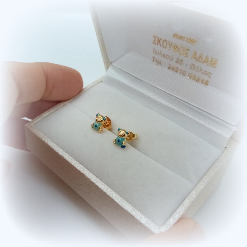 Αρκουδάκι: πρωταγωνιστής στα παιδικά παραμύθια και χουχουλιάρης σύντροφος στον ύπνο αποτελεί ένα από τα πιο αγαπησιάρικα σχέδια στα παιδικά σκουλαρίκια. Ιδιαιτέρως όταν είναι άρτια κατασκευασμένο, από χρυσάφι 14 καρατίων , με λεπτομέρειες σμάλτου σε γαλάζια απόχρωση ώστε να "λειτουργεί" και σαν προστατευτικό "ματάκι" .