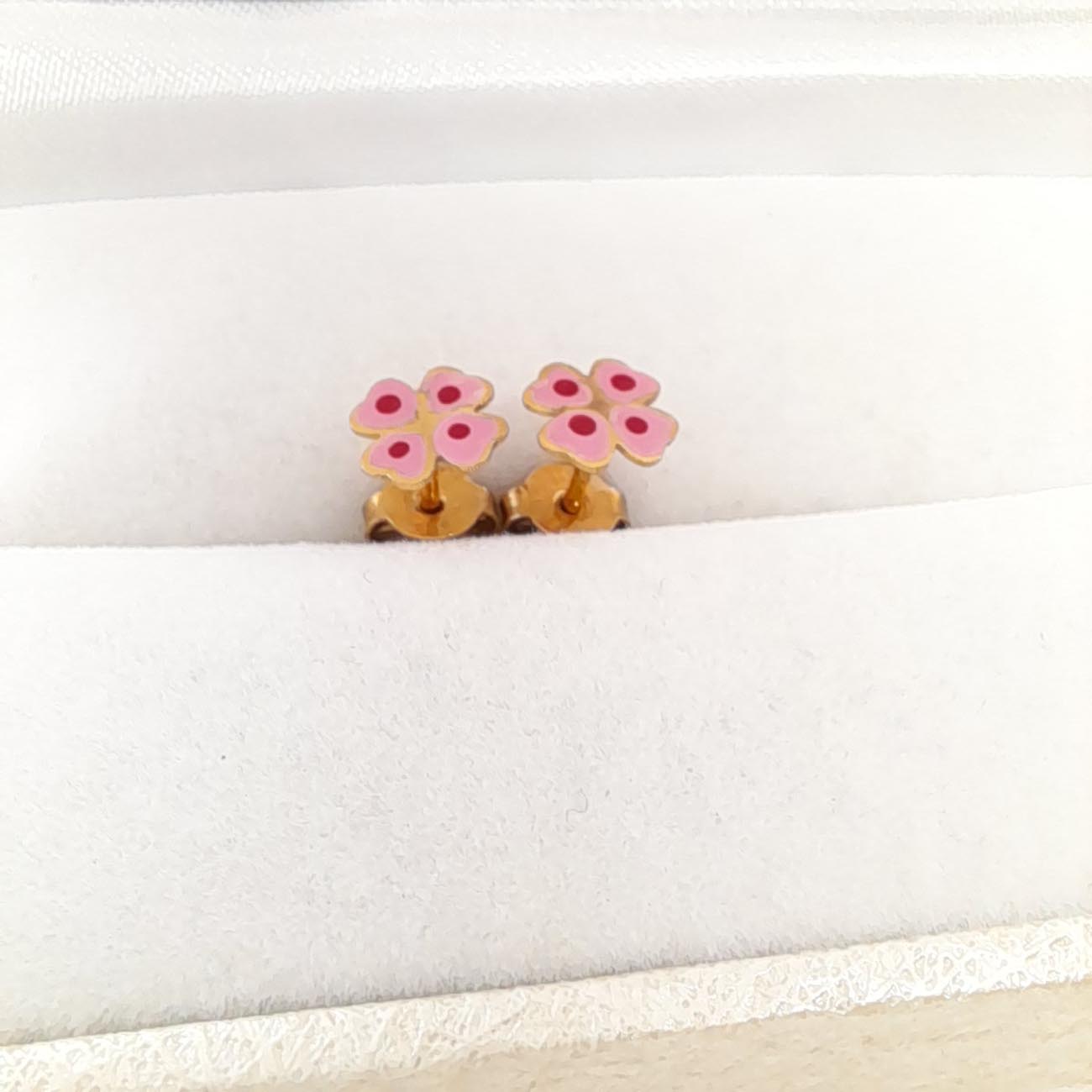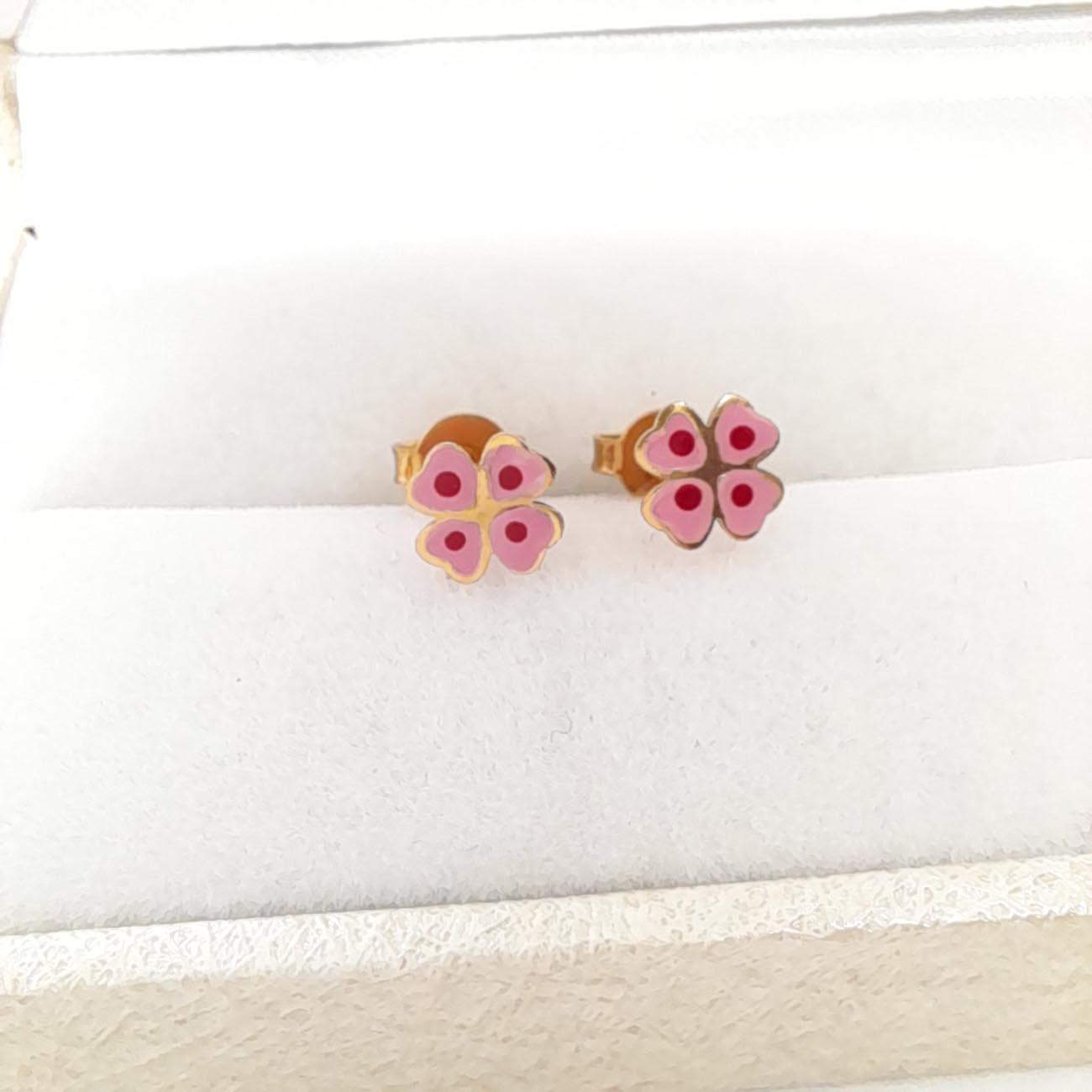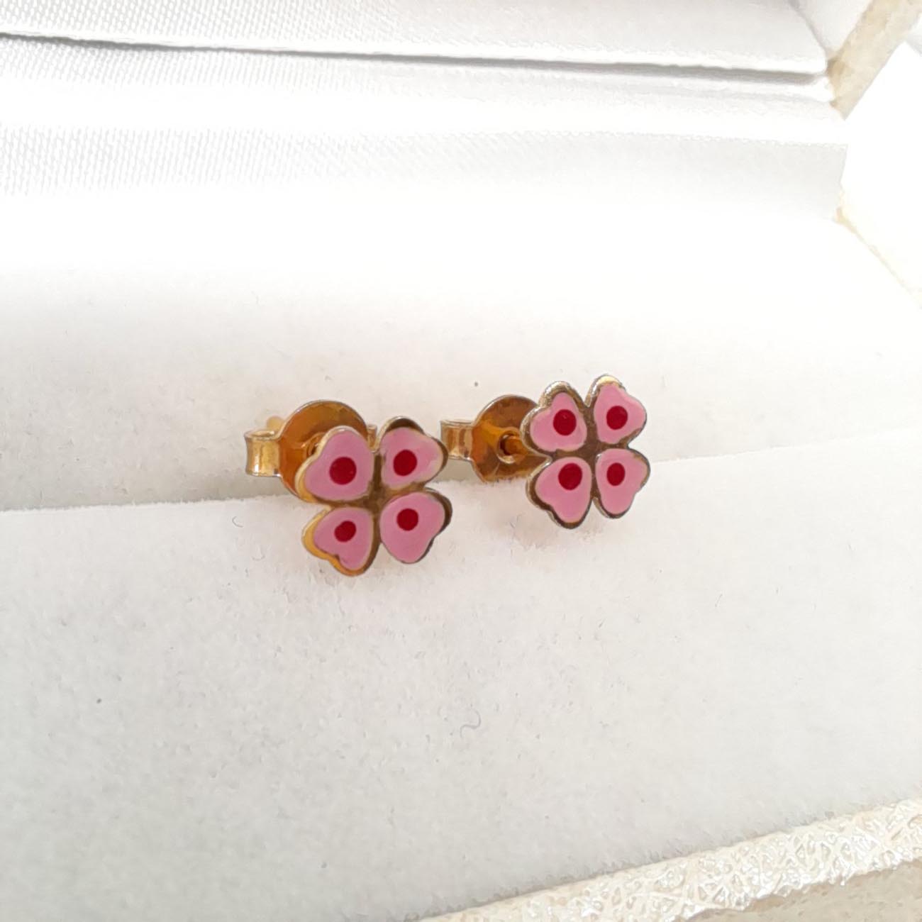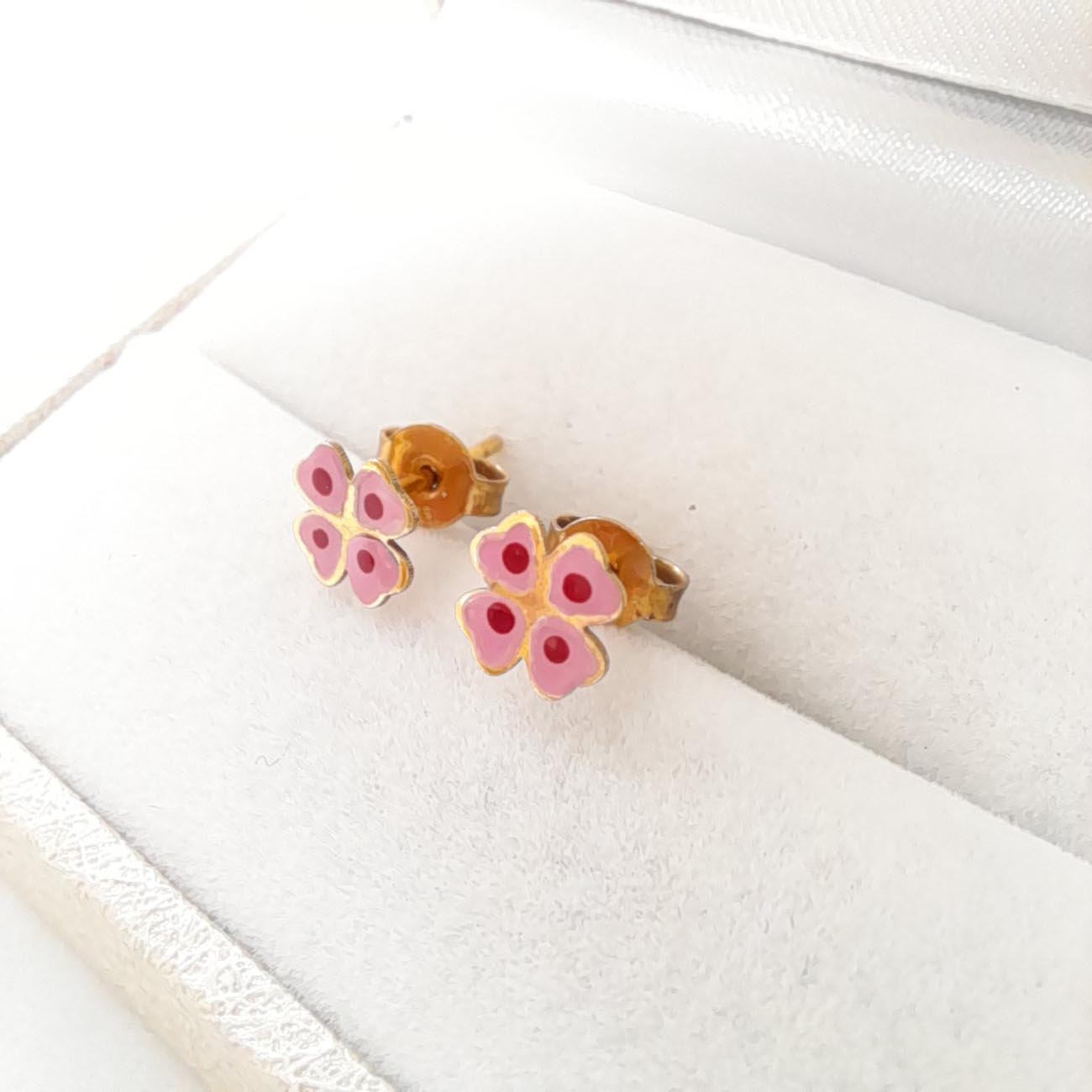 Χρυσά σκουλαρίκια 9 καρατίων, σε σχέδιο άνθους, με ροζ σμάλτο και κόκκινες βούλες, χαριτωμένα και τρυφερά, όπως ακριβώς και οι μικρές που θα τα φορέσουν!