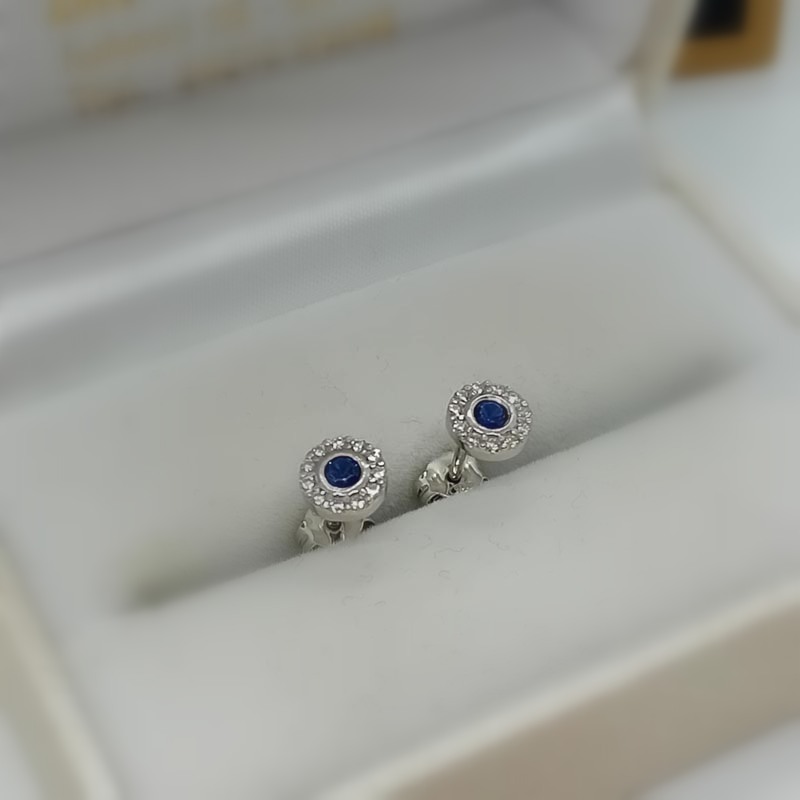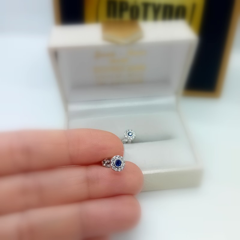 Διακριτικό μέγεθος, κομψή εμφάνιση, κουμπωτά σκουλαρίκια , κυκλικό σχήμα, από ασήμι 925, με κεντρικό σκούρο μπλε ζιργκόν περιστοιχισμένο από μικρά λευκά ζιργκονάκια.