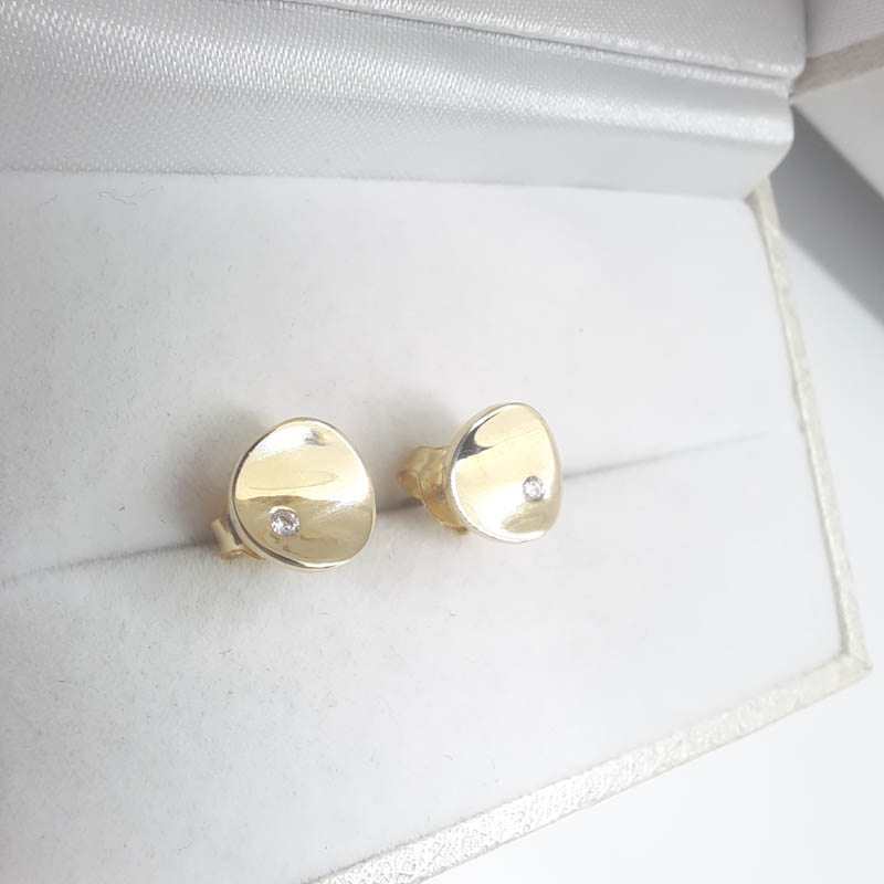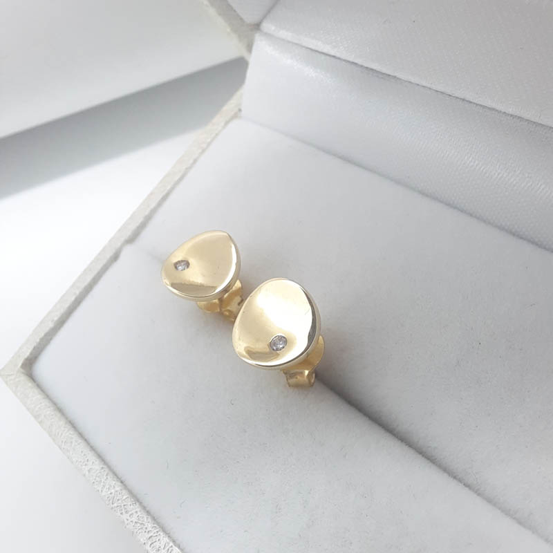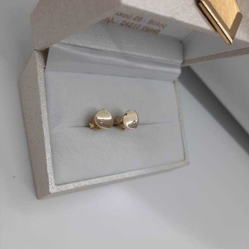 Ιδανικά για διακριτικές και σοβαρές εμφανίσεις σκουλαρίκια πολύτιμα, σε όμορφο κυκλικό design, καμπυλωτή επιφάνεια, με ένα λευκό ζιργκόν, από χρυσό 9 καρατίων.