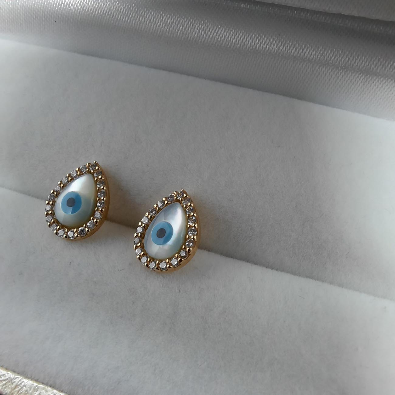 Ένα συναρπαστικό σετ σκουλαρίκια 'ματάκια' από χρυσό Κ9 με αφθονία λευκών ζιργκόν, πολύ μοντέρνο design, ιδανικό δώρο για αγαπημένο πρόσωπο.