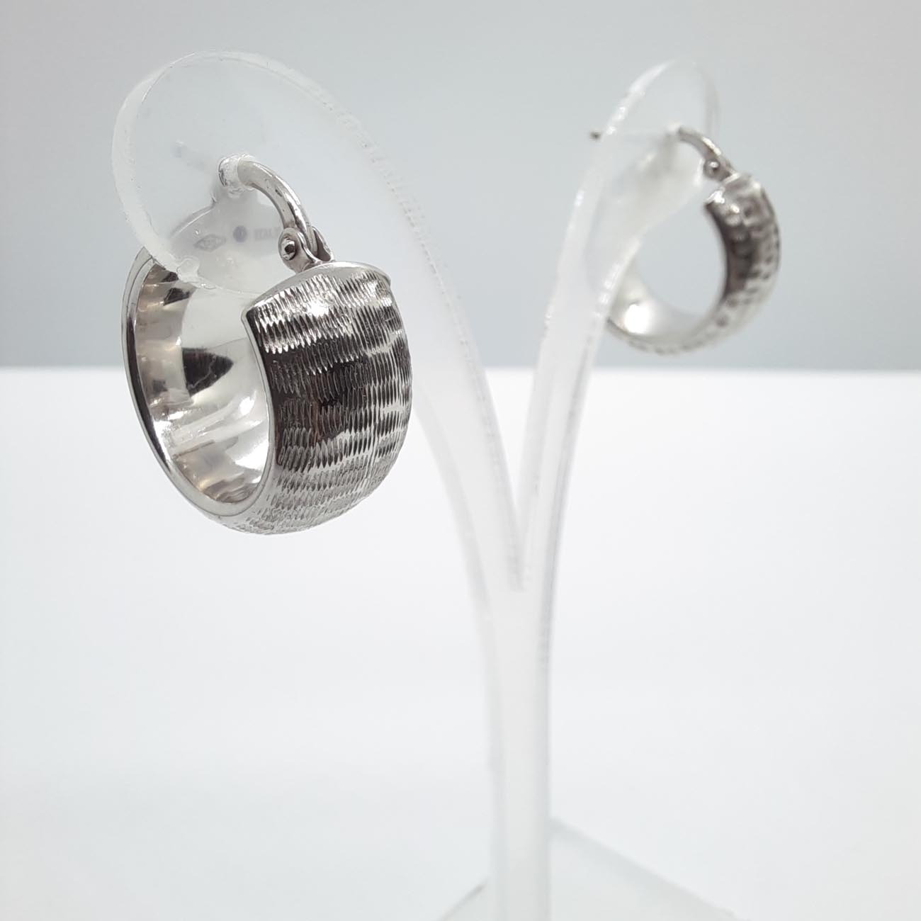 Σκουλαρίκια από λευκόχρυσο 14 καρατίων κρίκοι πολύ ιδιαίτερο design , κομψή χάραξη σε φαρδιά επιφάνεια, ένα διαχρονικό κόσμημα ιδανικό για την φινετσάτη γυναίκα.