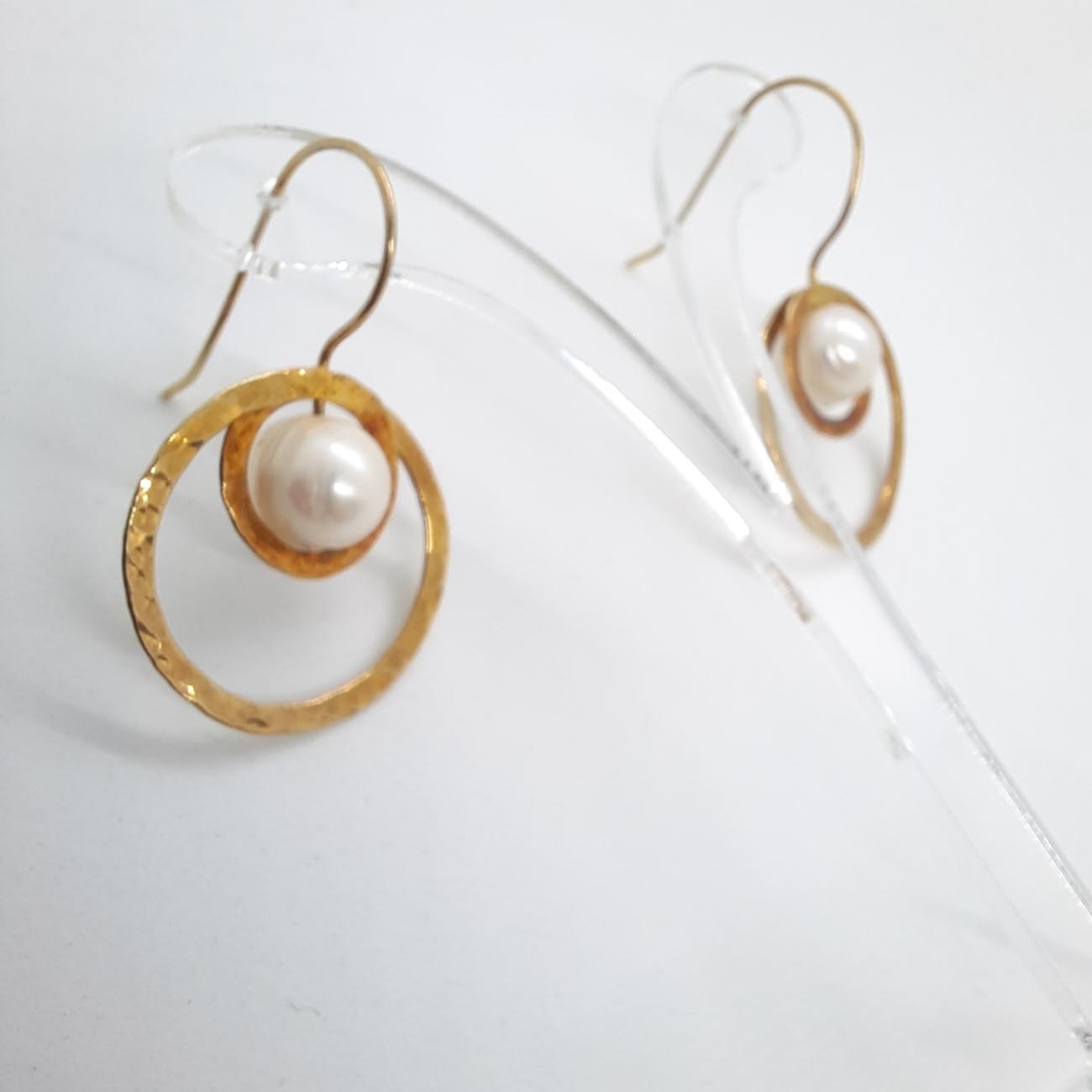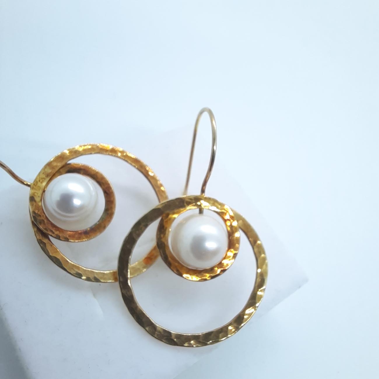 Υπέροχα σκουλαρίκια με εντυπωσιακό minimal κυκλικό design,από επιχρυσωμένο ασήμι με μεγάλη λευκή πέρλα.