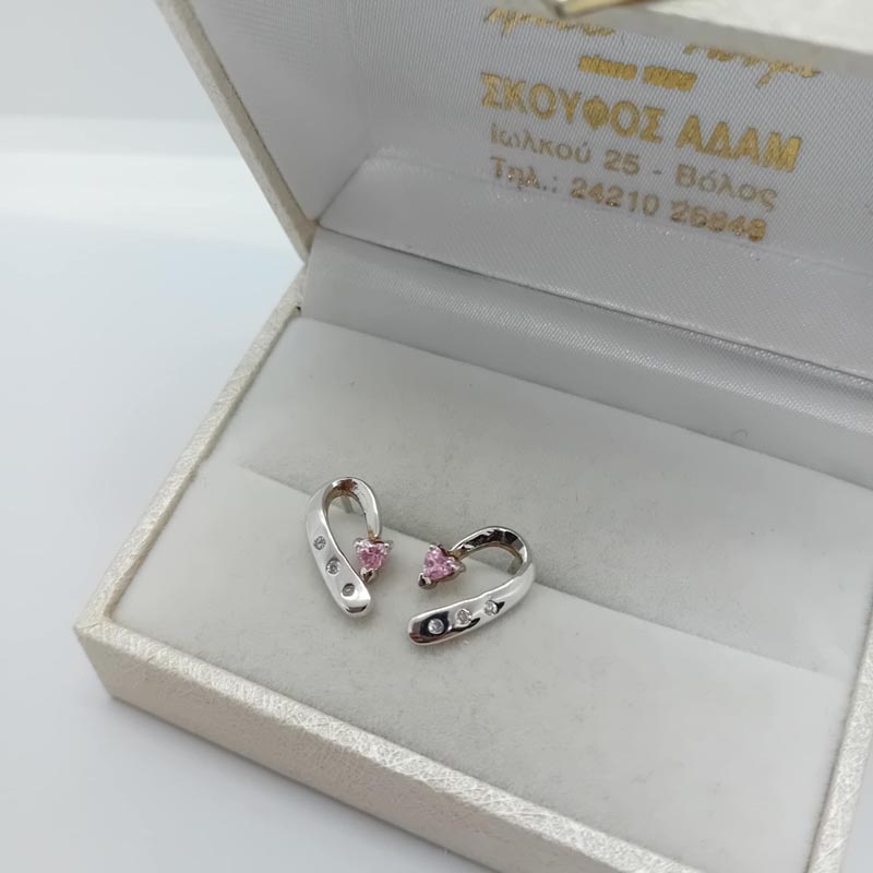 Πολύ κομψό design σκουλαρίκια από ασήμι επιπλατινωμένο, με λευκά διακριτικά ζιργκόν και τριγωνικό ζιργκόν σε ροζ απόχρωση, ιδανικό για την γυναίκα που επιθυμεί να ξεχωρίζει.