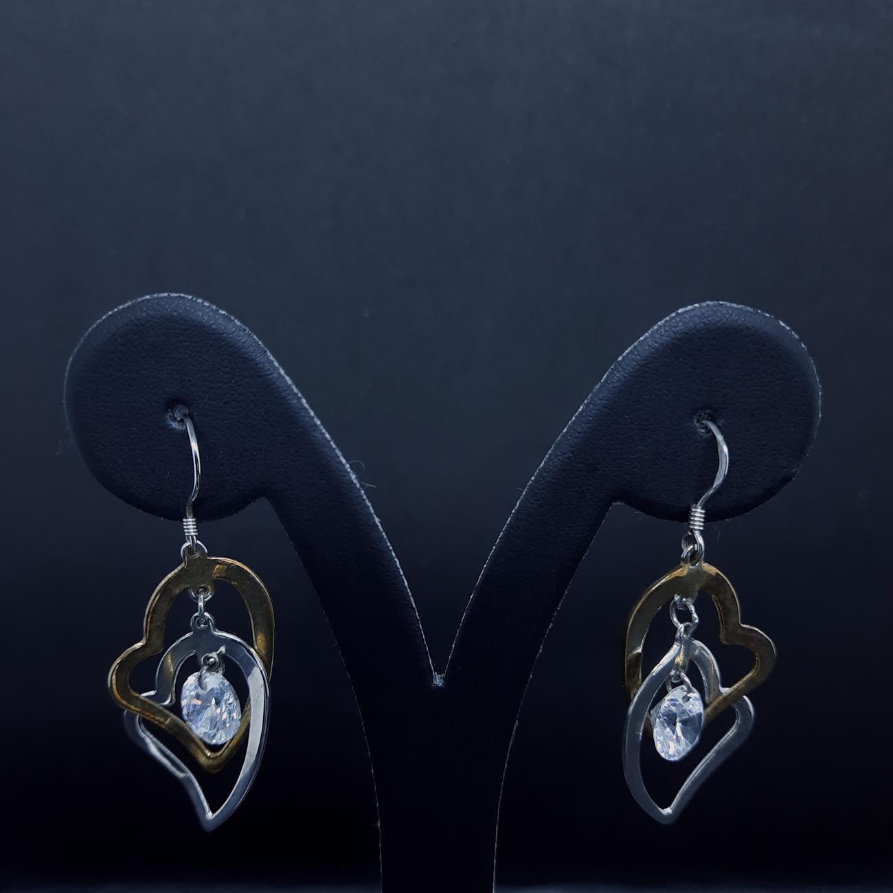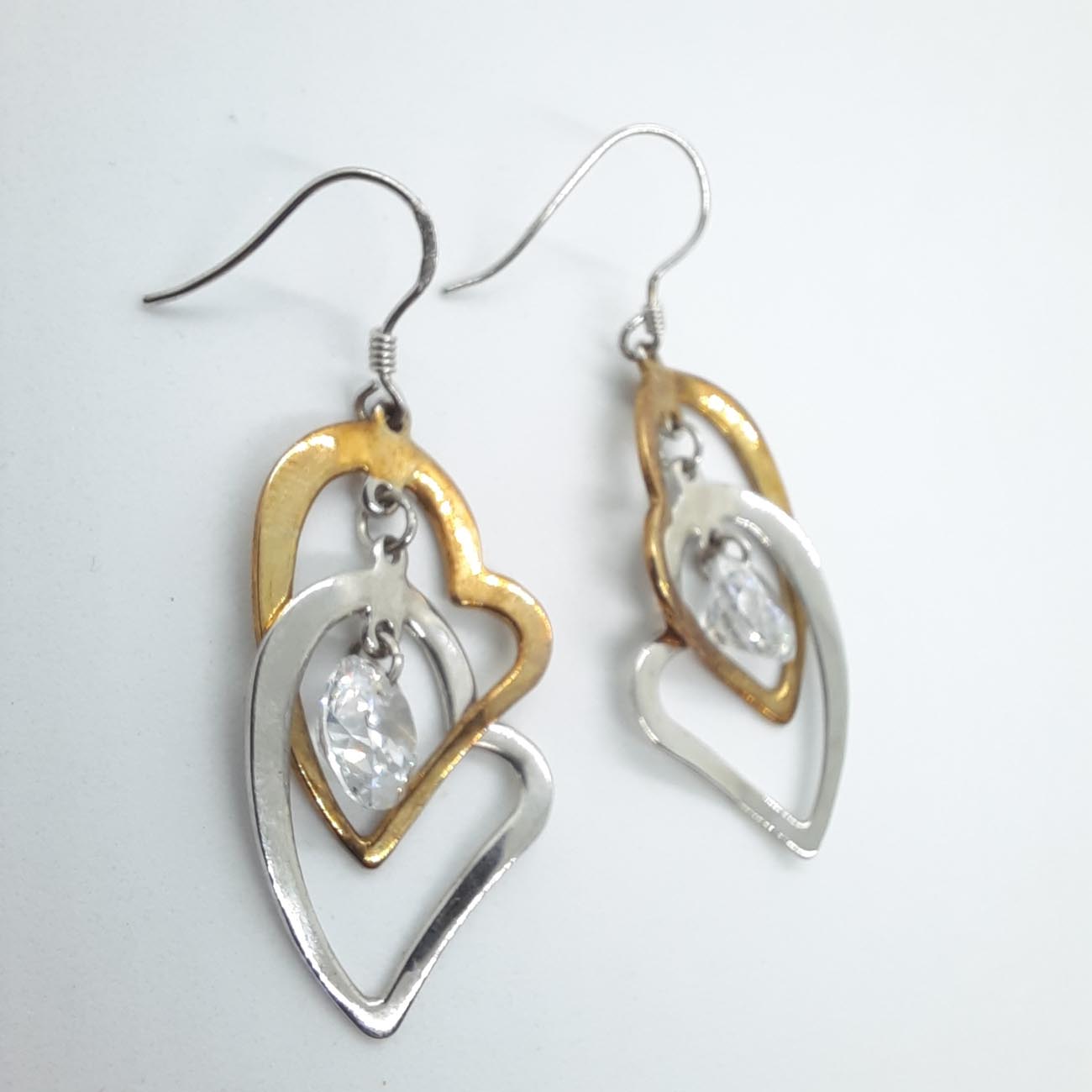 Δυο καρδιές που αγκαλιάζονται , η μια από ασήμι και η δεύτερη από επιχρυσωμένο ασήμι με ένα λευκό αστραφτερό ζιργκόν στο κέντρο τους, ένα κόσμημα για πολύ εντυπωσιακές εμφανίσεις!