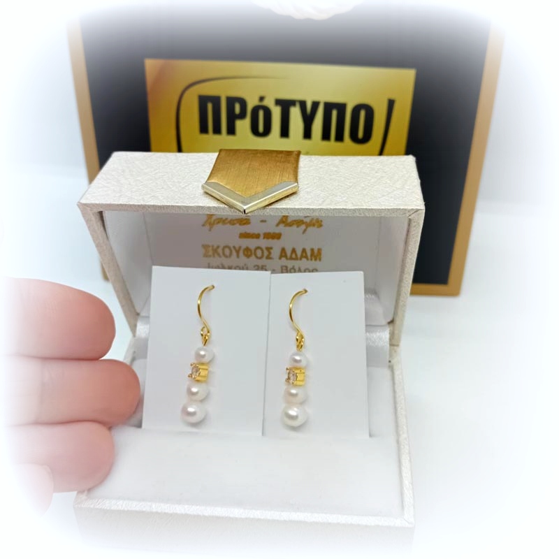 Για βραδυνές εμφανίσεις μακριά σκουλαρίκια από επιχρυσωμένο ασήμι και 3 πέρλες κι 1 τετράγωνο λευκό ζιργκόν.