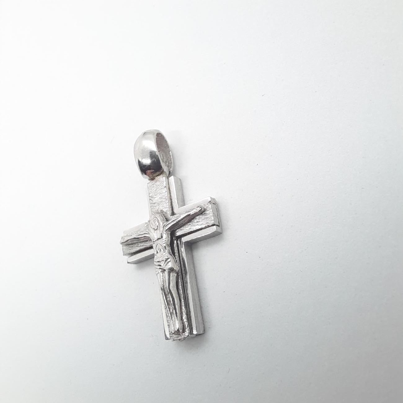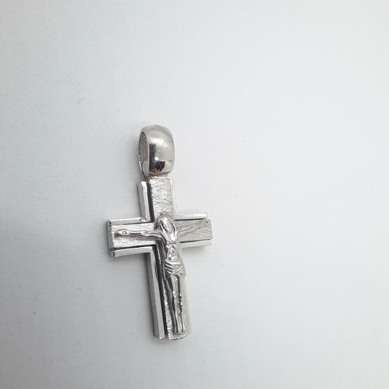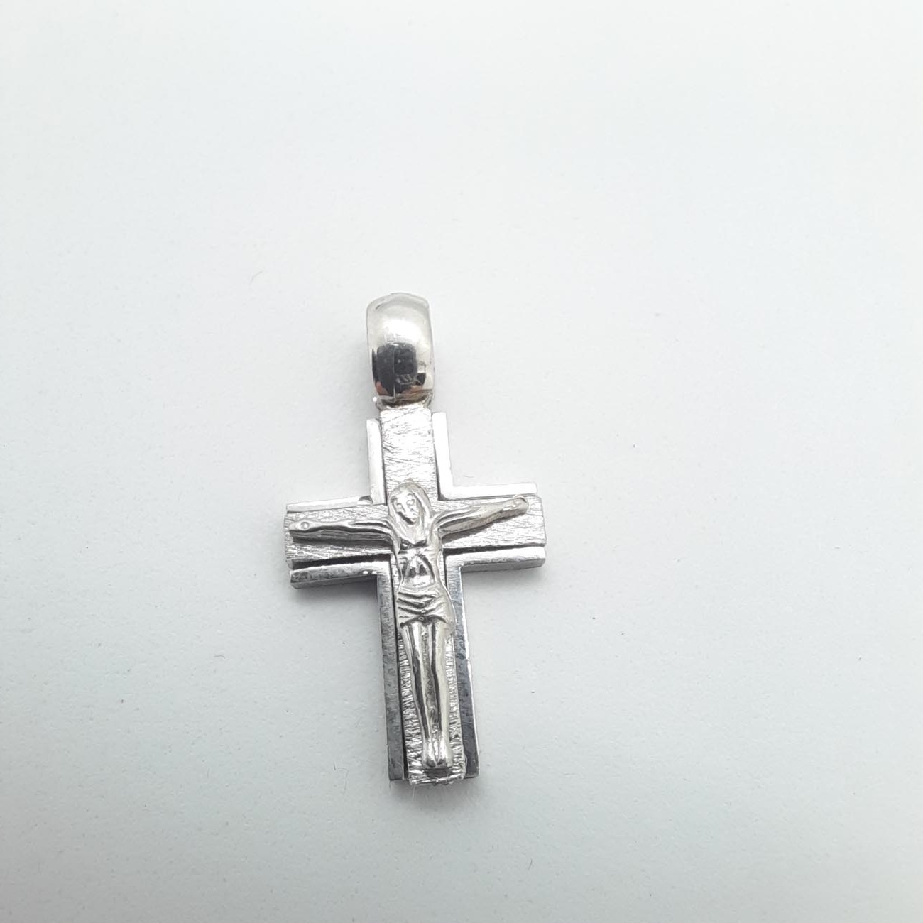 Ασημένιος σταυρός με τον Εσταυρωμένο Ιησού, πολύ προσεγμένες λεπτομέρειες, παιχνίδι ανάμεσα στην ματ και στην λουστρέ όψη, με όμορφη πίσω επιφάνεια.