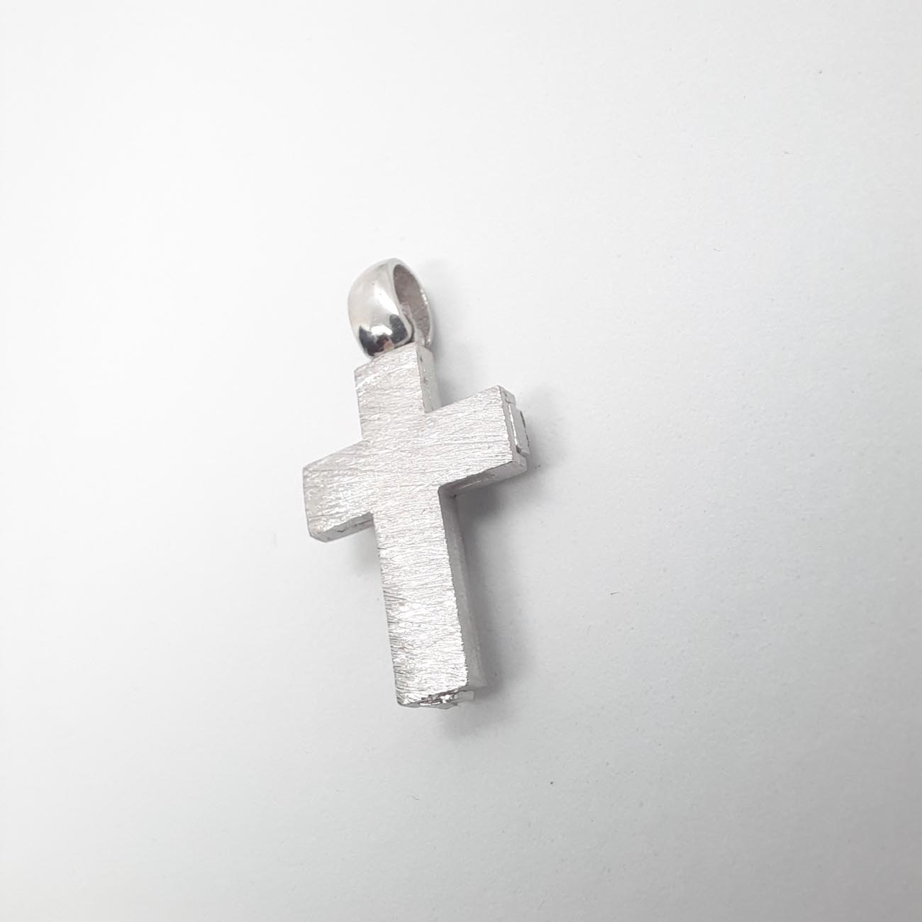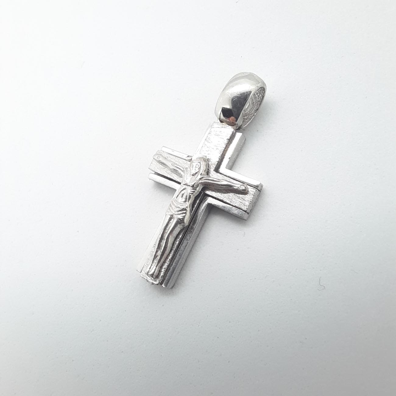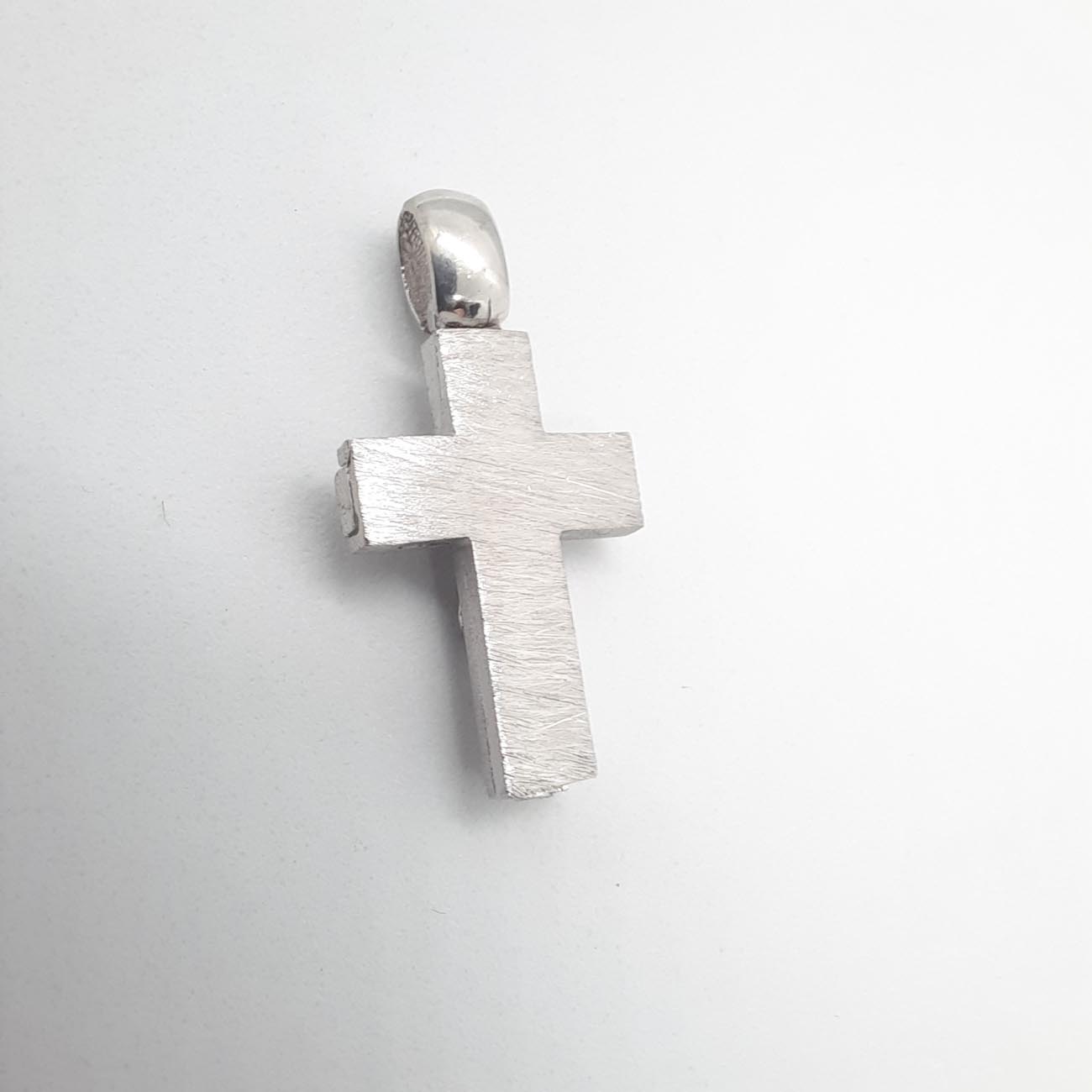Ασημένιος σταυρός με τον Εσταυρωμένο Ιησού, πολύ προσεγμένες λεπτομέρειες, παιχνίδι ανάμεσα στην ματ και στην λουστρέ όψη, με όμορφη πίσω επιφάνεια.