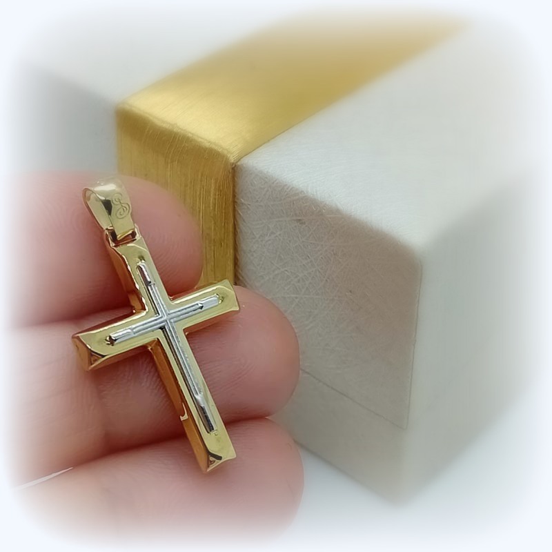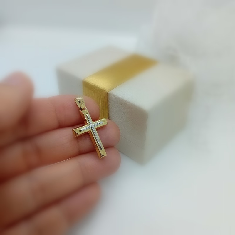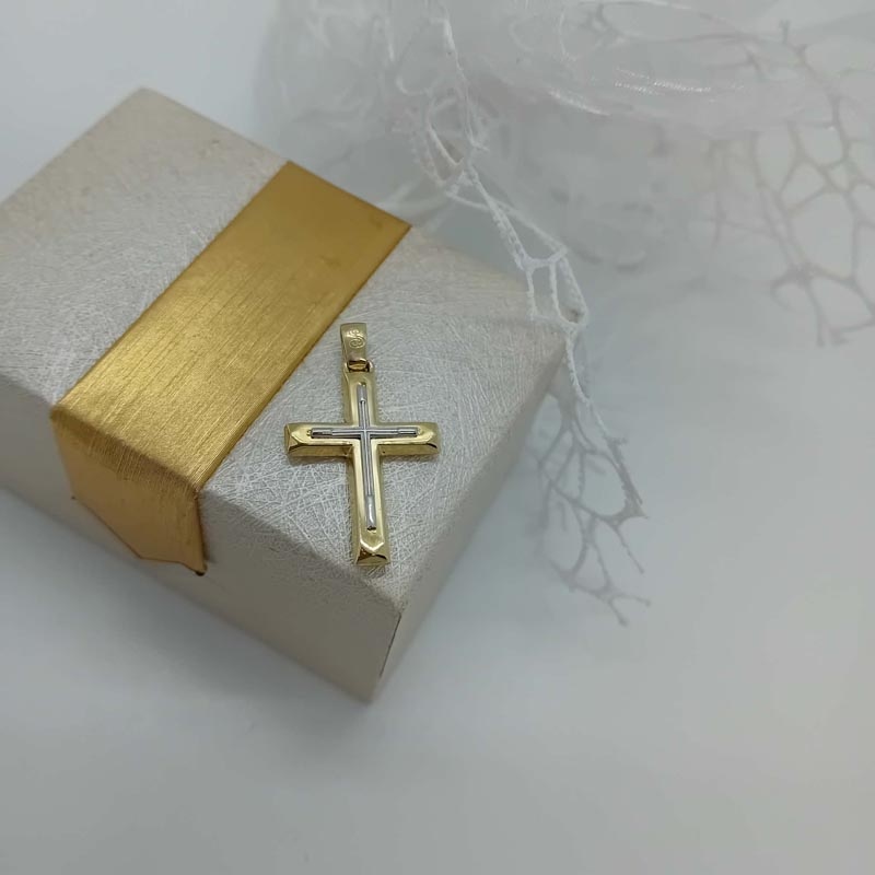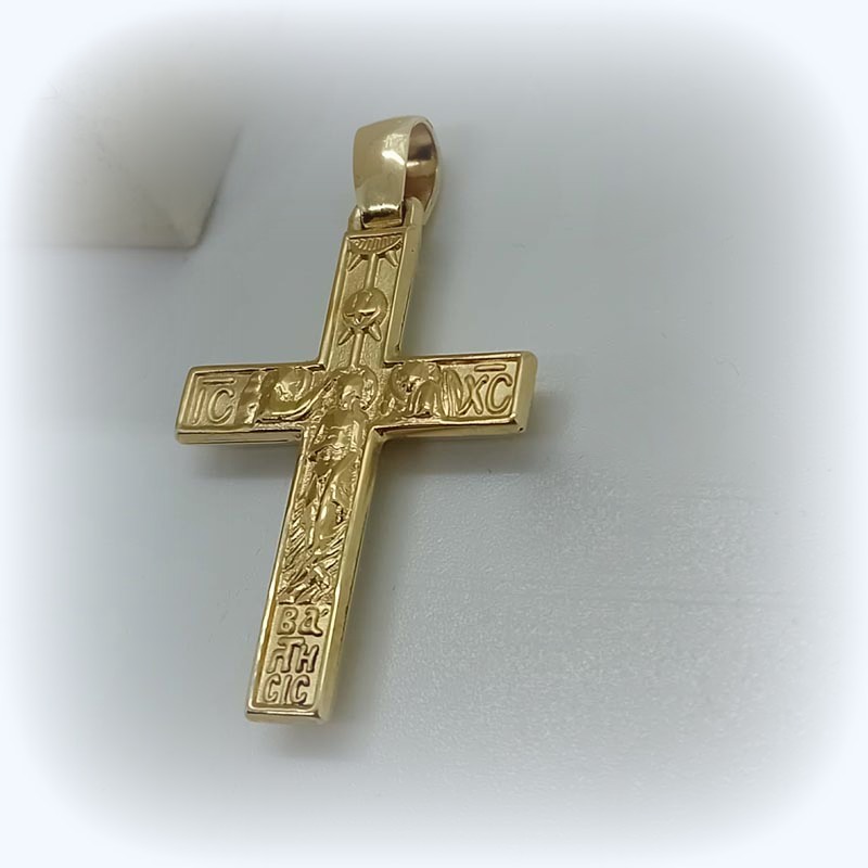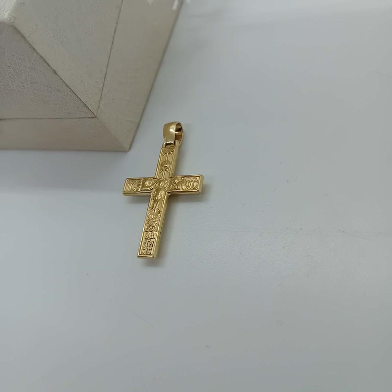 Ιδανικός για βάπτιση αγοριού σταυρός λουστρέ όψης, με ωραία φινιρίσματα, μεγάλο κρικάκι, με έναν ακόμη ανάγλυφο σταυρό στην μπροστινή όψη, στην πίσω όψη υπάρχει ανάγλυφη αναπαράσταση της βάπτισης του ΙΗΣΟΥ ΧΡΙΣΤΟΥ, από χρυσό 9 καρατίων.