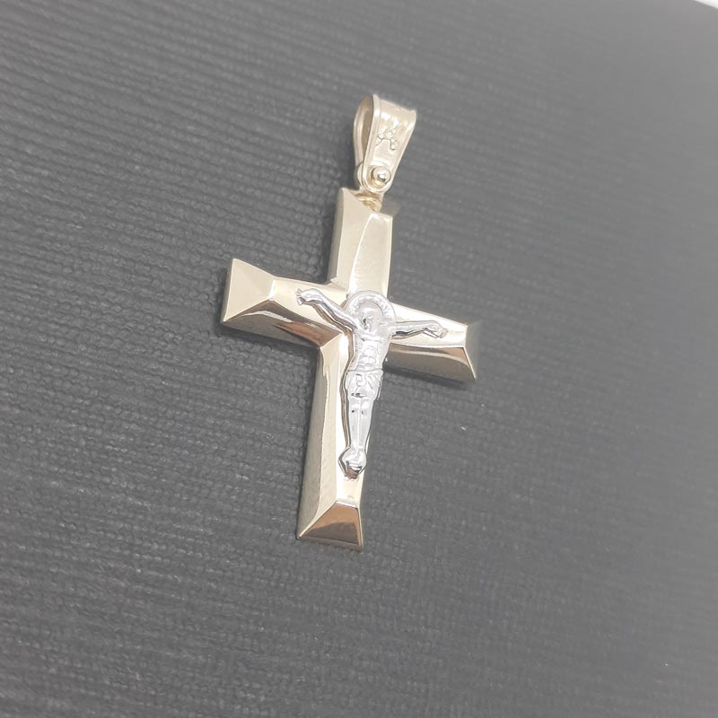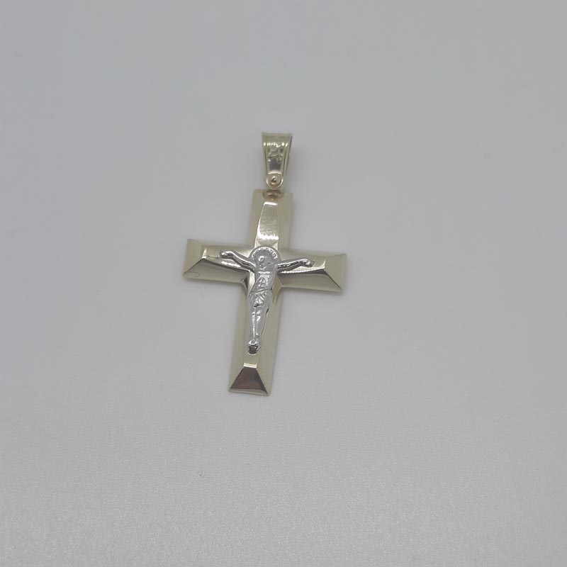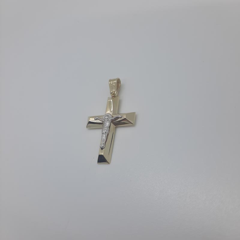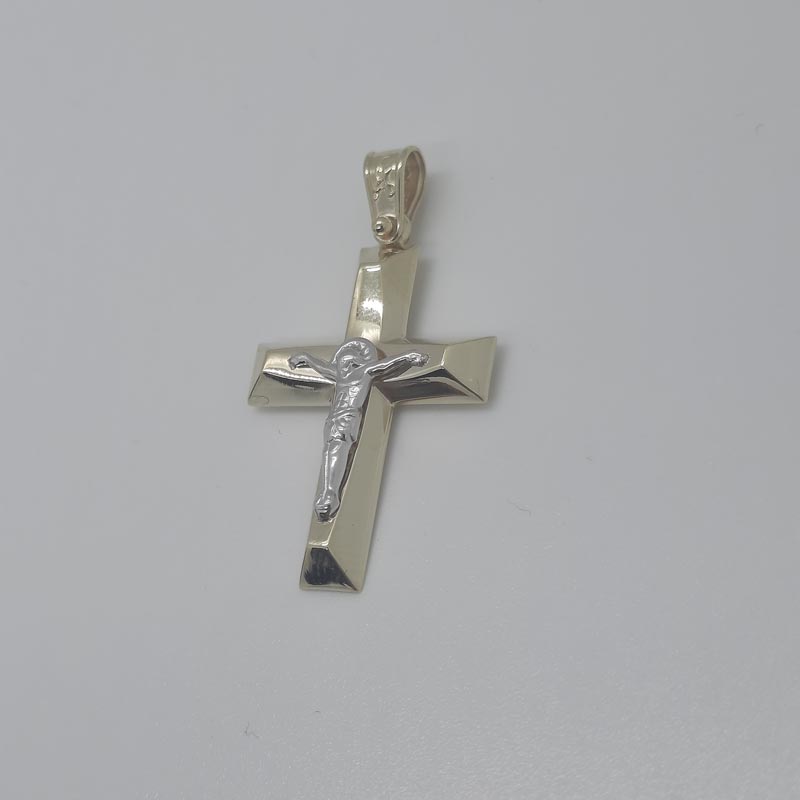 Ιδανικός για βάπτιση ή για δώρο, σοβαρός σταυρός σε ωραία φαρδιά γραμμή με έντονα κοψίματα στις τέσσερις άκρες του και με ανάγλυφο Εσταυρωμένο Ιησού στο κέντρο του, από χρυσό 9 ΚΑΡΑΤΙΩΝ, σε κίτρινο χρώμα ο σταυρός και λευκόχρυσο ο Ιησούς.