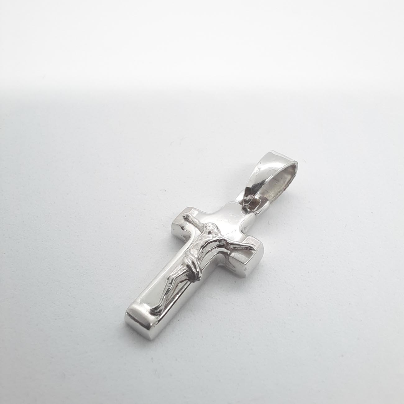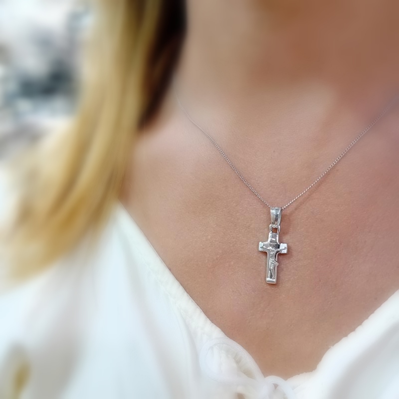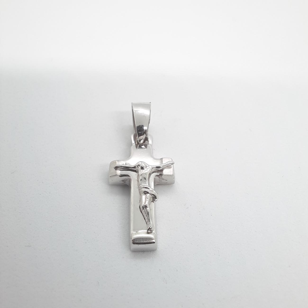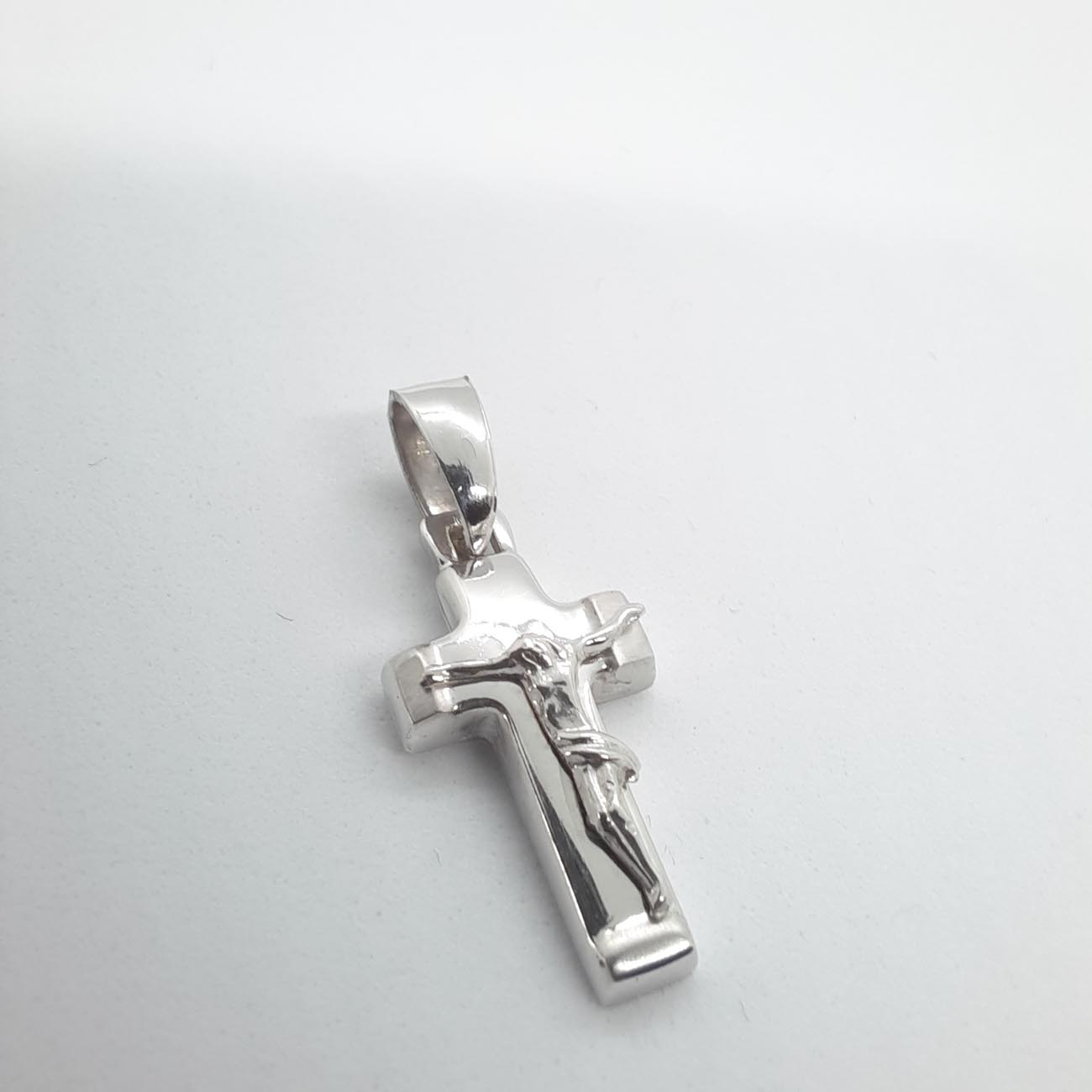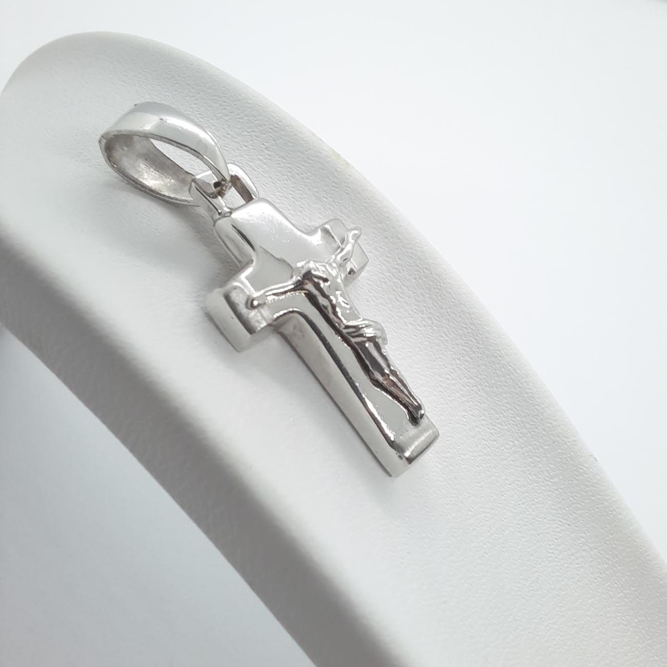 Λευκόχρυσος σταυρός 14 καρατίων, σε διακριτικό μέγεθος, λουστρέ εμφάνιση και έξτρα προσεγμένα φινιρίσματα, με λεπτομερή ανάγλυφο Εσταυρωμένο Ιησού, πολύτιμο κόσμημα για άντρα ή γυναίκα, αλλά ταυτόχρονα ιερό σύμβολο πίστης και αγάπης. (ΠΡΟΣΟΧΗ: ο σταυρός διατίθεται μεμονωμενος και ΔΕΝ ΠΕΡΙΛΑΜΒΑΝΕΙ ΤΗΝ ΑΛΥΣΙΔΑ που χρησιμοποιήθηκε για τις ανάγκες την φωτογράφισης)