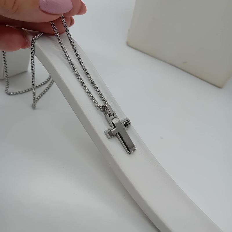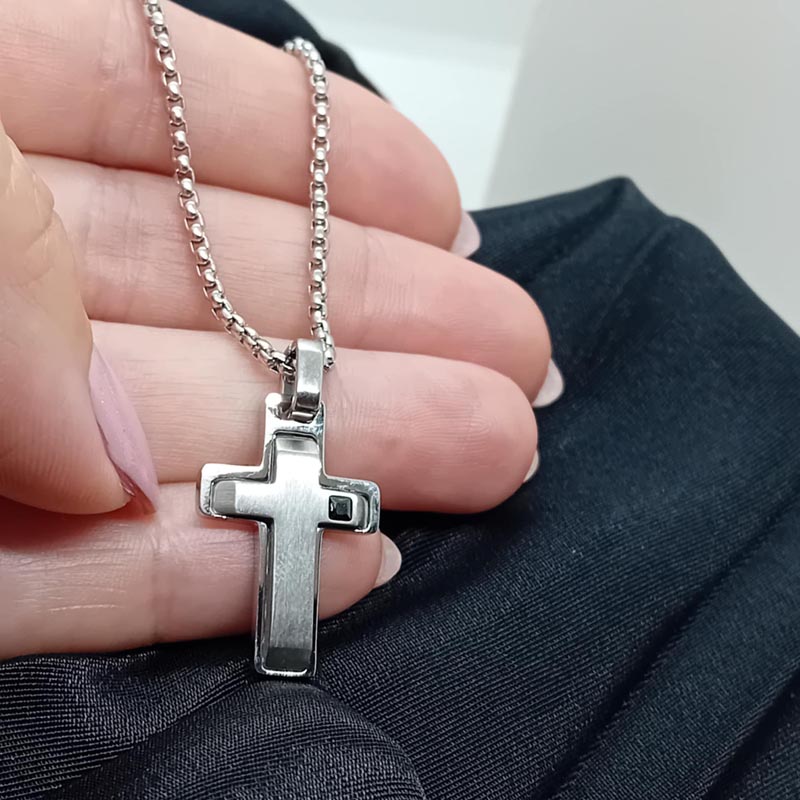 Ένα πολύ ιδιαίτερο design, σταυρός σκούρο ατσάλι λουστρέ με ακόμη έναν σταυρό από ατσάλι ζαγρέ, μεγάλο κρίκο και μικρό μαύρο ζιργκόν στην μια πλευρά. Συνοδεύεται από αλυσίδα με ωραία πυκνή πλέξη.