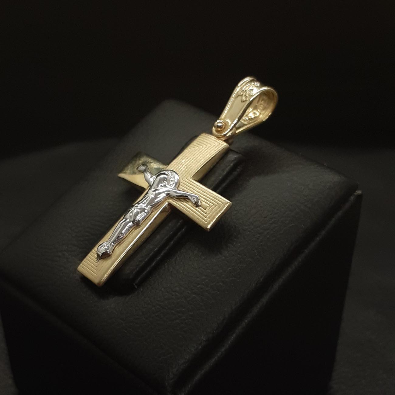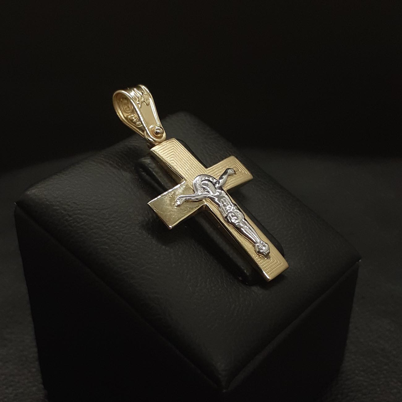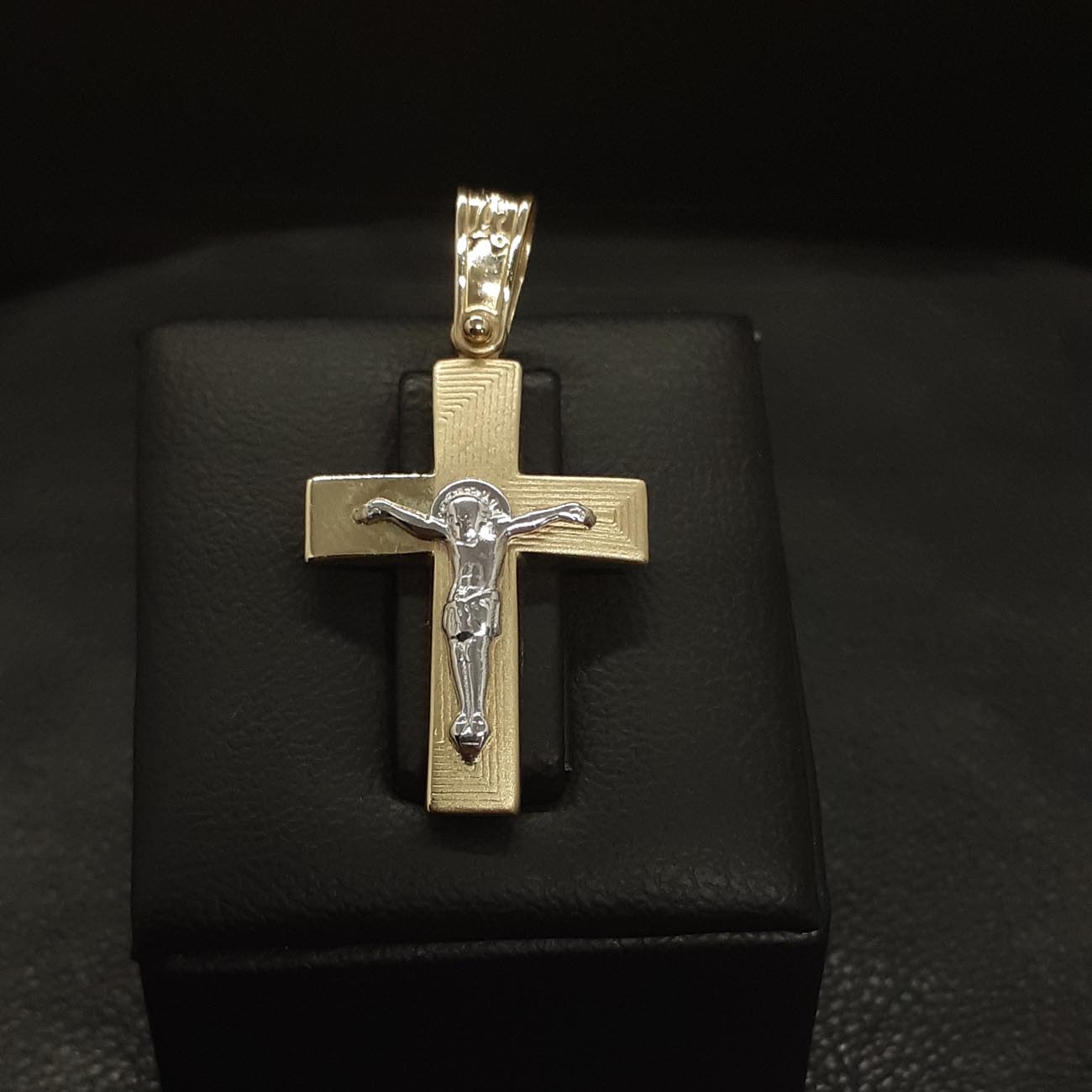 Υπέροχος χρυσός σταυρός 14 καρατίων,συνδυασμός λουστρέ και ζαγρέ επιφάνειας, με ανάγλυφο λευκόχρυσο Εσταυρωμένο Ιησού Χριστό, ένα ιδανικό δώρο αγάπης και πίστης, ιδανικός και για βάπτιση αγοριού και κοριτσιού.
