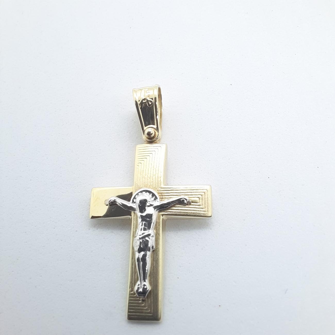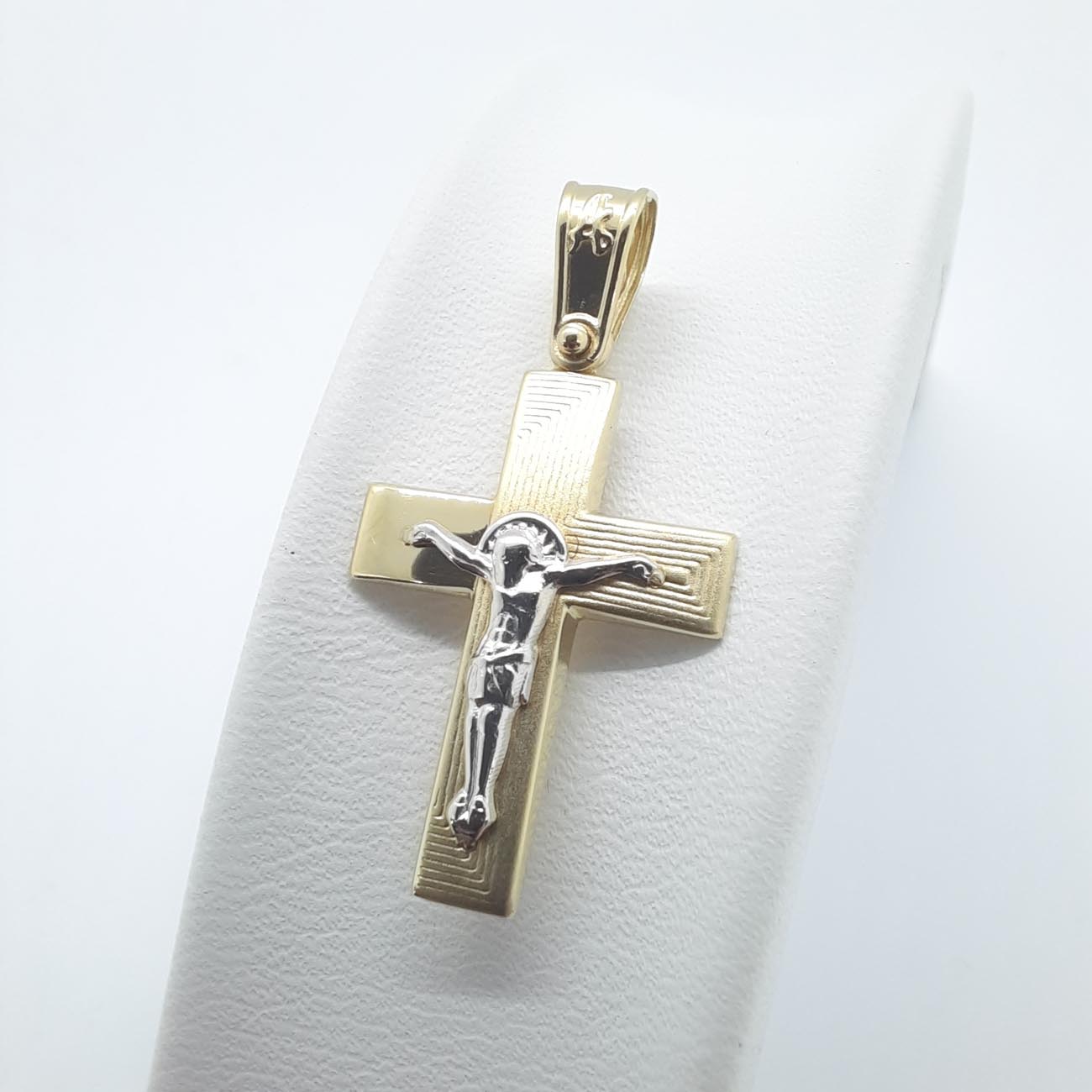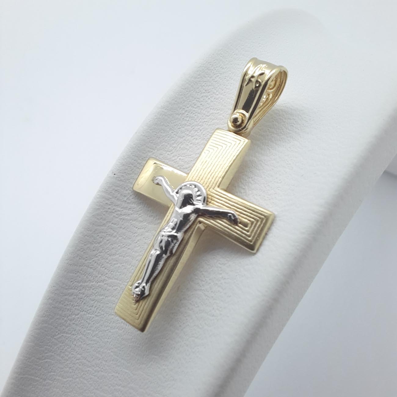 Υπέροχος χρυσός σταυρός 14 καρατίων,συνδυασμός λουστρέ και ζαγρέ επιφάνειας, με ανάγλυφο λευκόχρυσο Εσταυρωμένο Ιησού Χριστό, ένα ιδανικό δώρο αγάπης και πίστης, ιδανικός και για βάπτιση αγοριού και κοριτσιού.
