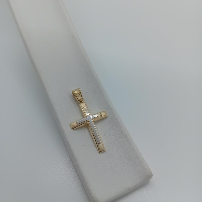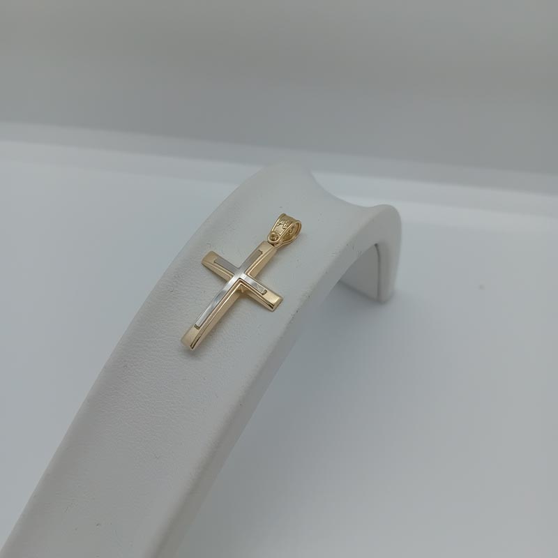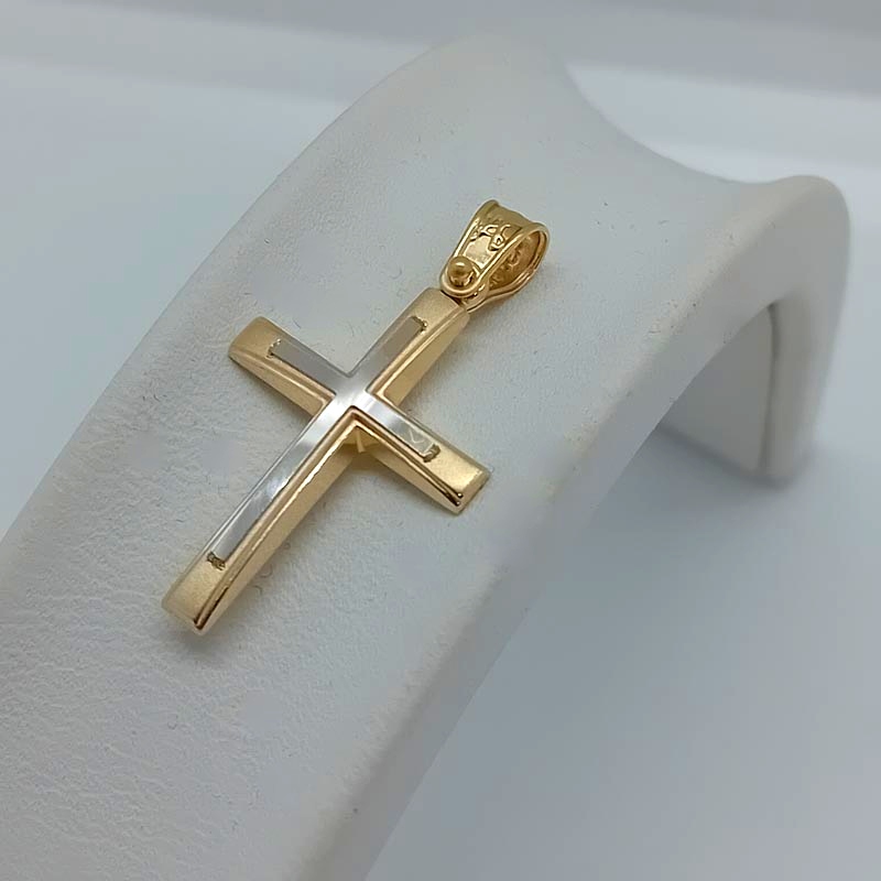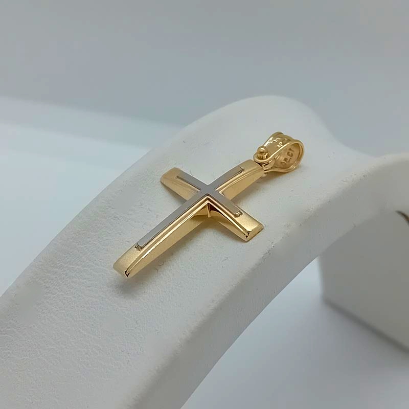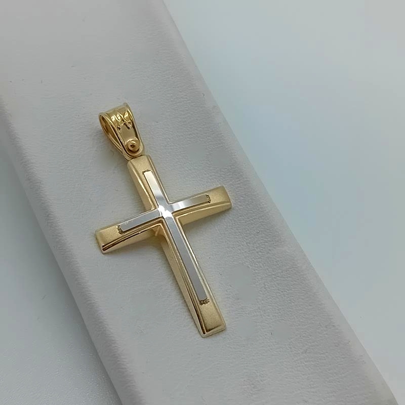 Κομψός διακριτικό και πολύτιμος σταυρός unisex, λεπτό design, με έξτρα σταυρό επάνω στην ματ μπροστινή επιφάνεια και μεγάλο κρικάκι σκαλιστό.