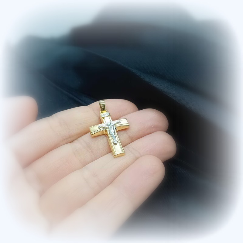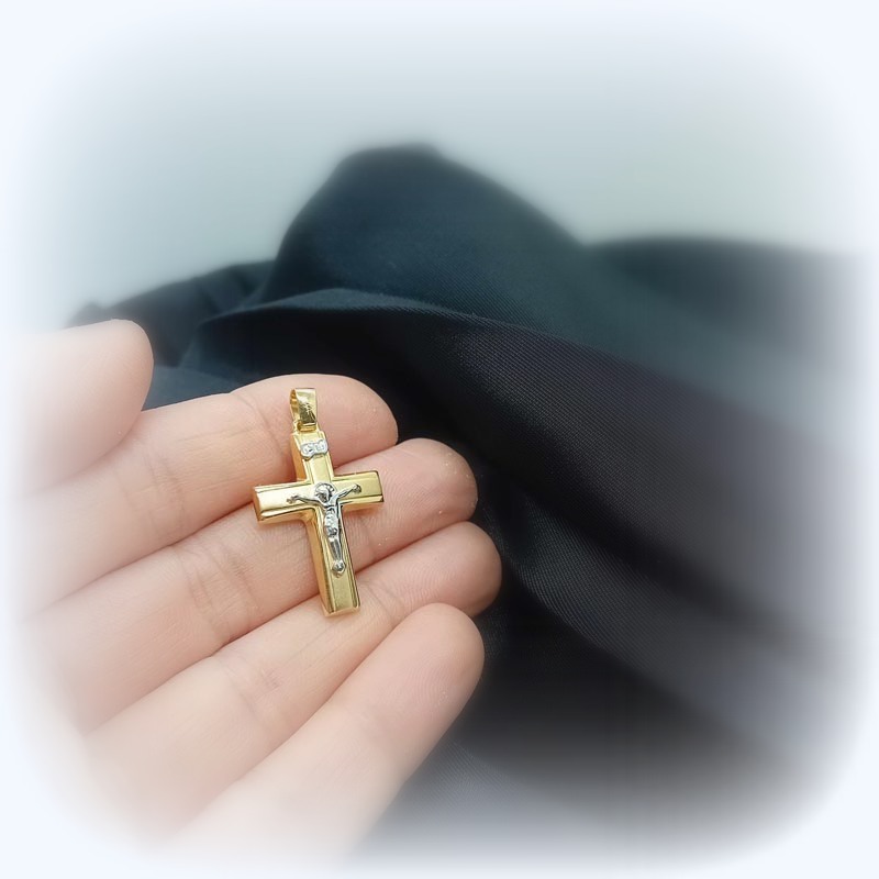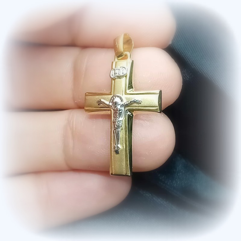 Σοβαρός σταυρός με ανάγλυφο Εσταυρωμένο Ιησού Χριστό, από χρυσό 9 καράτια, ματ όψη, λουστρέ, φοριέται εξίσου όμορφα από γυναίκες και άντρες, ιδανικός για βάπτιση και δώρο.