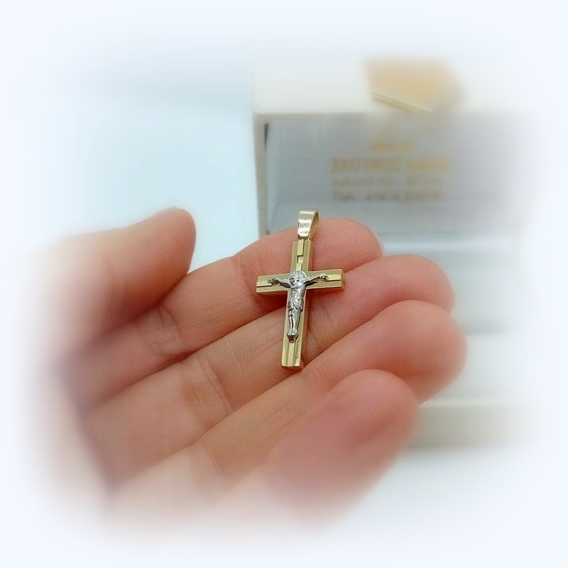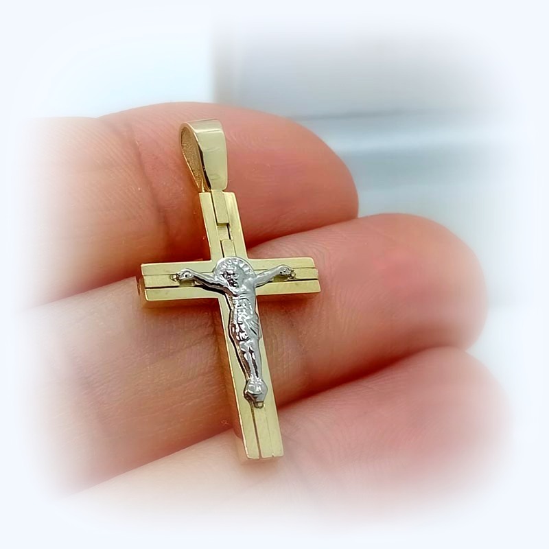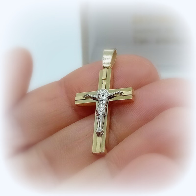 Σύμβολο πίστης και πολύτιμο κόσμημα, σταυρός από χρυσό με λουστρέ επιφάνεια στην οποία υπάρχουν αυλακώσεις ζαγρέ, με ανάγλυφο ΙΗΣΟΥ ,μεγάλο κρίκο και πίσω όψη ζαγρέ επεξεργασία, 9 καράτια.