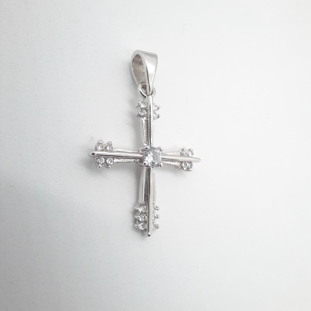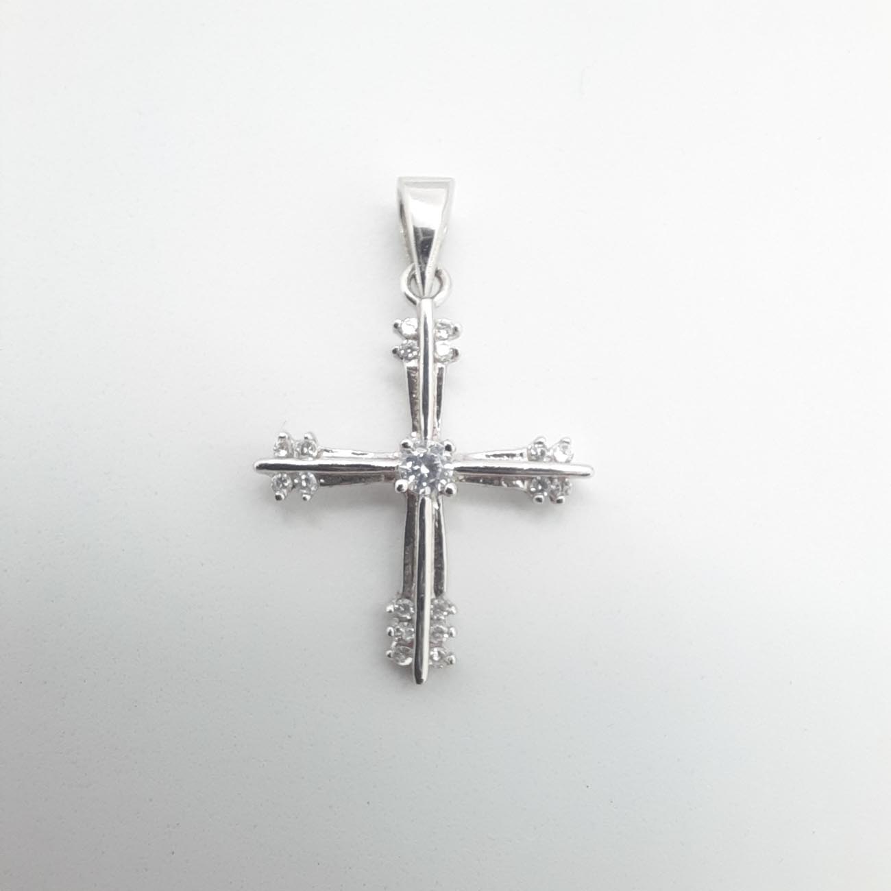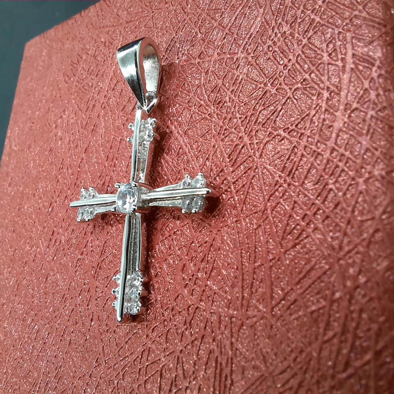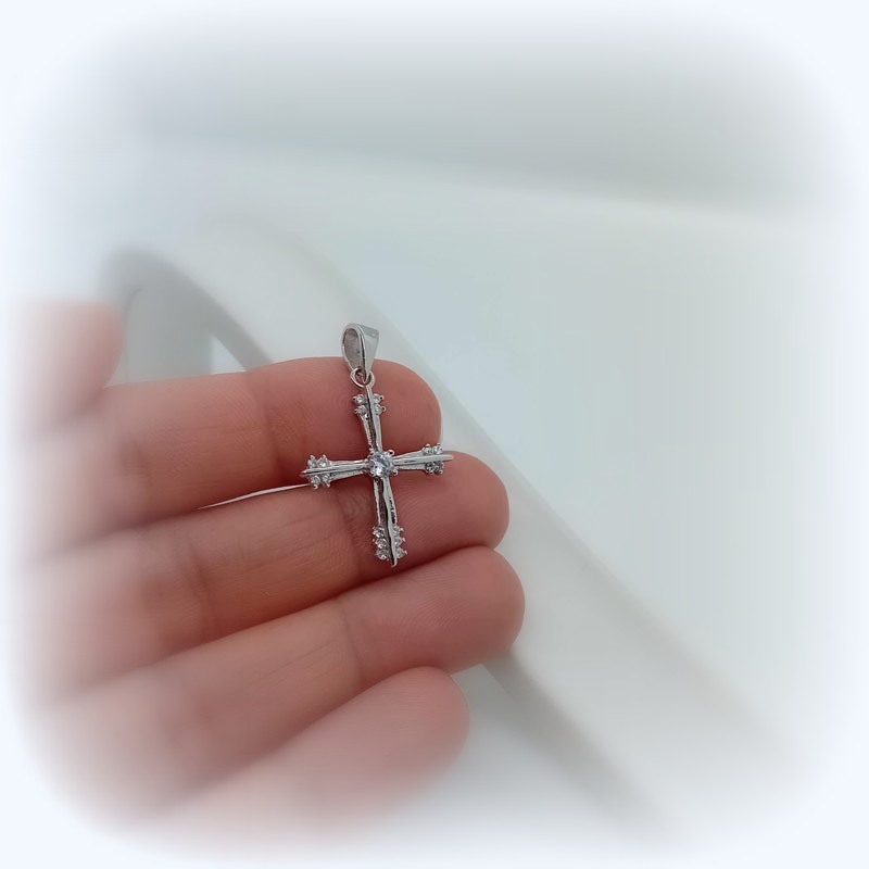 Σύμβολο της χριστιανικής πίστης αλλά και ένα θαυμάσιο κόσμημα αποτελεί αυτός ο περίτεχνος σταυρός , με κομψές λεπτομέρειες και λευκό ευδιάκριτο ζιργκόν στο κέντρο καθώς και 18 μικρότερα ζιργκόν στις άκρες του.