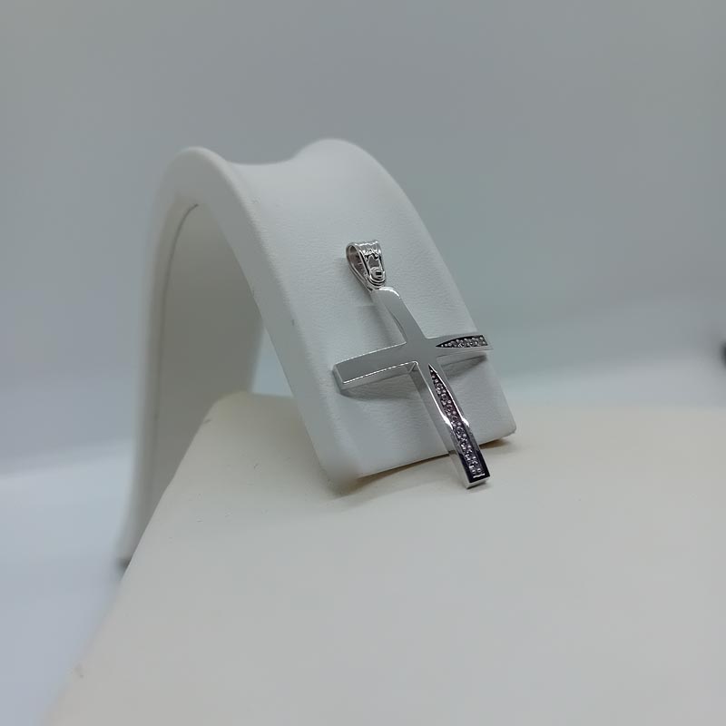 Ένα πανέμορφο design βαπτιστικού σταυρού για κοριτσάκι , σε φαρδιά γραμμή, λευκόχρυσος 9 καρατίων, λουστρέ αστραφτερή όψη και διακριτικά λευκά ζιργκόν στην κάθετη πλευρά και στην μια οριζόντια, με μεγάλο κρίκο σκαλιστό.