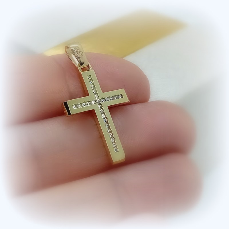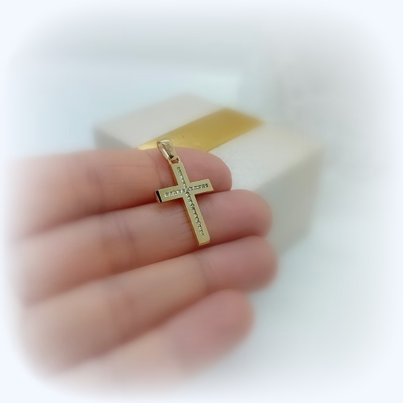 Ένα πραγματικά εκπληκτικό κόσμημα! Γυναικείος σταυρός ορθόδοξος, λουστρέ όψης με κάθετη και οριζόντια σειρά λευκών ζιργκόν και μεγάλο κρίκο.