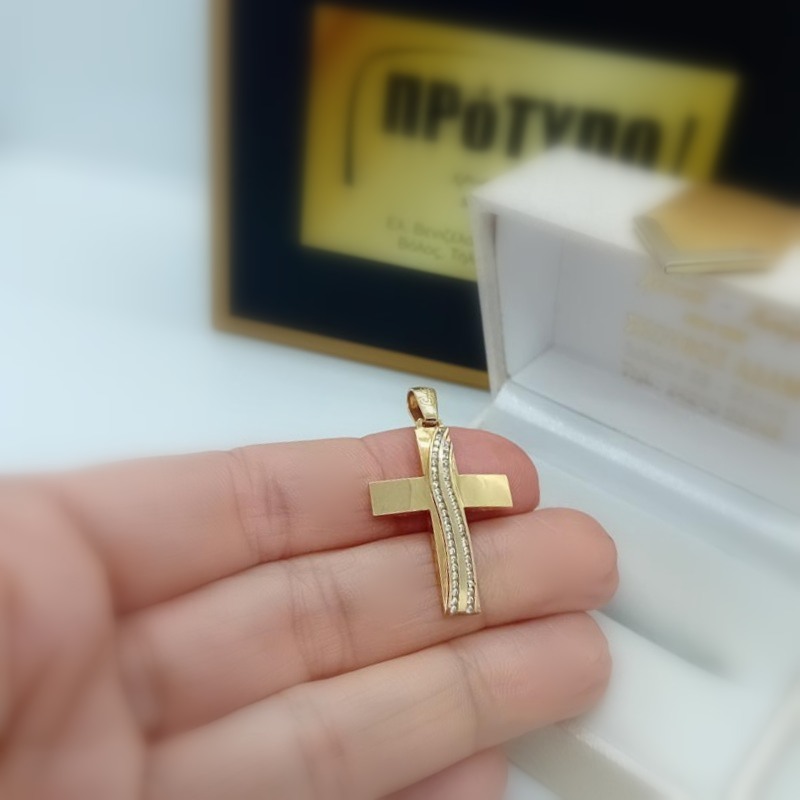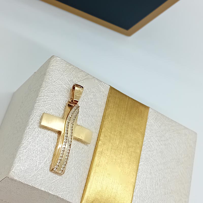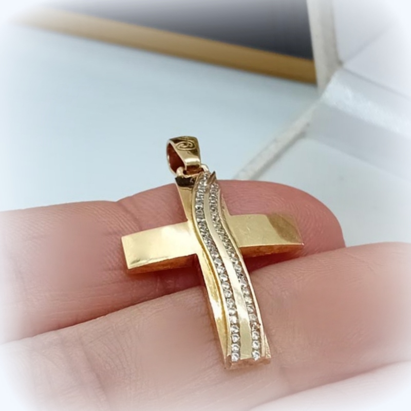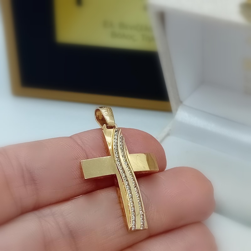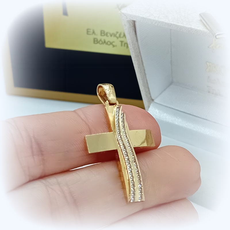 Πολύτιμος και εντυπωσιακός γυναικείος σταυρός, 14 ΚΑΡΑΤΙΩΝ, με λουστρέ επιφάνεια, μεγάλο κρίκο και δύο σειρές από λευκά ζιργκόν να διατρέχουν με ελαφριά καμπύλη την κάθετη πλευρά του, ιδανικός και για βάπτιση μπέμπας.