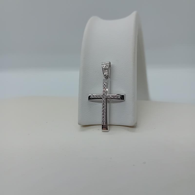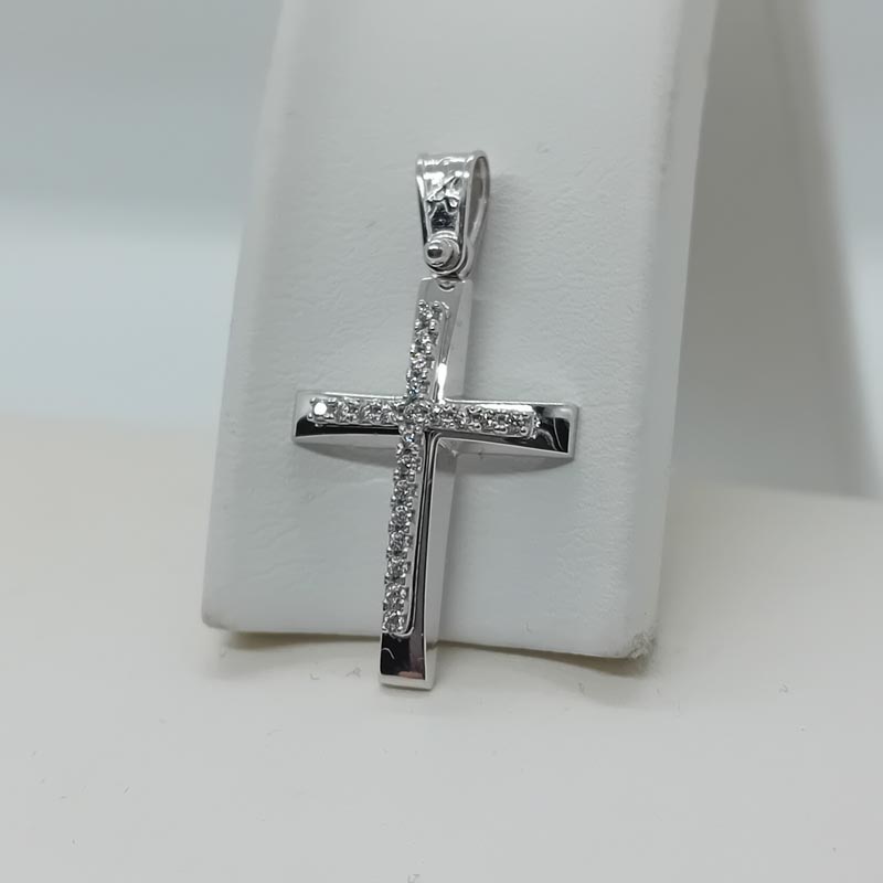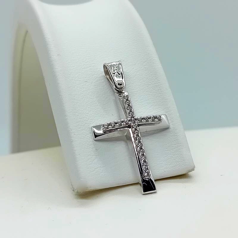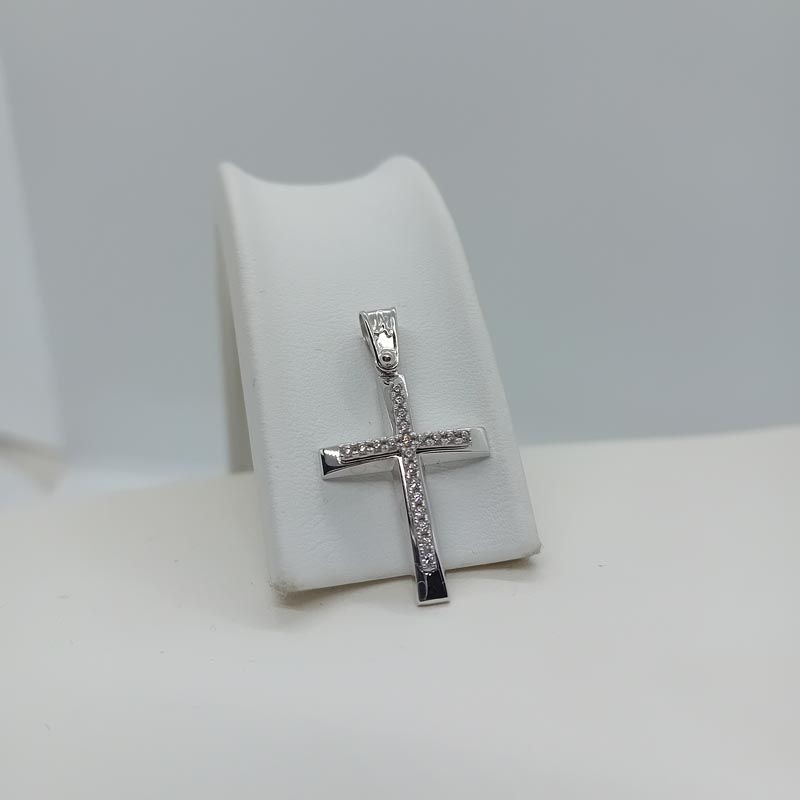 Ένα εξαιρετικό κόσμημα, ένα πολύτιμο σύμβολο πίστης, λουστρέ λαμπερή όψη, έξτρα σταυρό από λευκά αστραφτερά ζιργκόν στην επιφάνειά του, με μεγάλο κρίκο, από λευκόχρυσο 9 ΚΑΡΑΤΙΑ.
