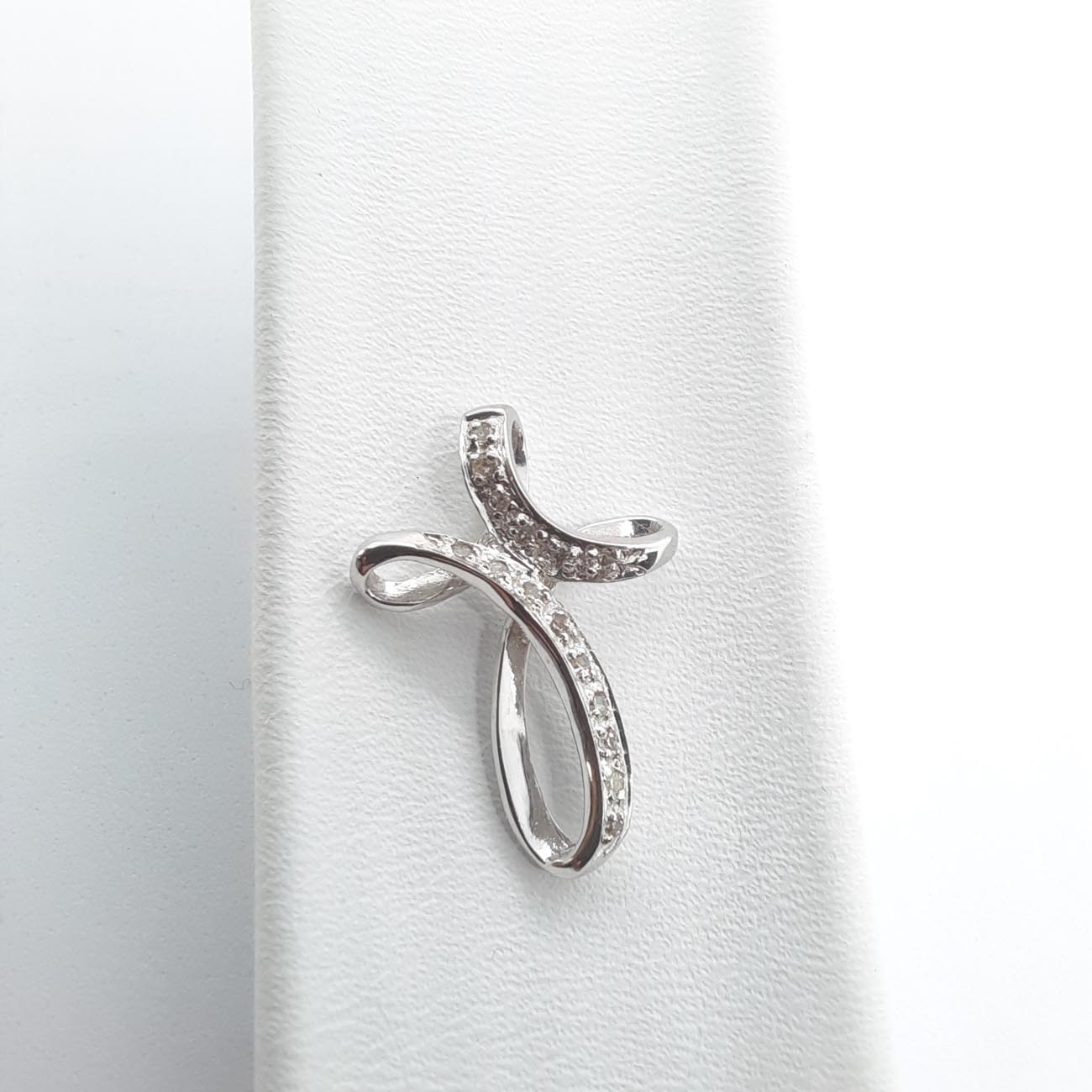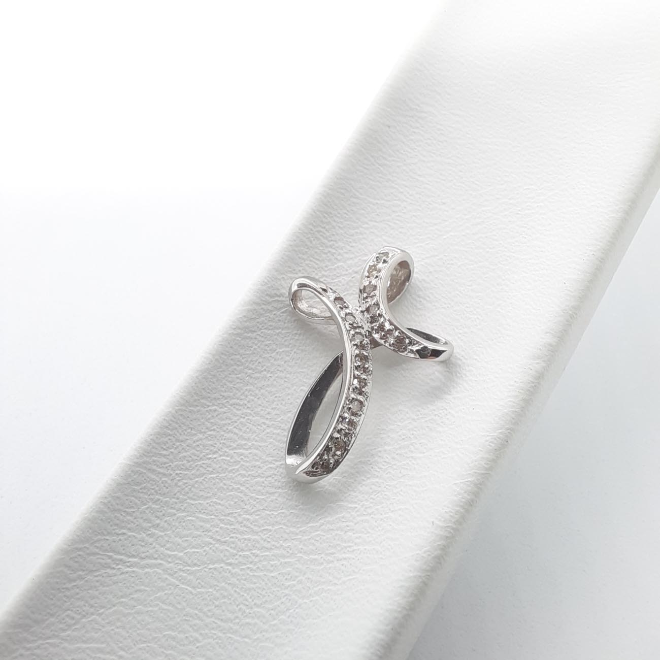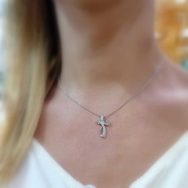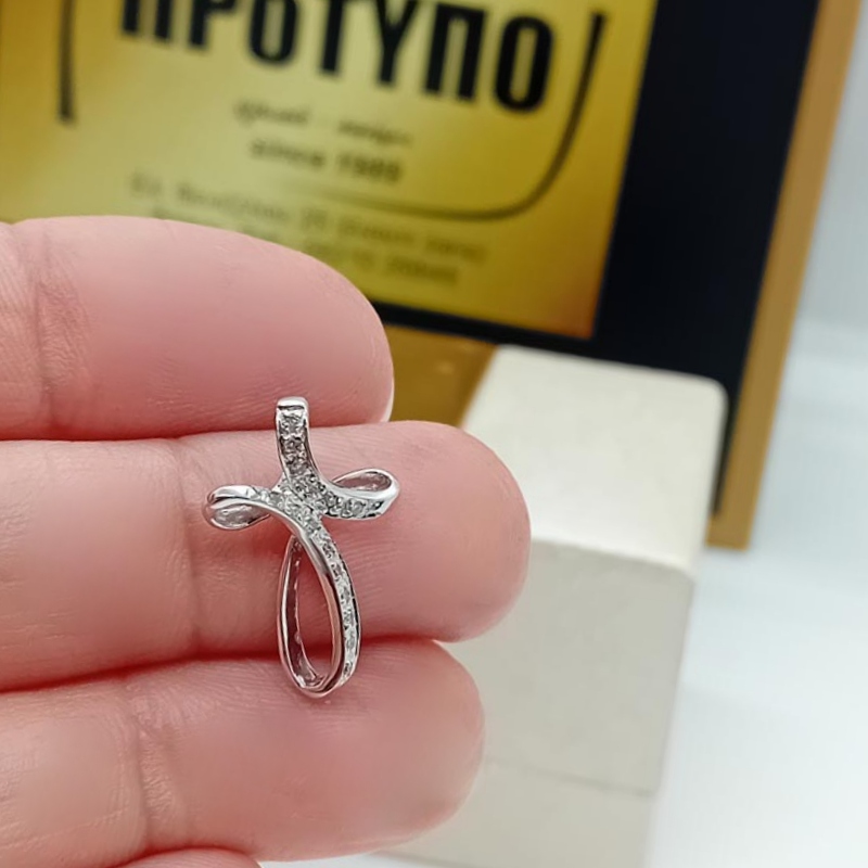 Συναρπαστικός σταυρός από λευκόχρυσο 14 καράτια, , πολύ θηλυκό design, με όμορφες καμπύλες, με αστραφτερά λευκά ζιργκόν. Ιδανικό κόσμημα για το ντεκολτέ της νύφης καθώς και τέλειο δώρο αρραβώνα, γενεθλίων και αποφοίτησης.(ΠΡΟΣΟΧΗ: ο σταυρός διατίθεται μεμονωμένος και ΔΕΝ συμπεριλαμβάνεται η αλυσιδα της φωτογραφίας)