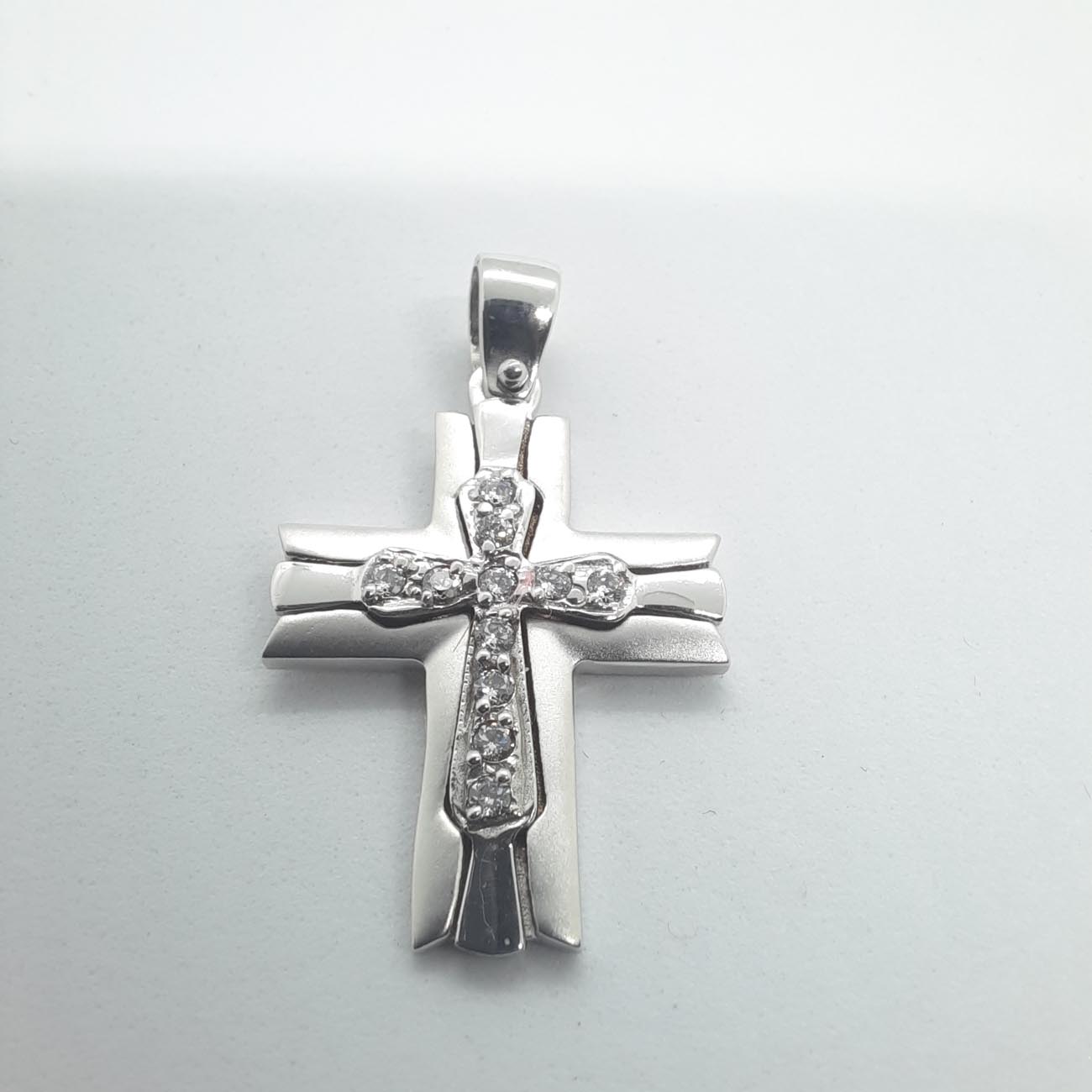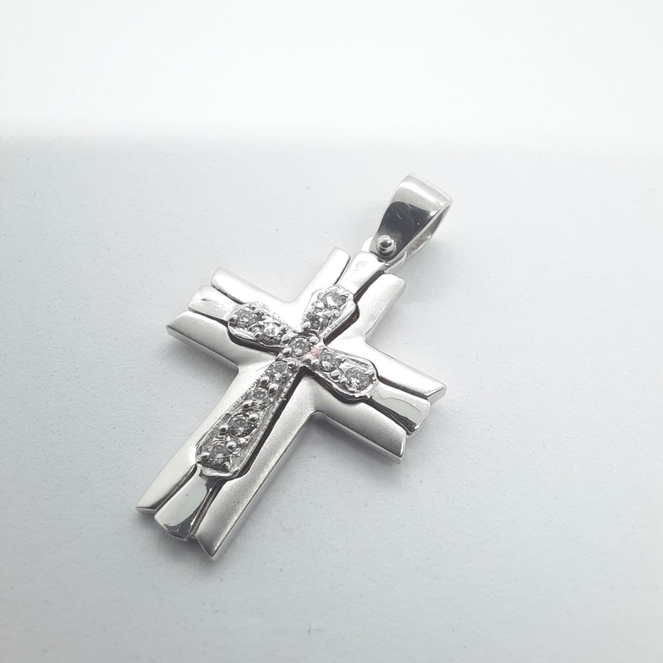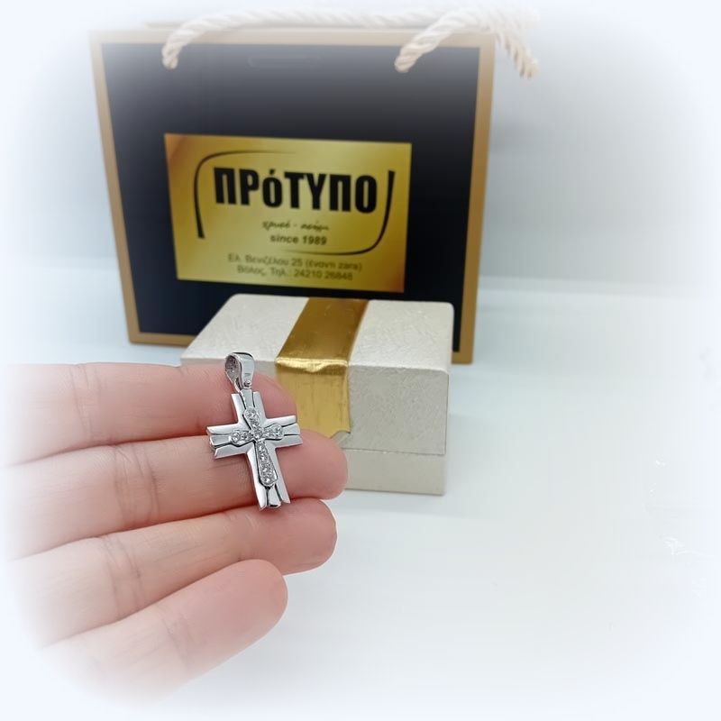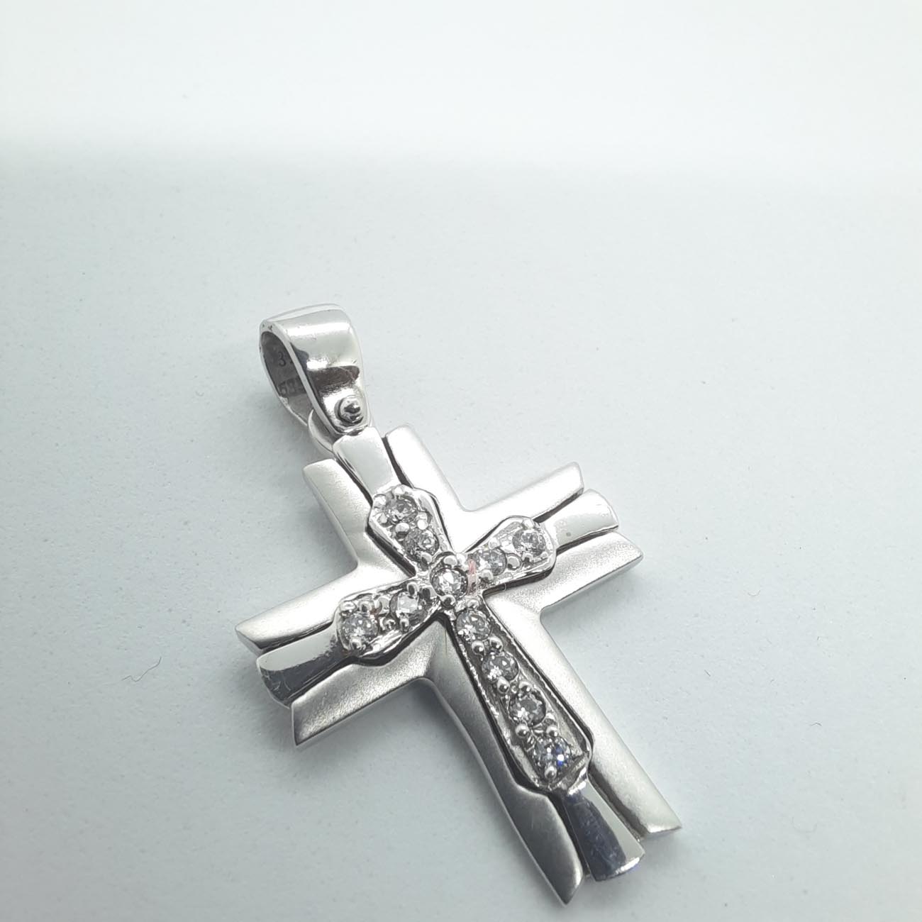 Elegant λευκόχρυσος σταυρός , όψης ματ-λουστρέ, με μεγάλο κρίκο, με έξτρα σταυρό από λευκά ζιργκόν στο κέντρο, ιδανικός για βάπτιση μπέμπας. ΚΑΡΑΤΙΑ 14
