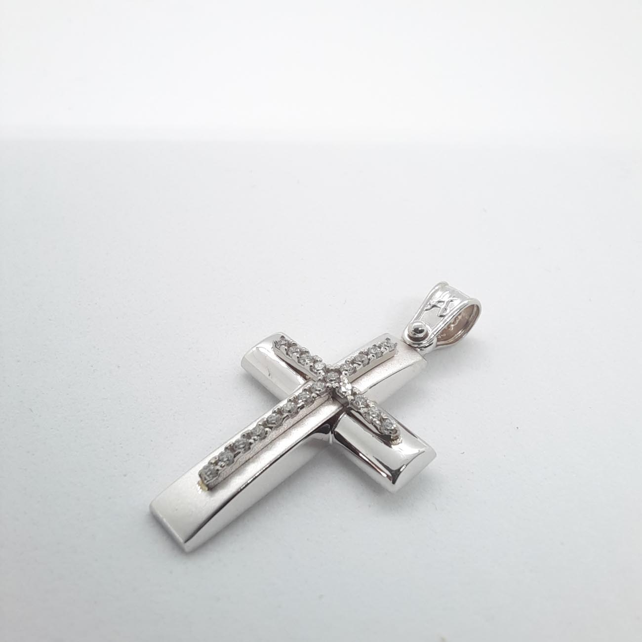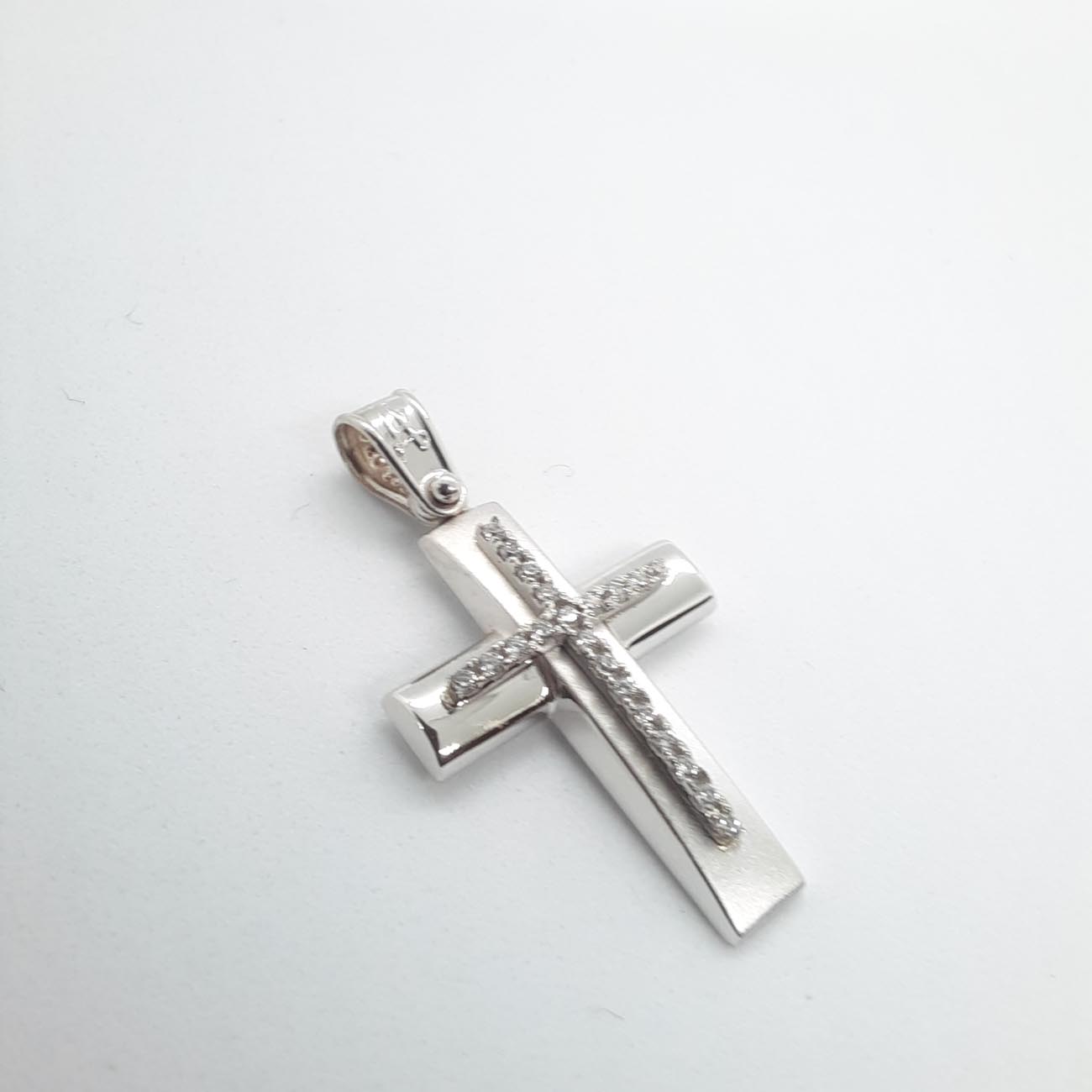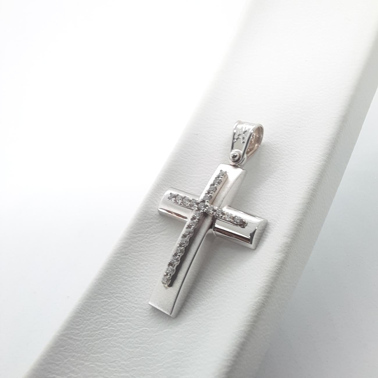 Ένα πολύτιμο κόσμημα και ένα διαχρονικό σύμβολο πίστης, υπέροχος σταυρός από λευκόχρυσο Κ9 , με την κάθετη γάμπα σε ματ επεξεργασία και την οριζόντια γάμπα σε λουστρέ επεξεργασία και έναν κομψό σταυρό από ζιργκόν στην μπροστινή όψη του που προσθέτει έξτρα λάμψη στην γυναίκα που τον φορά.