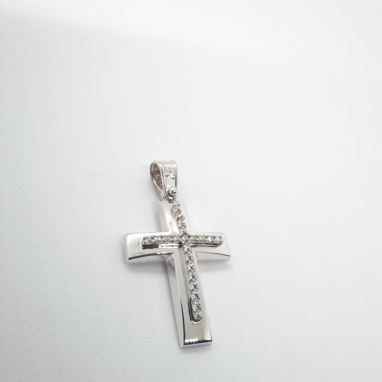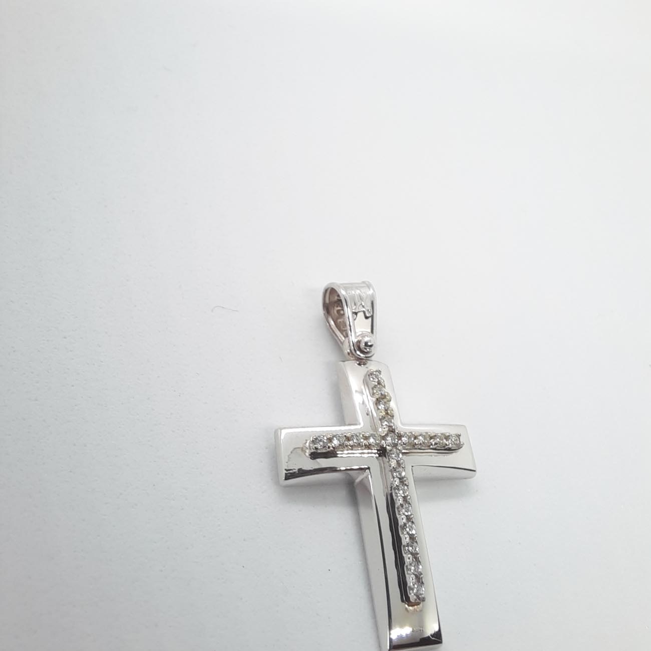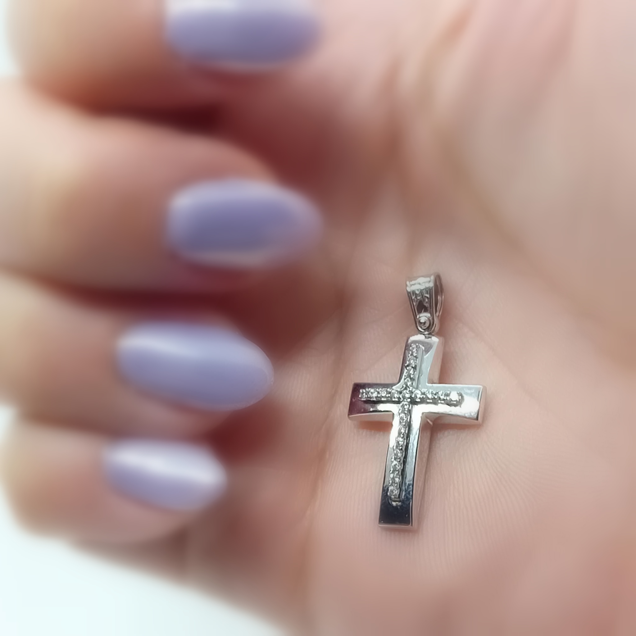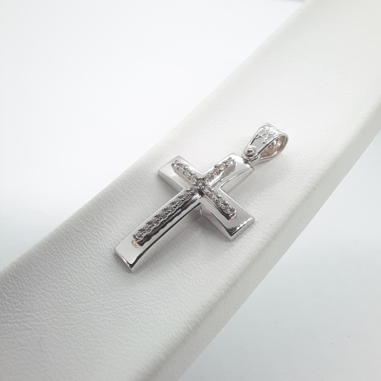 Ένας εκτυφλωτικός σταυρός, μεσαίου μεγέθους, πολύ όμορφα επεξεργασμένος, από λευκόχρυσο Κ9, με λουστρέ επιφάνεια και δεύτερο σταυρό από λευκά ζιργκόν στην μπροστινή όψη του . Διαχρονική ομορφιά , ιδανικός για βάπτιση ή δώρο σε αγαπημένο πρόσωπο.