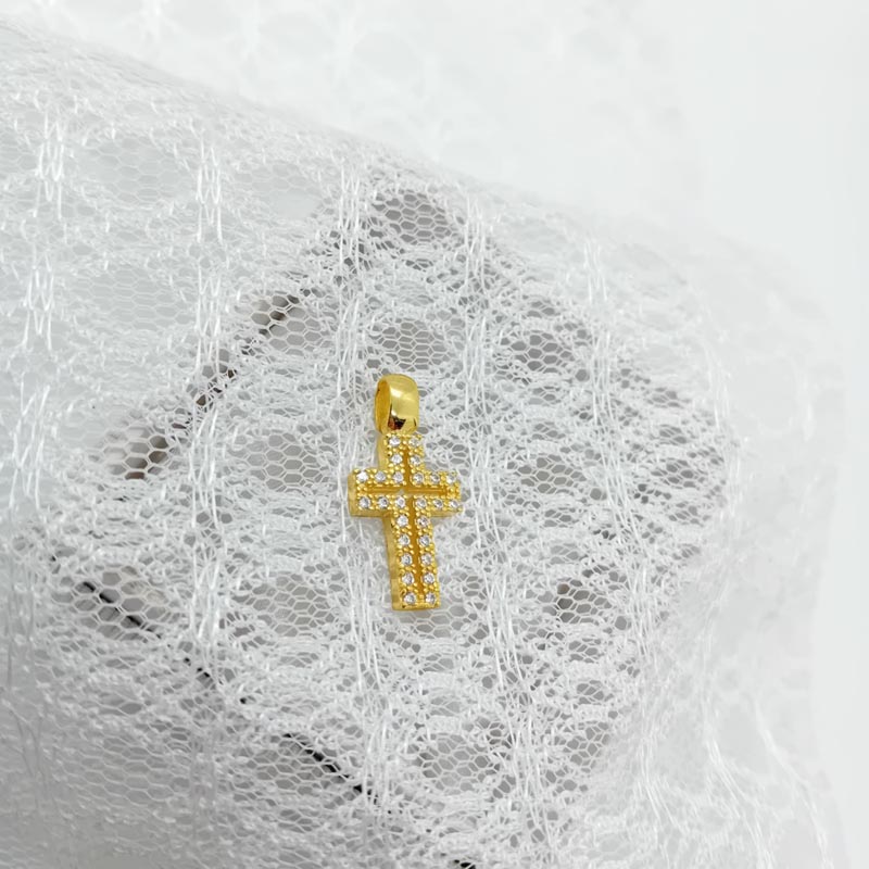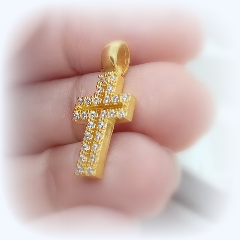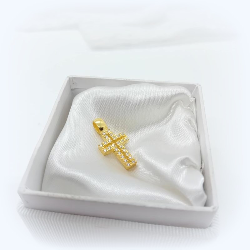Λαμπερή εμφάνιση με μικρό γυναικείο σταυρό από επιχρυσωμένο ασήμι με μεγάλο κρίκο, όλη η επιφάνεια διακοσμημένη με λευκά μικροσκοπικά ζιργκόν και έναν διάτρητο σταυρό στο κέντρο. Ένα κόσμημα πίσης και αγάπης.