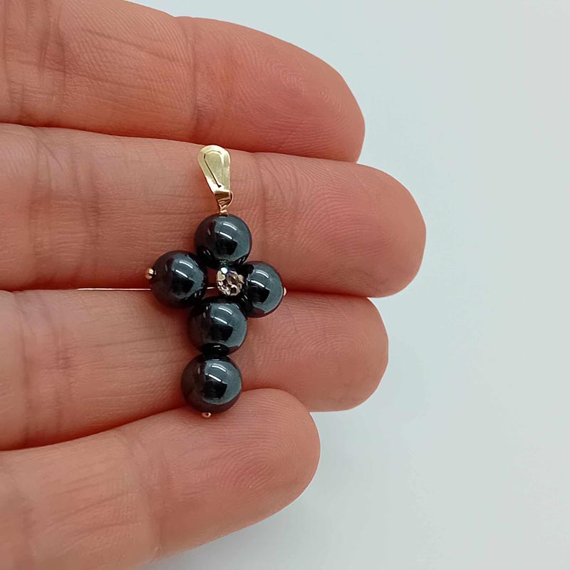 Για μια στυλάτη κυρία σταυρός πολύ ιδιαίτερος από πέτρα αιματίτη και κεντρικό λευκό ζιργκόν, από χρυσό 14 ΚΑΡΑΤΙΩΝ με μεγάλο εντυπωσιακό κρίκο , κομψό δώρο πίστης και αγάπης.