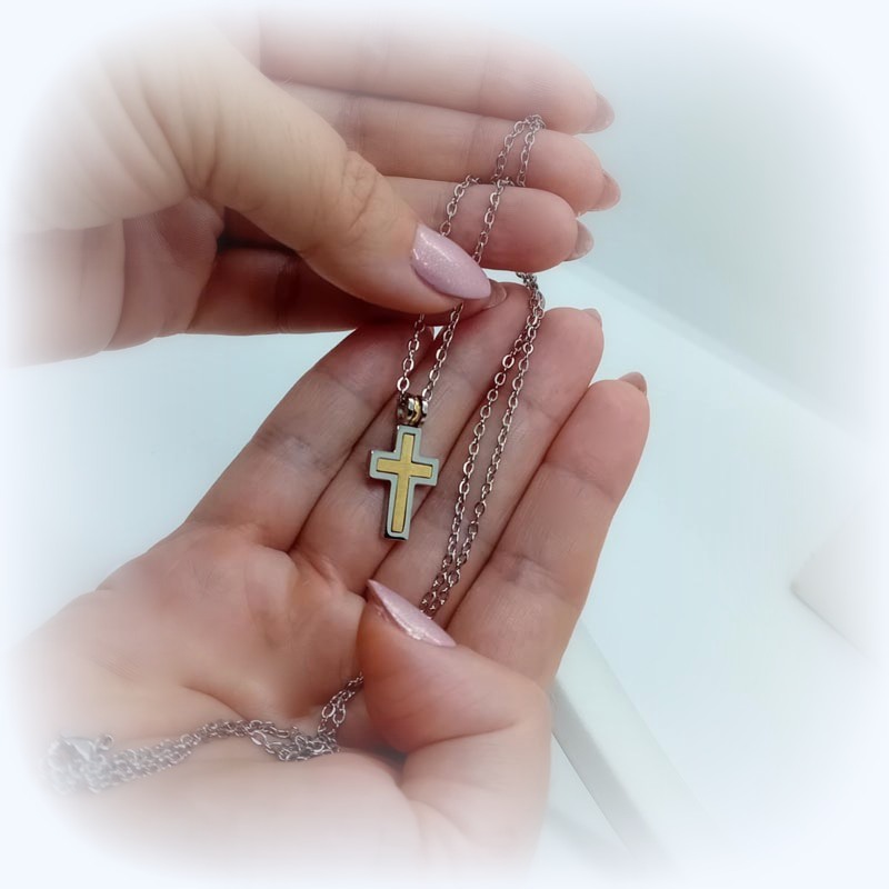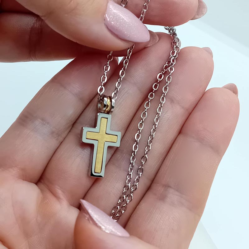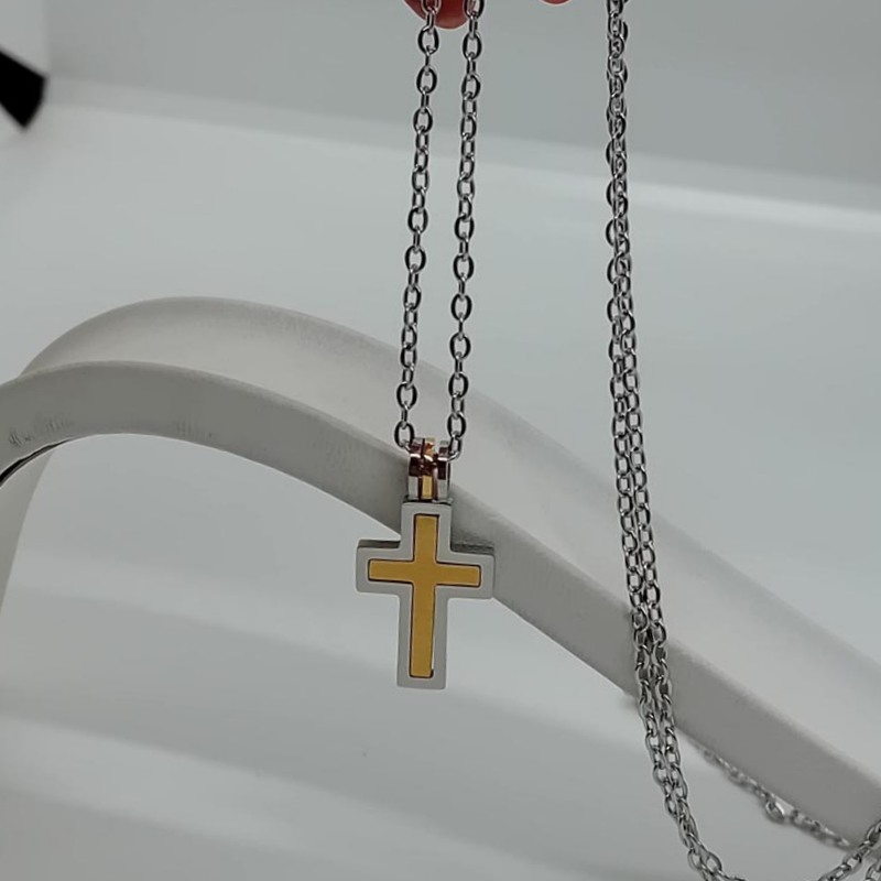 Αίσθηση πολυτέλειας και λάμψης με σταυρό unisex, ιδανικό κόσμημα και για γυναίκα και για άντρα, από ανοξείδωτο υποαλλεργικό ατσάλι, σε χρυσαφί απόχρωση, με ασημί περίγραμμα, συνοδεύεται από την αλυσίδα του.