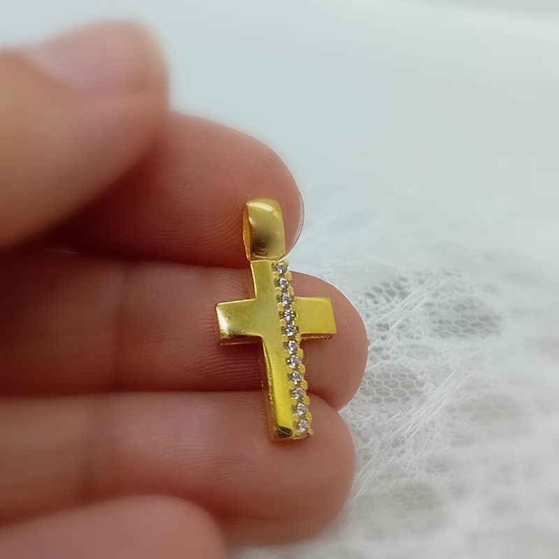 Ένα πολύ όμορφο κόσμημα πίστης και ευλογίας, σταυρός γυναικείος, λουστρέ όψης, με μια κάθετη σειρά μικρών λευκών ζιργκόν και μεγάλο κρίκο από επιχρυσωμένο ασήμι.