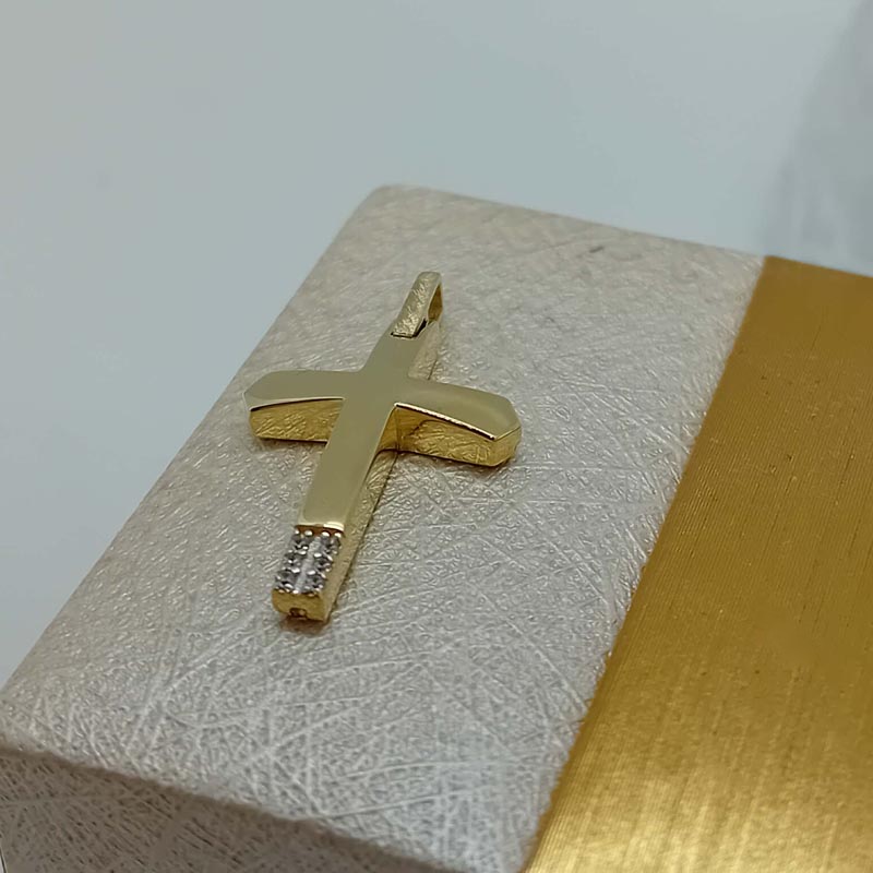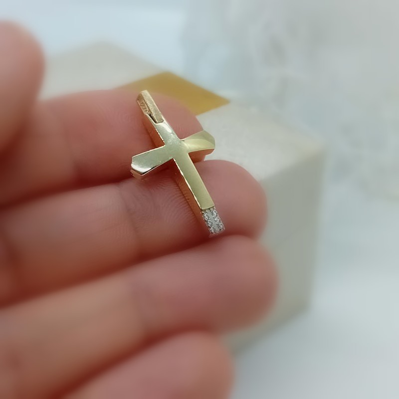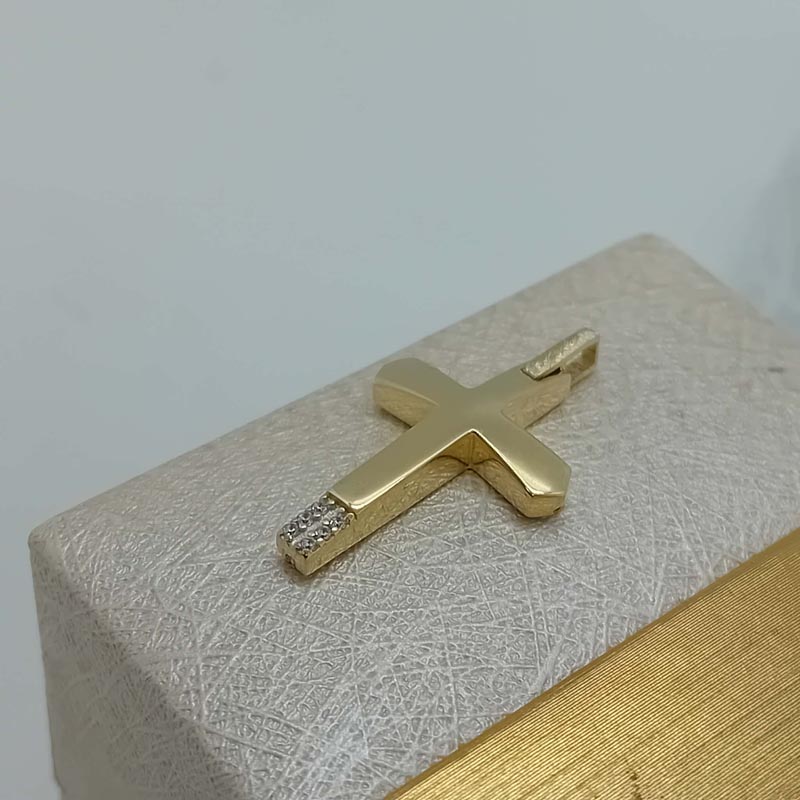 Σταυρός λουστρέ επιφάνειας , με λίγα ζιργκόν στο τελευταίο άκρο του, με κρικάκι ματ ζαγρέ ενσωματωμένο -που δεν κινείται- και όμορφη πίσω όψη, από χρυσό 9 καρατίων.