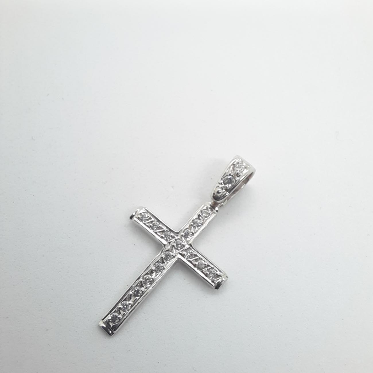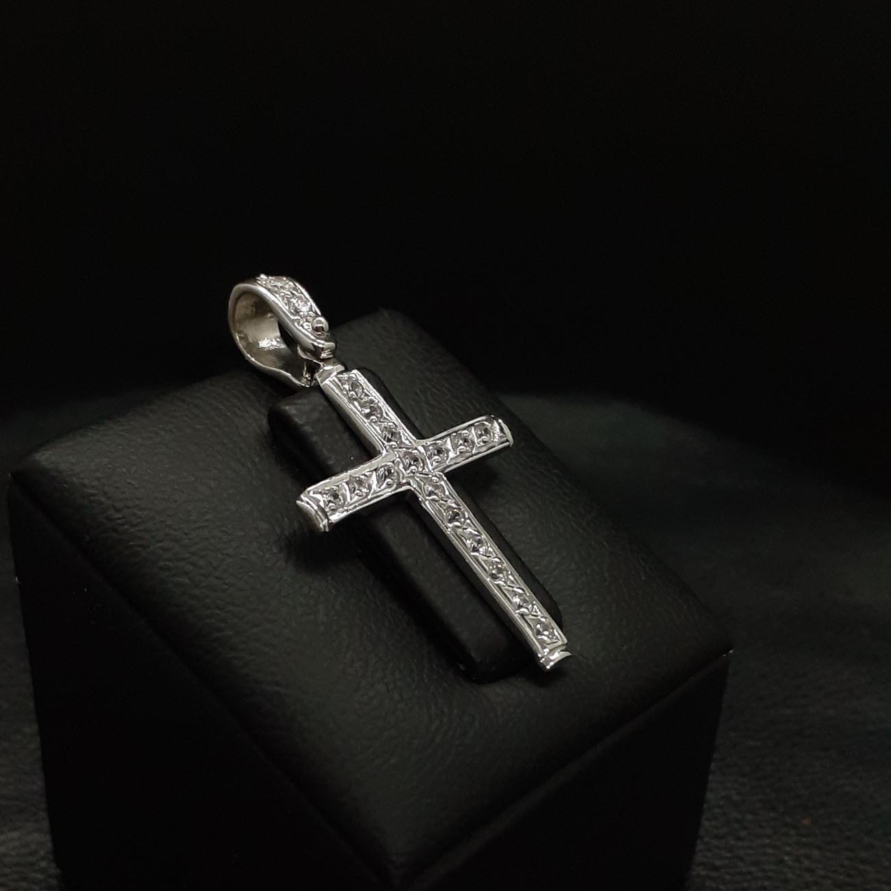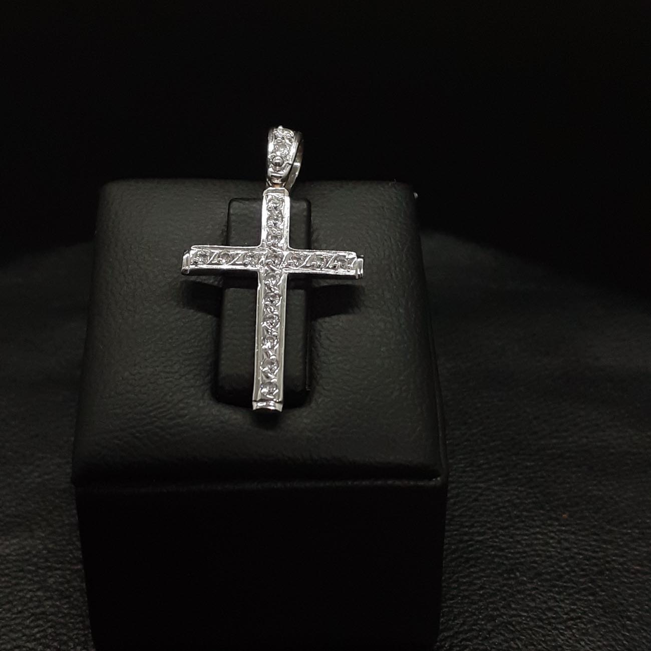 Υπέρκομψος σταυρός , λεπτός και φινετσάτος , καλυμμένος σε ολόκληρη την μπροστινή επιφάνειά του και στον κρίκο του με λευκά λαμπερά ζιργκόν, μια εμφάνιση εντυπωσιακή, λιτής πολυτέλειας για όσες αγαπάμε.