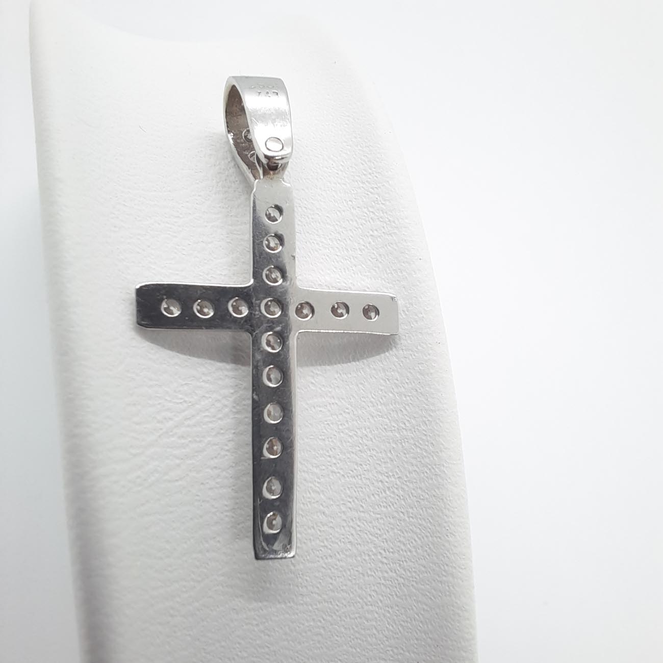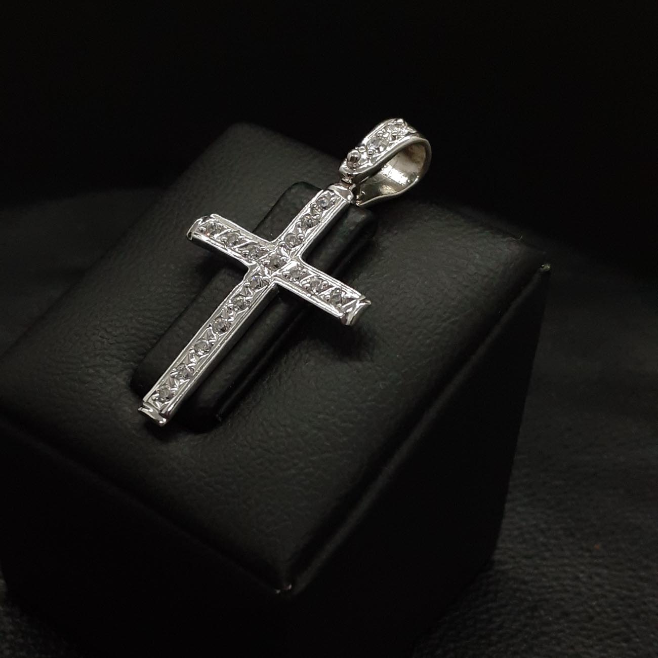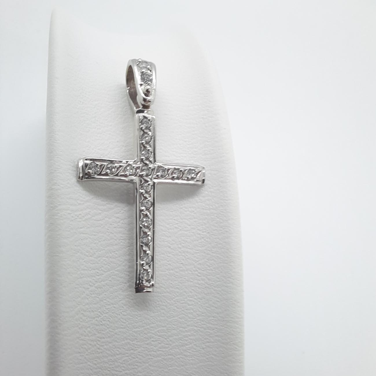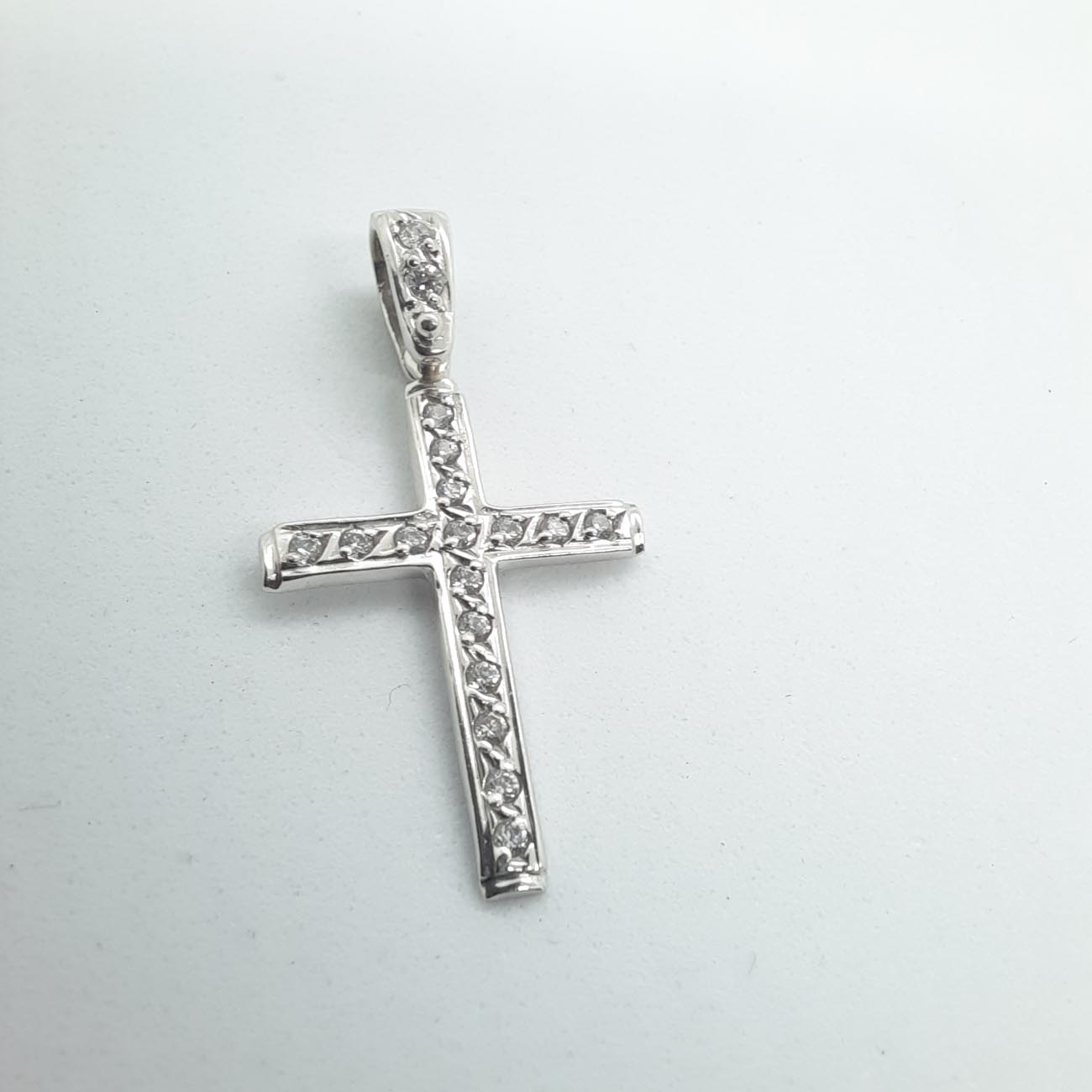 Υπέρκομψος σταυρός , λεπτός και φινετσάτος , καλυμμένος σε ολόκληρη την μπροστινή επιφάνειά του και στον κρίκο του με λευκά λαμπερά ζιργκόν, μια εμφάνιση εντυπωσιακή, λιτής πολυτέλειας για όσες αγαπάμε.