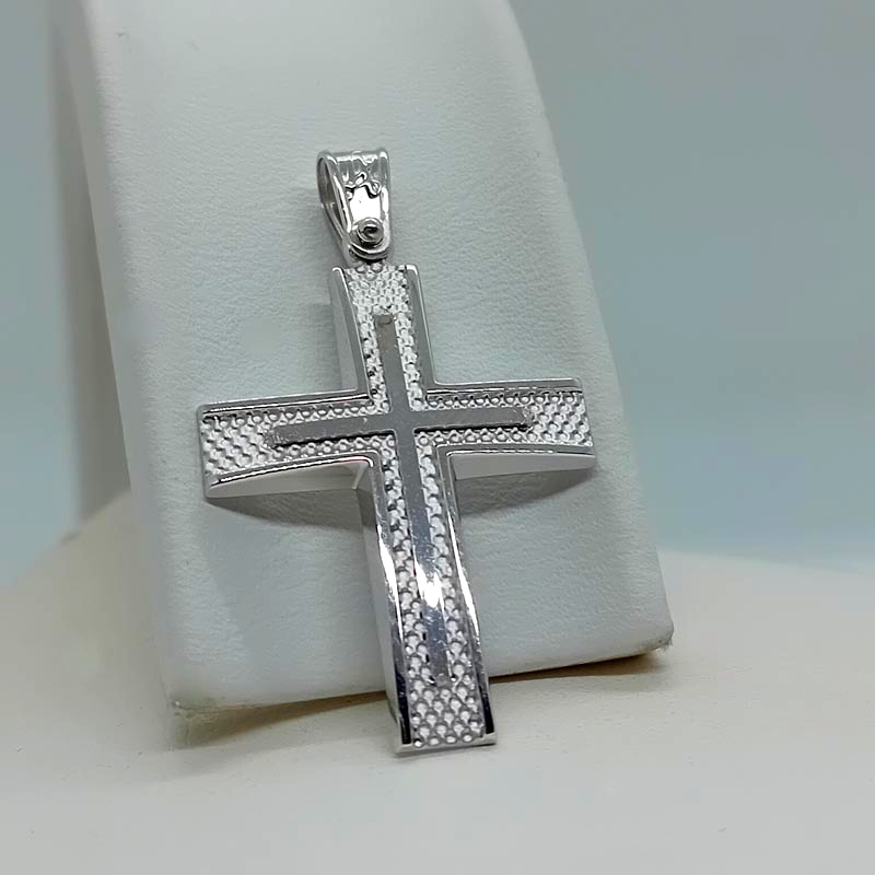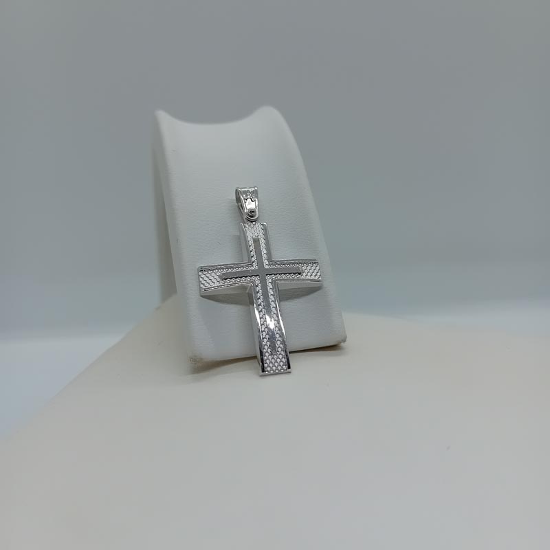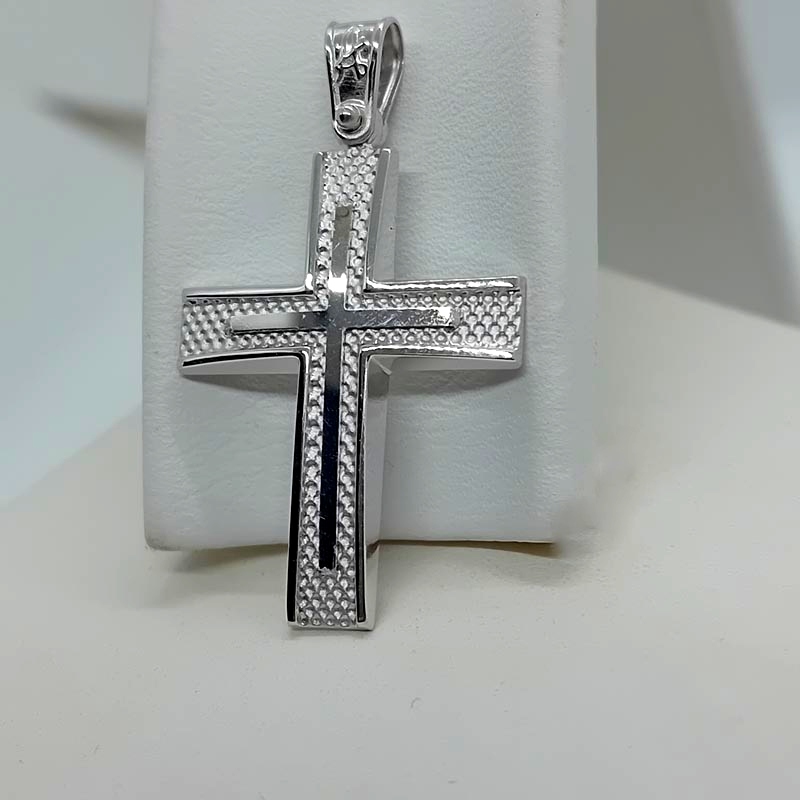 Πολυτελής σταυρός βάπτισης με design διαχρονικής σοβαρότητας, λουστρέ λαμπερή επιφάνεια, διακριτικό σκάλισμα και έξτρα λεπτό σταυρό στην μπροστινή όψη, σχέδιο unisex, από λευκόχρυσο 9 καρατίων.