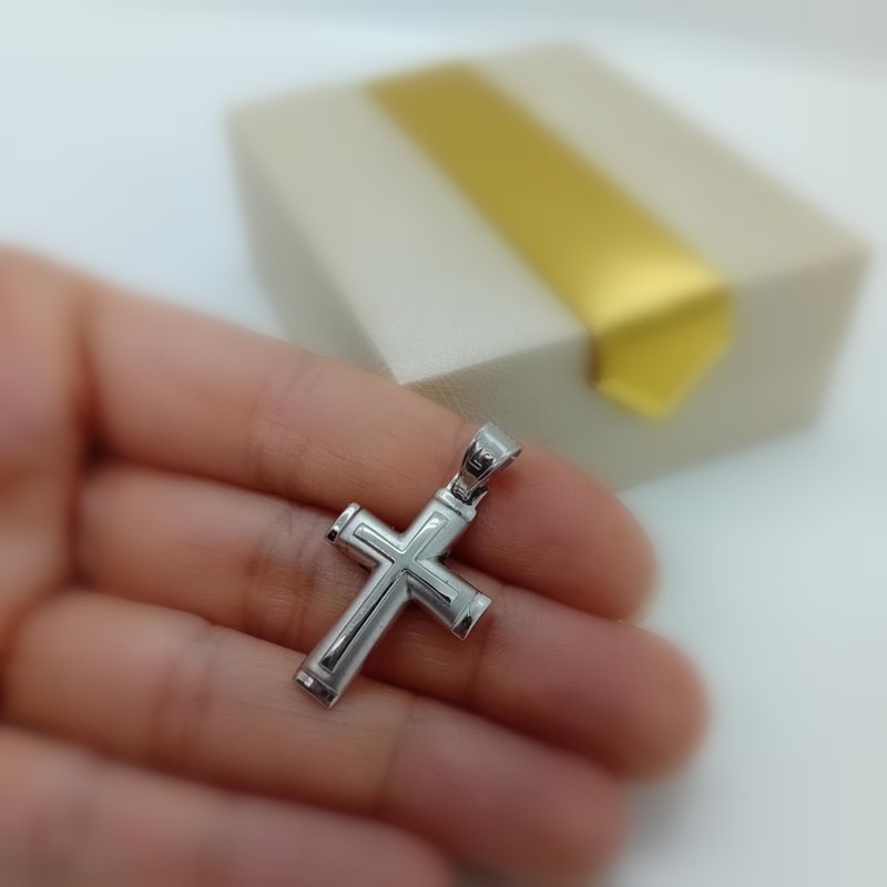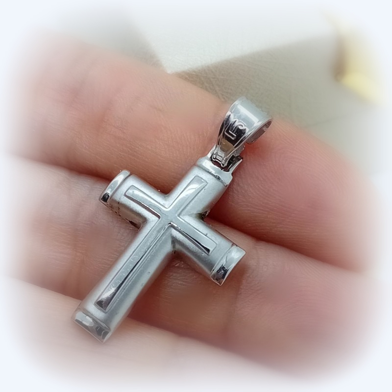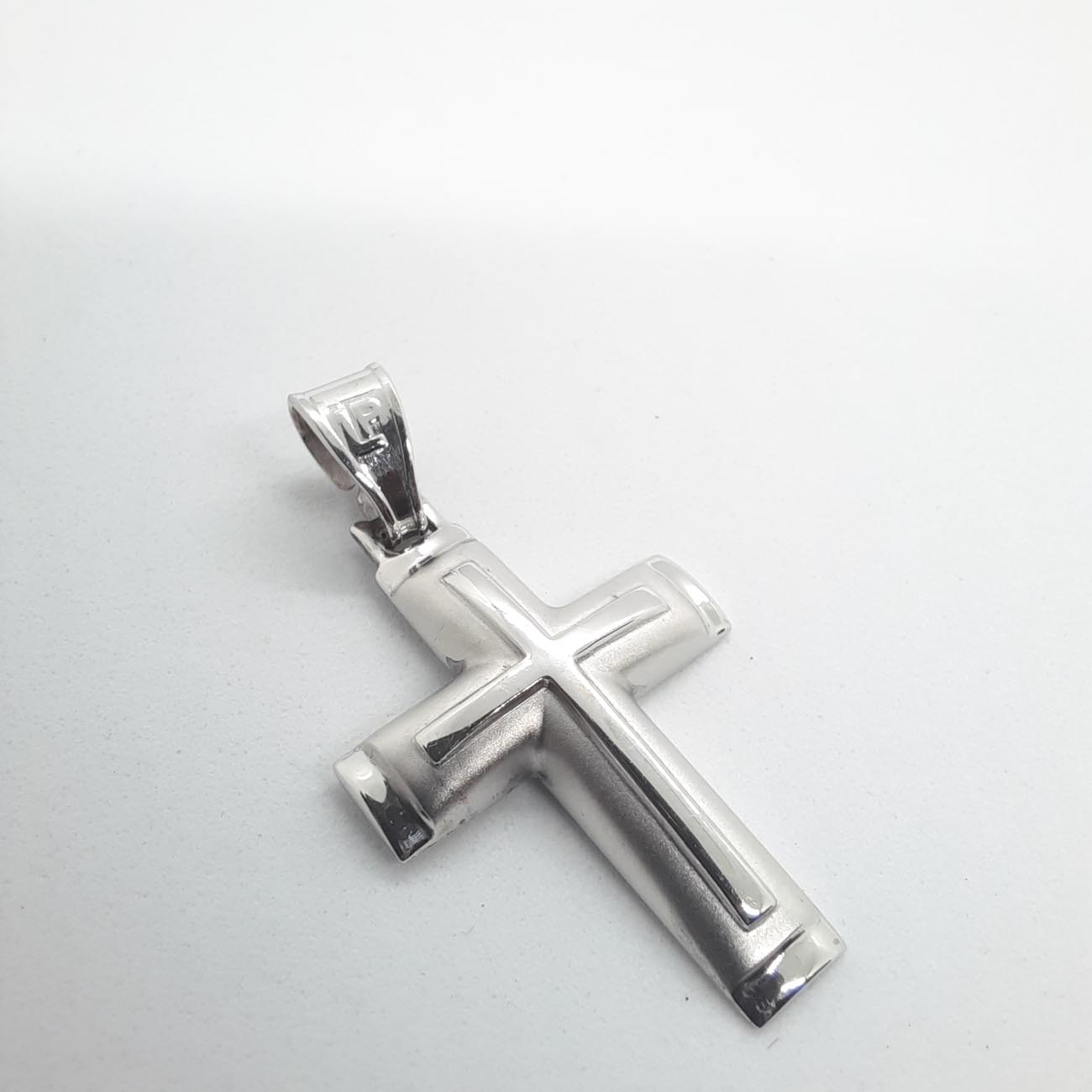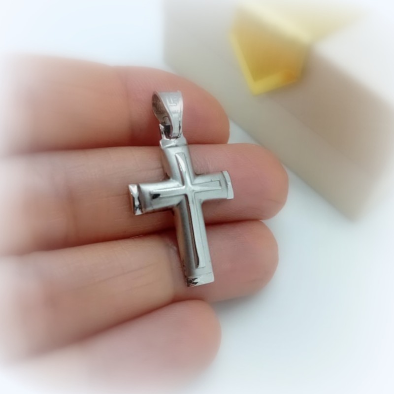 Σταυρός λευκόχρυσος ματ όψης με λουστρέ τελειώματα και έναν ακόμη σταυρό λουστρέ στο κέντρο, ιδανικός σταυρός βάπτισης και δώρου για άντρα ή γυναίκα.