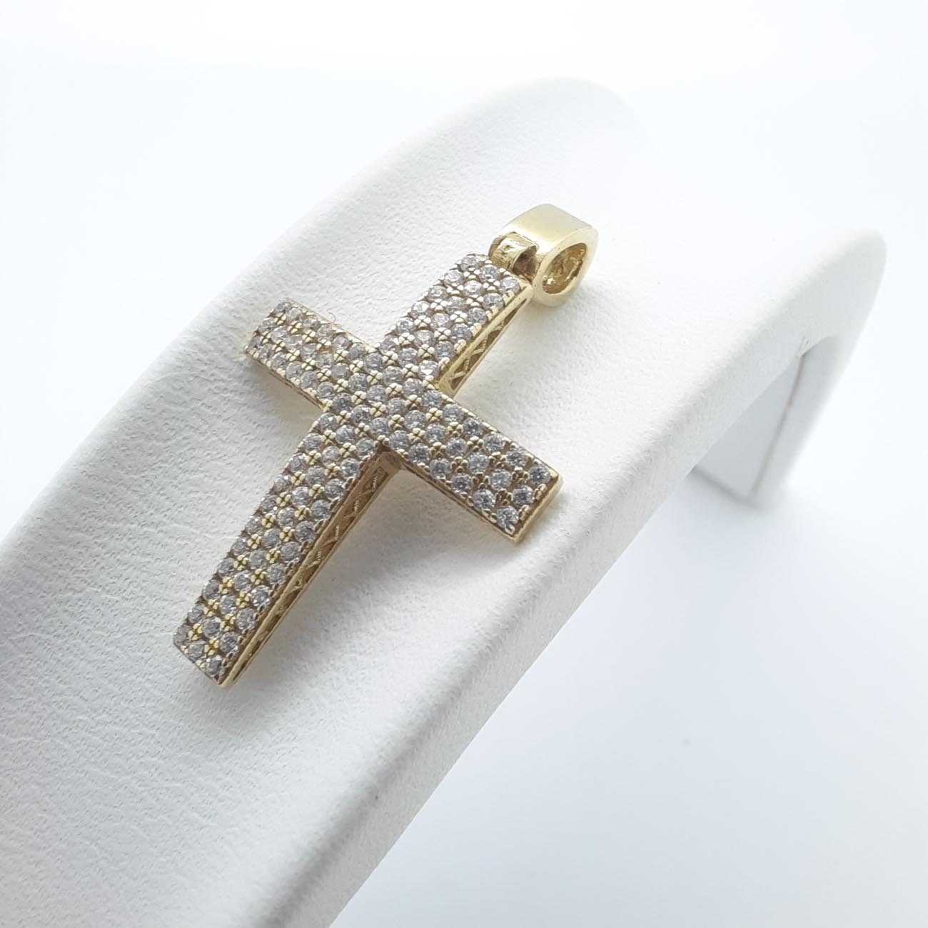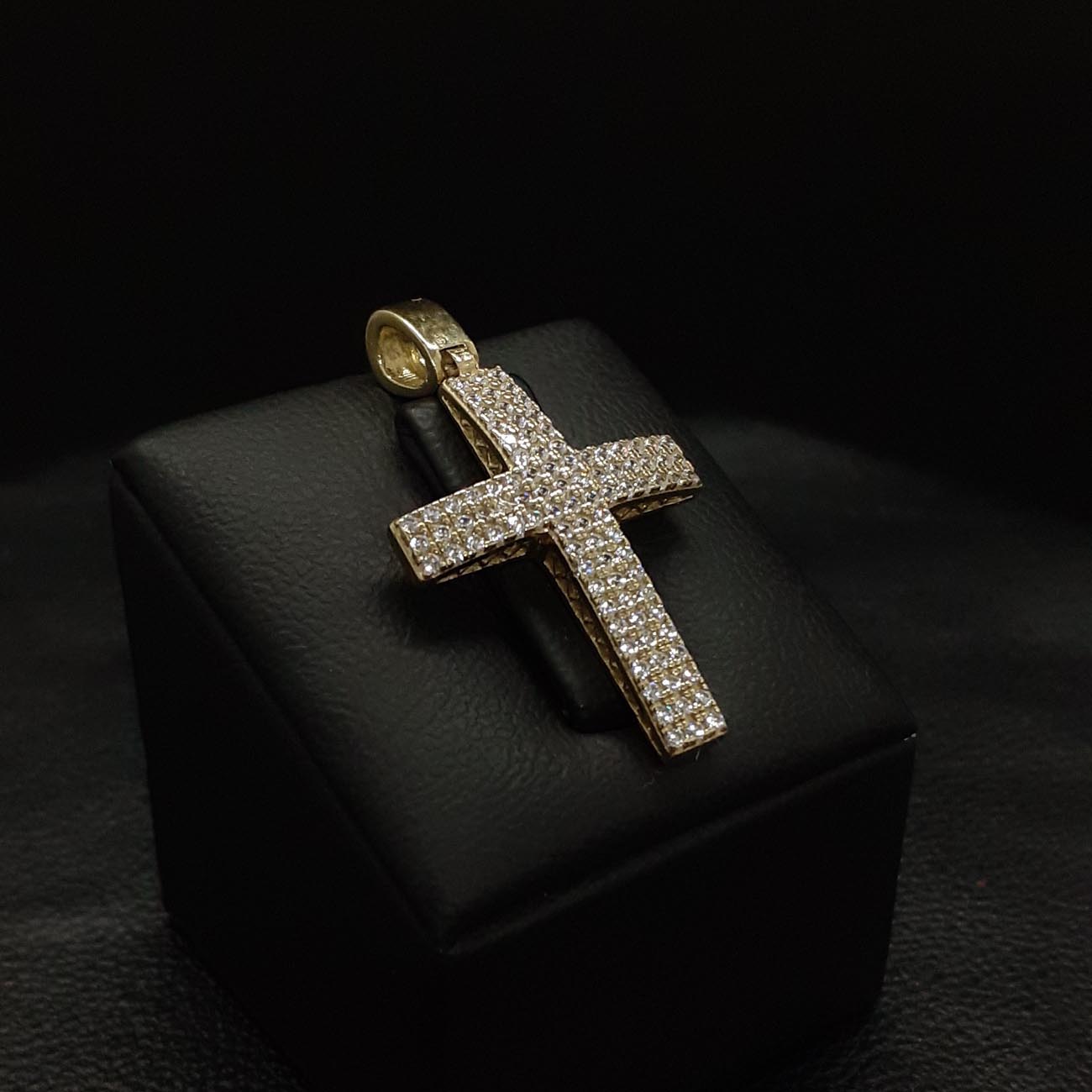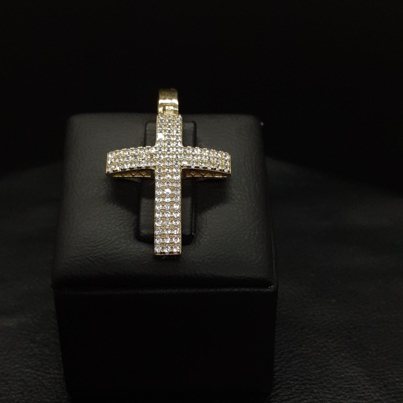 Πανέμορφος σταυρός από χρυσό 14 καρατίων,double face , με αμέτρητα εκτυφλωτικά ζιργκόν στην μία όψη και λιτό σκαλισμένο σταυρό στην πίσω όψη , ιδανικός σταυρός για βάπτιση μπέμπας αλλά και για πολύτιμο δώρο αρραβώνα και επετείου για την γυναίκα που λατρεύει τις ξεχωριστές εμφανίσεις.