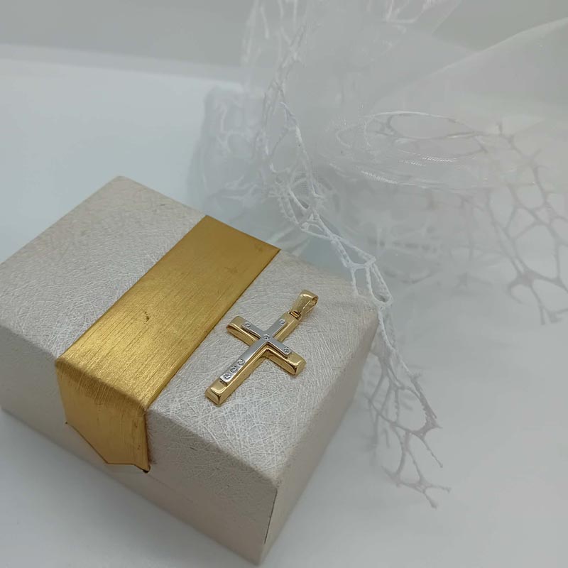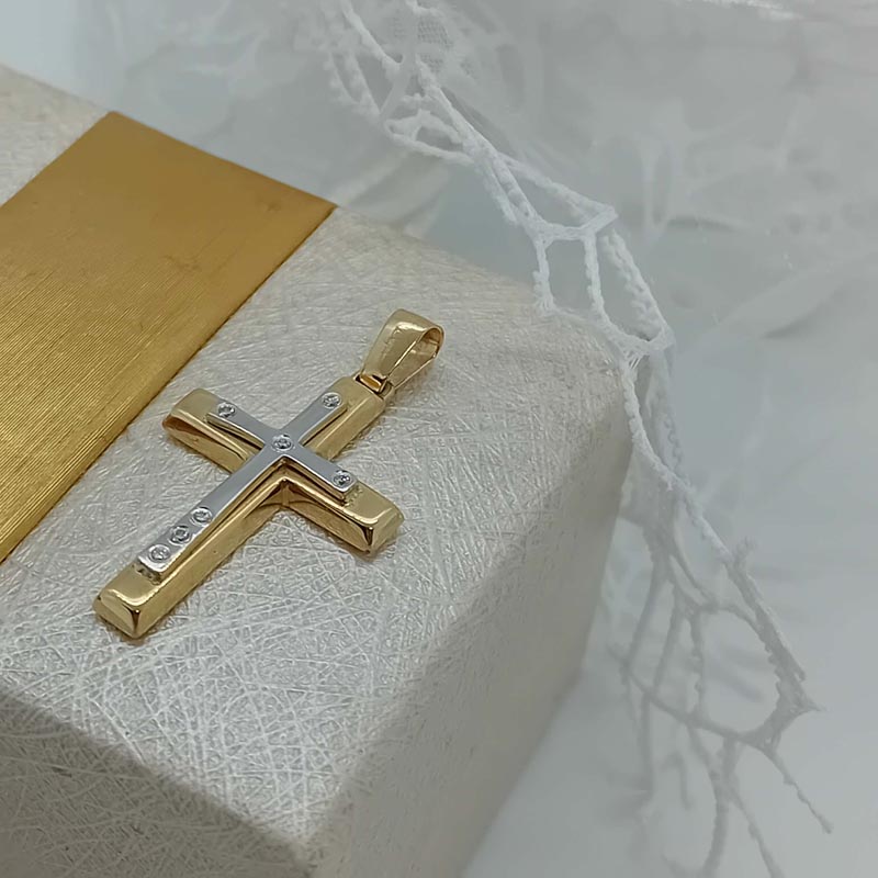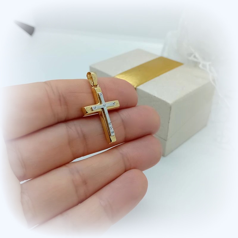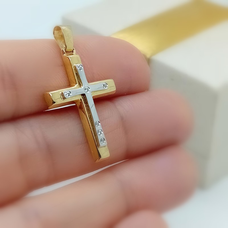 Σοβαρός και πολύτιμος σταυρός σε μίνιμαλ σχεδίαση από ΧΡΥΣΟ 9 καρατίων με έξτρα σταυρό -από λευκόχρυσο και 7 ζιργκόν- στην επιφάνειά του.