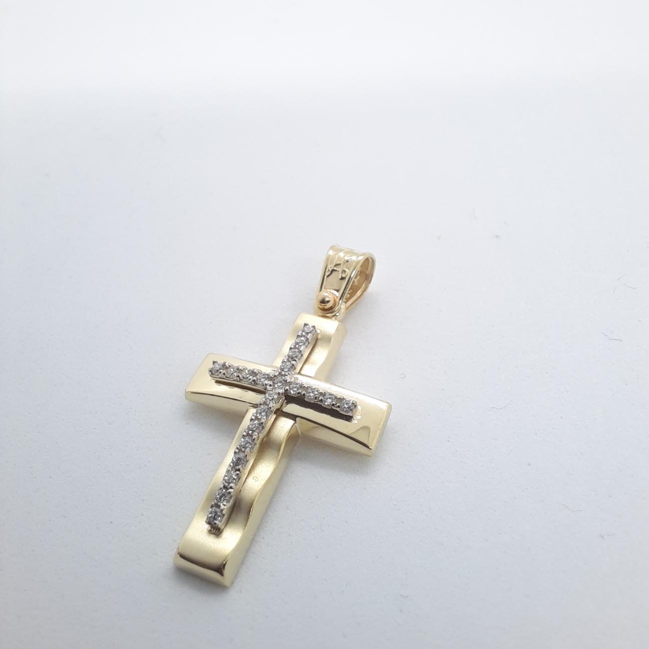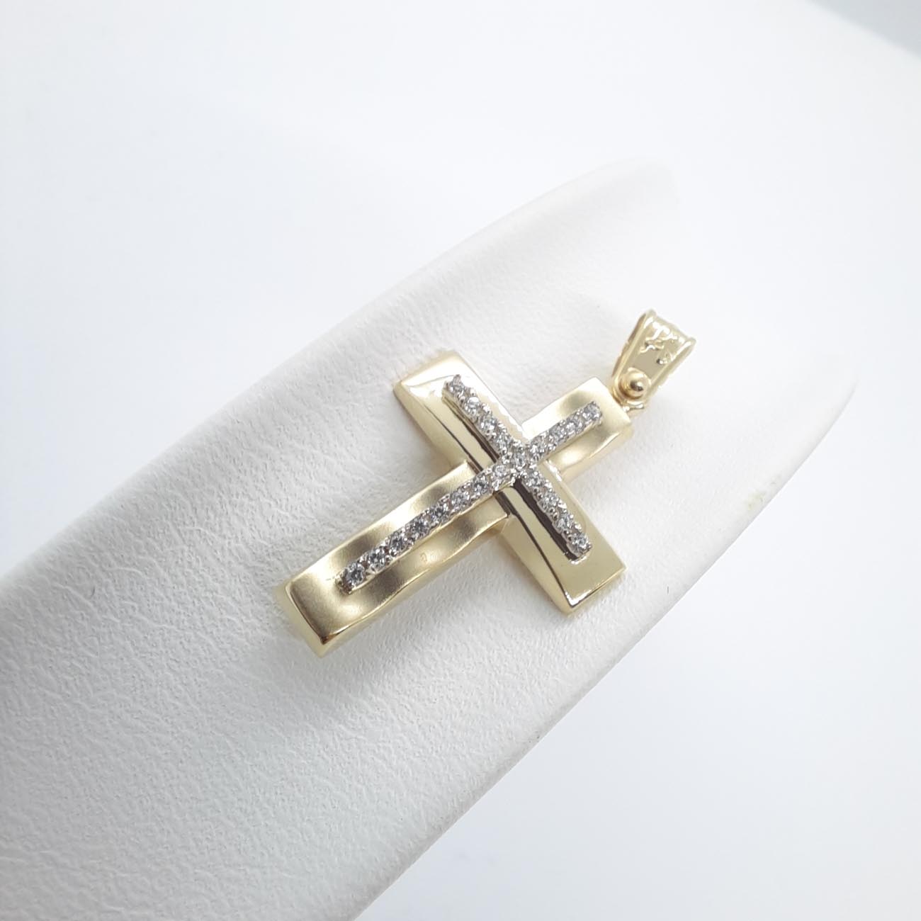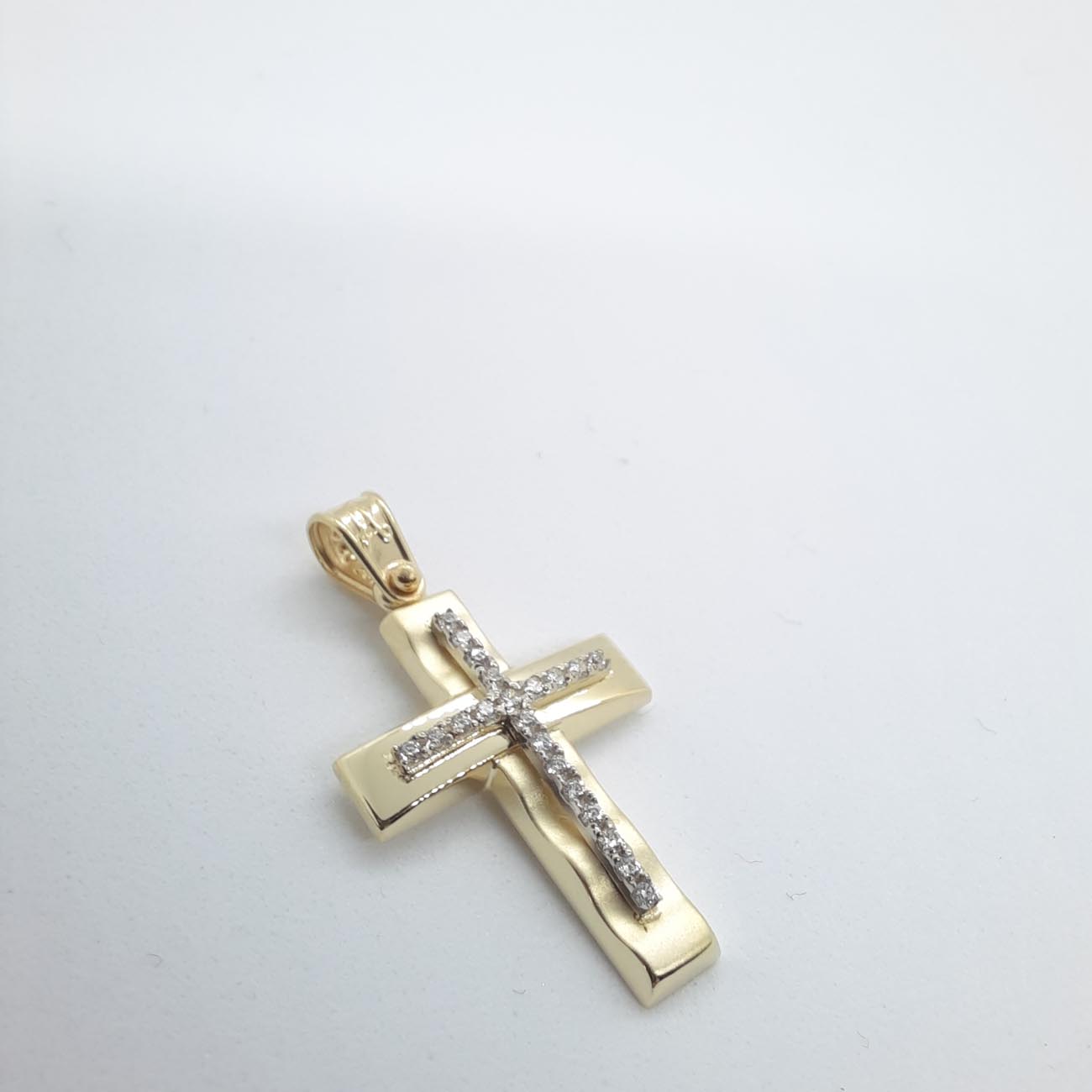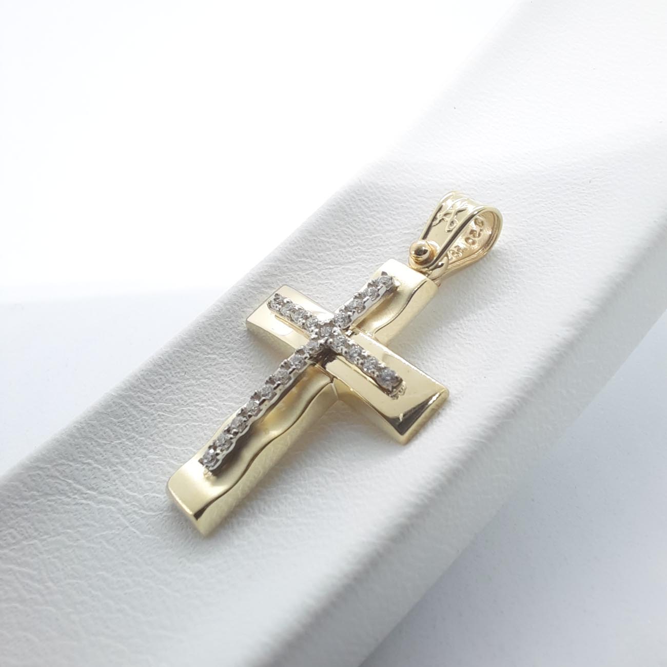 Για την βάπτιση της μπέμπας ή για πολύτιμο δώρο αγάπης, σταυρός από χρυσό Κ9, ρομαντικής αισθητικής, με λουστρέ οριζόντια πλευρά και κάθετη ματ πλευρά με κυματοειδή όψη και χαρακτηριστικό δεύτερο σταυρό από λευκά ζιργκόν στην επιφάνεια.