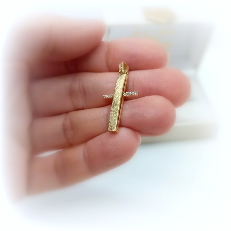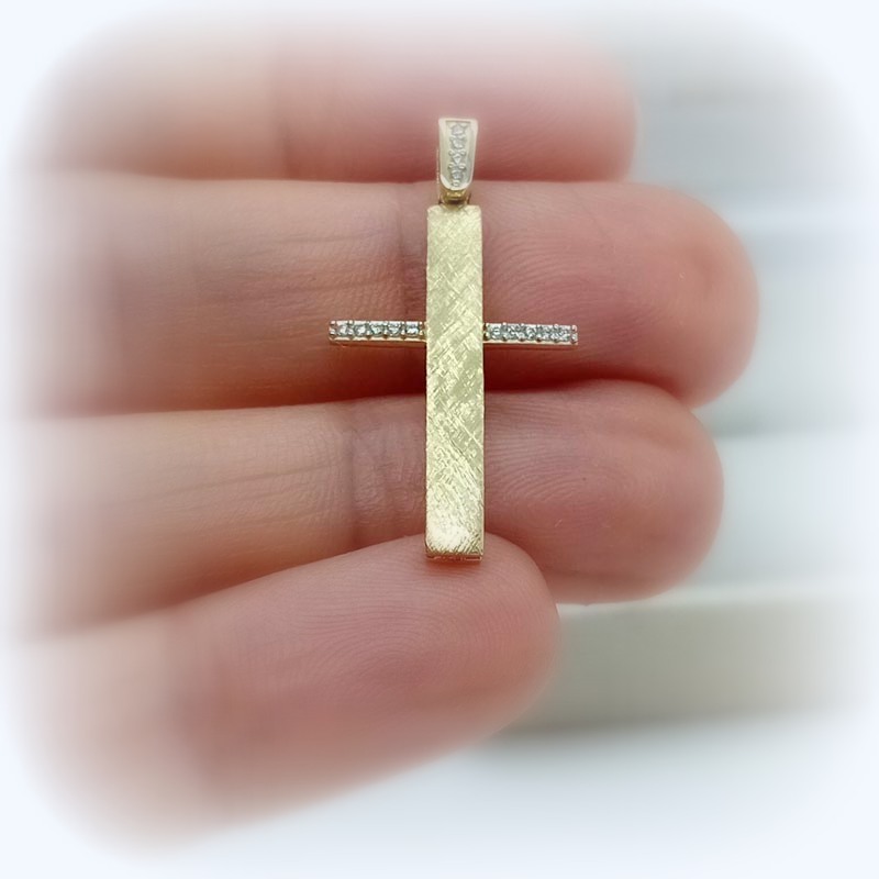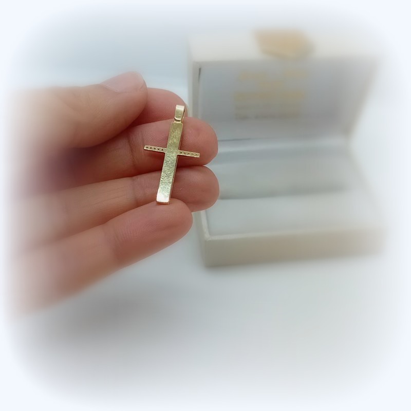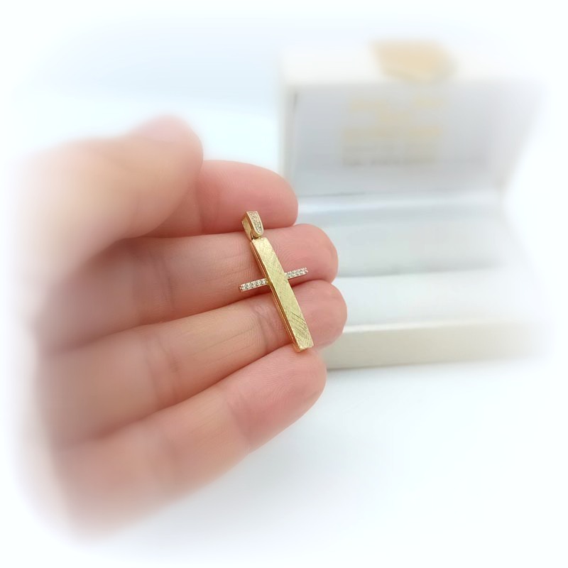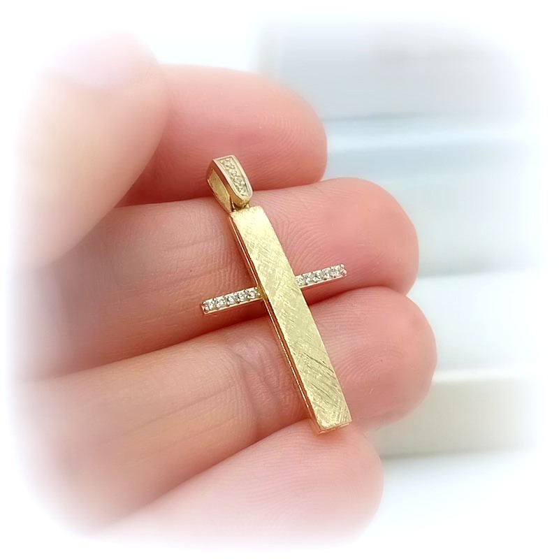 Με ξεχωριστό ιδιαίτερο design χρυσός σταυρός Κ9 , για εσένα που αγαπάς το μίνιμαλ στυλ, με ζαγρέ κάθετη επιφάνεια και οριζόντια εξαιρετικά λεπτεπίλεπτη πλευρά με διακριτικά ζιργκόν και με εντυπωσιακό μεγάλο κρίκο στολισμένο με ζιργκόν. ( η πίζω όψη είναι λαμπερή λουστρέ)
