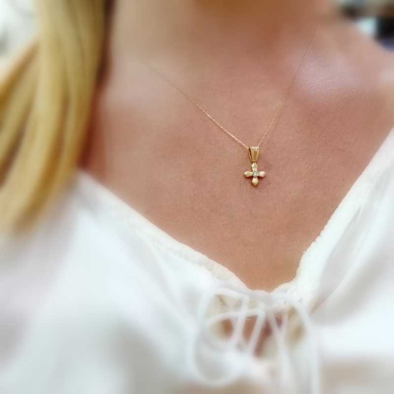 Για κάθε ηλικία διακριτικό χρυσό σταυρουδάκι 14 καρατίων με κομψό design και 1 μικρό ζιργκόν στο κέντρο.
