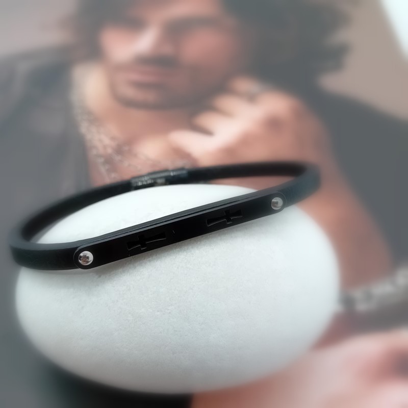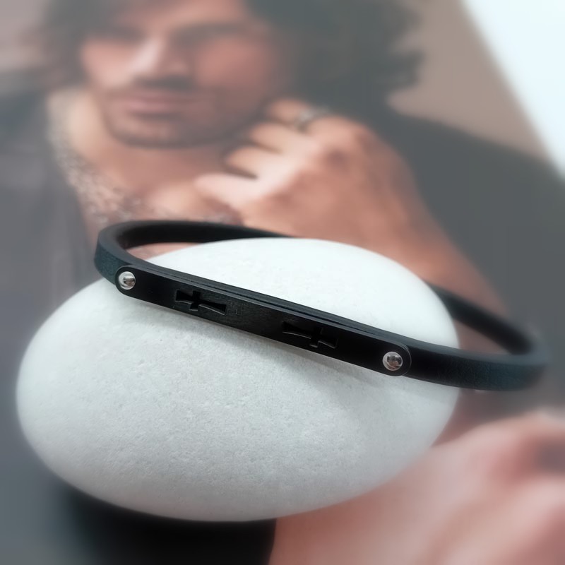 Αντρικό βραχιόλι διακριτικό από μαύρο δέρμα, λεπτό λουράκι με 2 σταυρούς διάτρητους επάνω σε μικρή πλακέτα από μαύρο ατσάλι και με κούμπωμα με μαγνήτη.