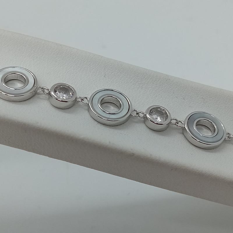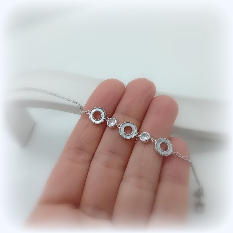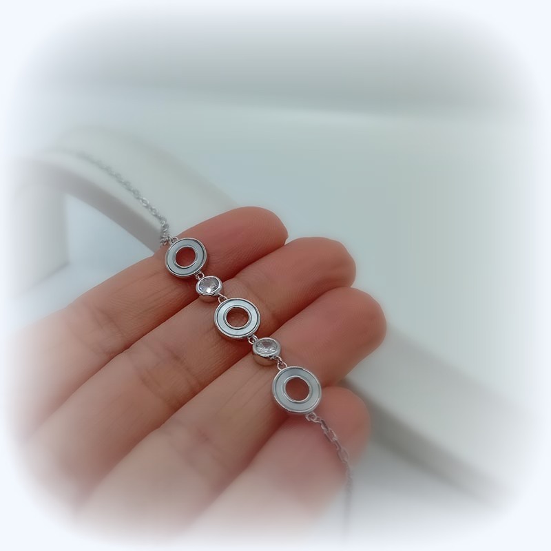 Μοντέρνας minimal αισθητικής βραχιόλι από ΑΣΗΜΙ 925! Στο κέντρο της αλυσίδας ξεχωρίζουν 3 διάτρητοι στρογγυλοί "δίσκοι" από φίλντισι και 2 μεγάλα λευκά ζιργκόν .
